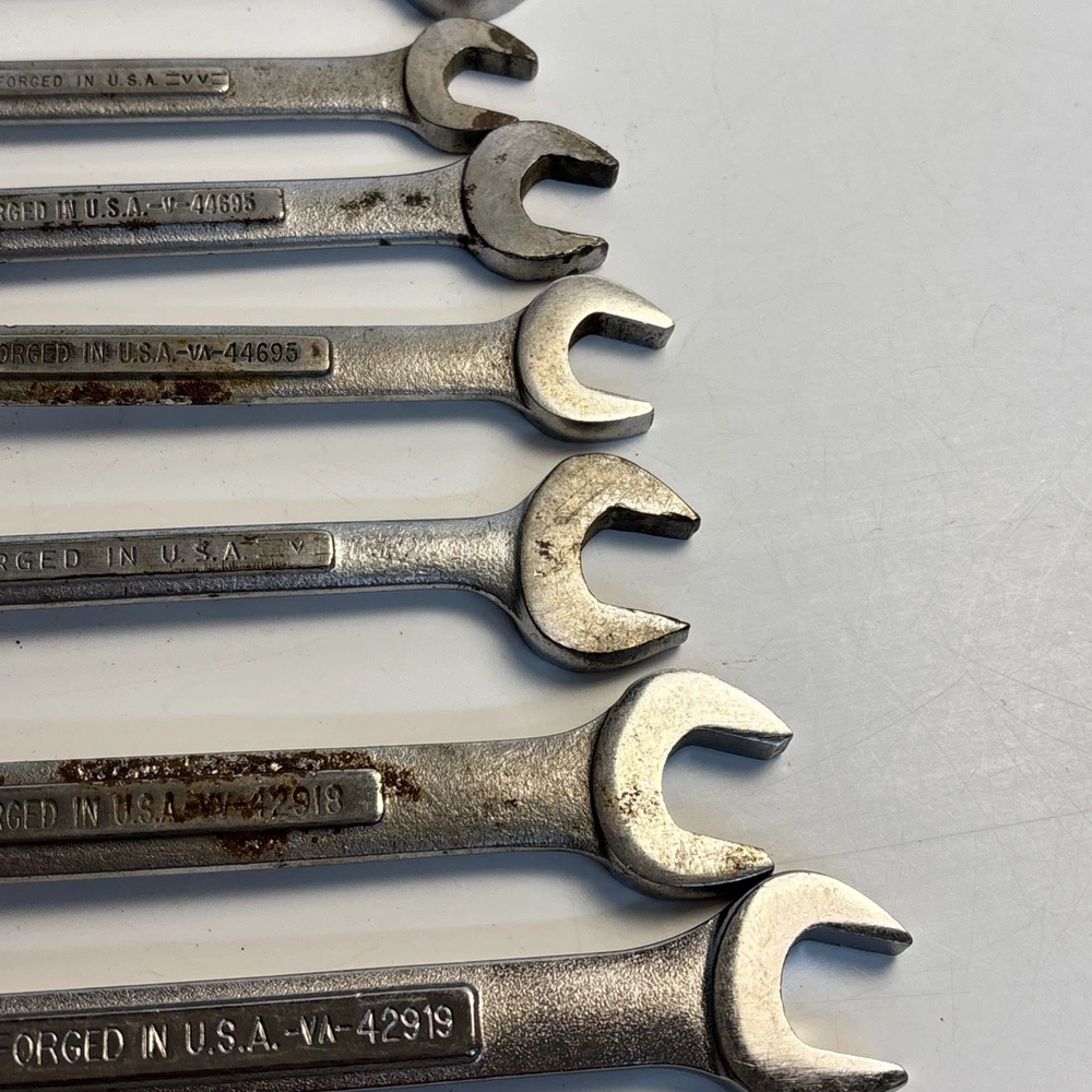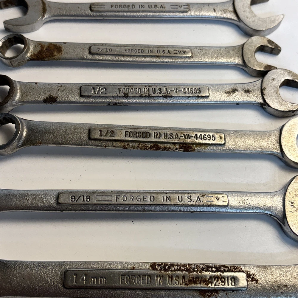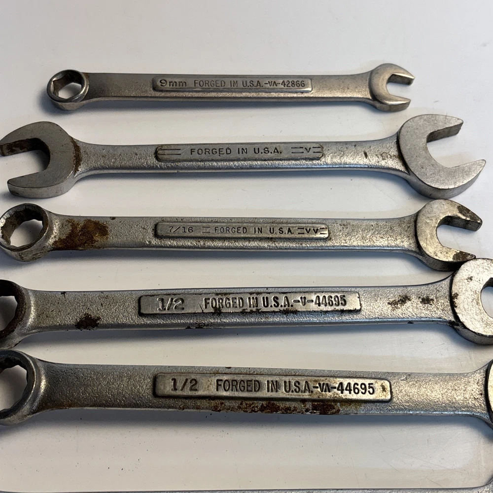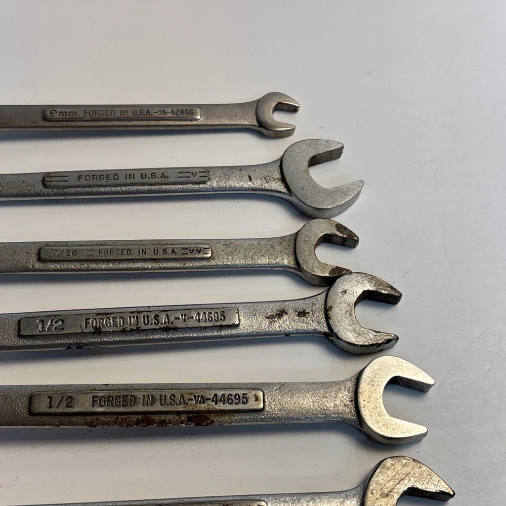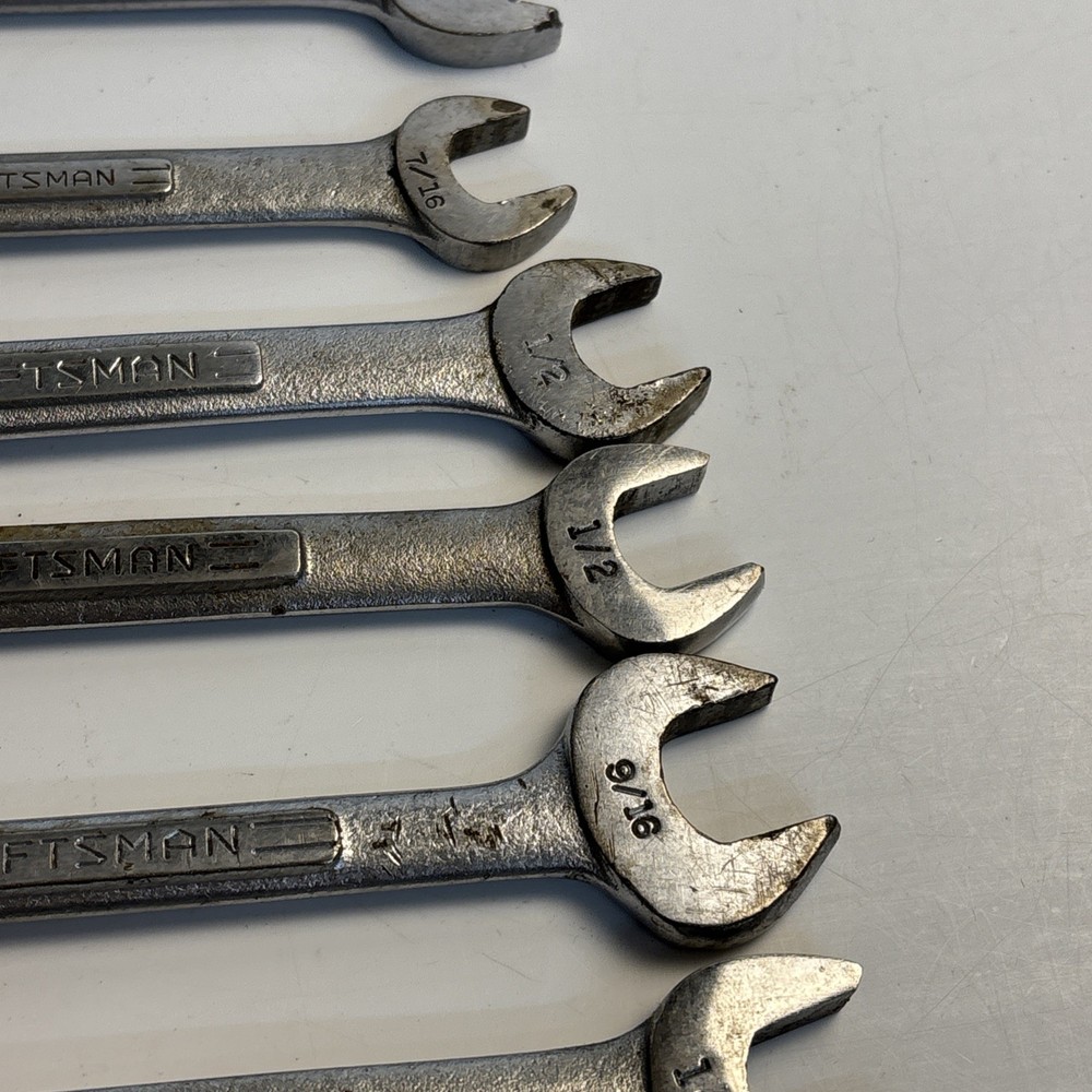 Lot of 8 vintage Craftsman wrenches made in the USA. Includes a mix of SAE and metric combination and open end wrenches. Sizes included: • 15mm combination • 14mm combination • 9mm combination • 9/16” combination • 1/2” combination (2) • 7/16” combination • 1/2” x 9/16” double open end wrench Condition: Shows typical vintage wear including surface rust, discoloration, and use marks. Some heavier rust on a few pieces. No visible cracks or major damage. See photos for complete details.