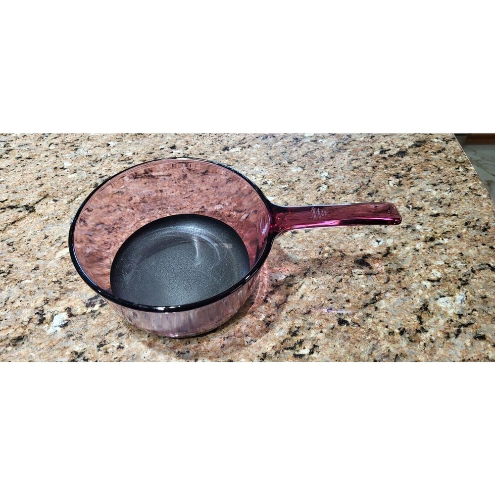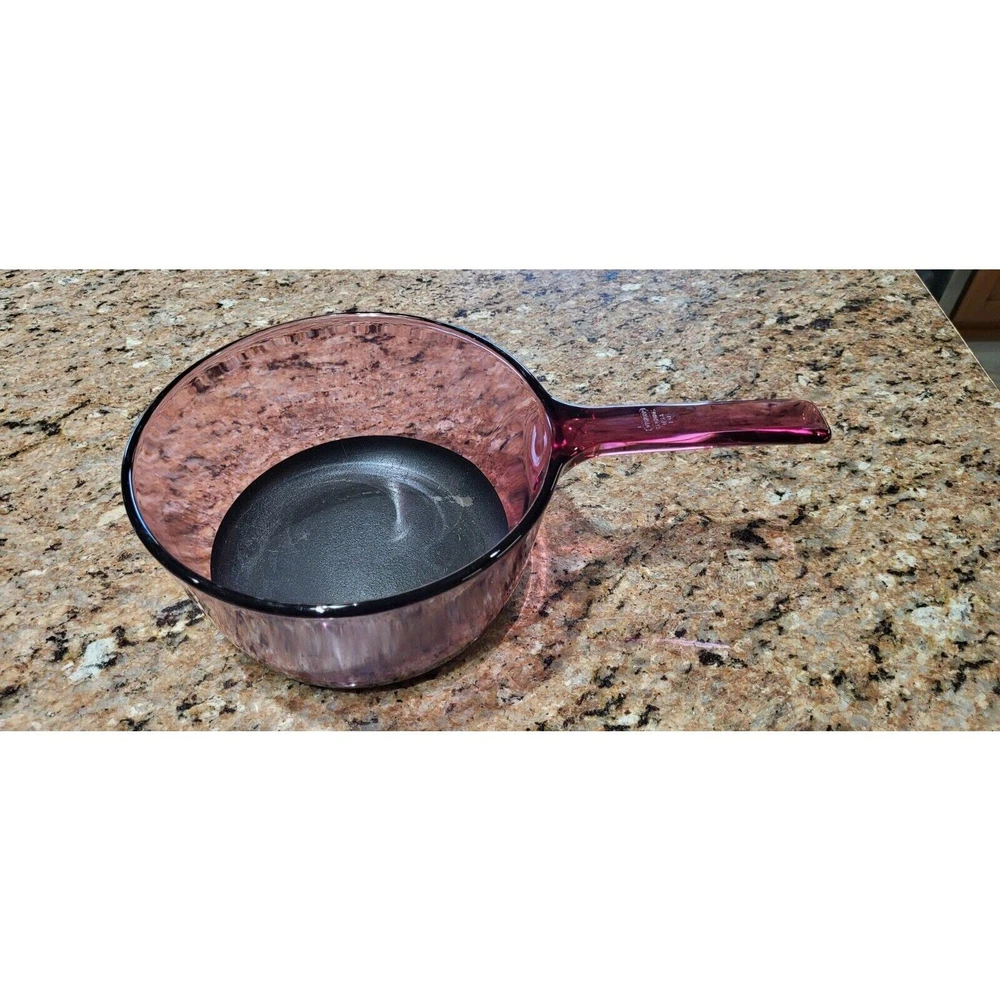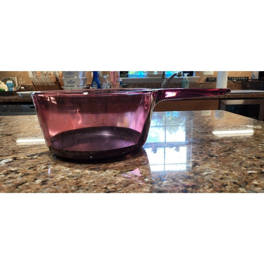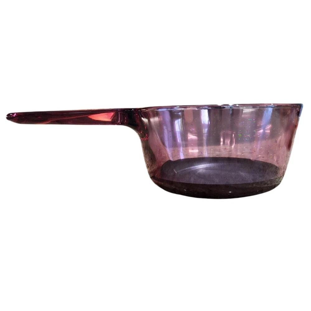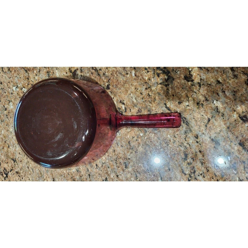 Add a pop of color to your kitchen with this Vintage Cranberry Visions Sauce Pan. Made by the renowned brand VISIONS, this casserole pan/pot has a 1.5-liter capacity and is perfect for cooking and serving sauces. Included is an amber color lid The set includes a non-stick surface coating that ensures easy cleaning. This original, licensed reproduction piece is compatible with all stove types. Its unique cranberry color adds a touch of elegance to your kitchen while its vintage design brings a classic touch to your collection. Don't miss out on this rare find! There are some halos in the teflon in the sauce pan from use. Please review the pictures for condition. Otherwise no chips or cracks! Add this to your collection today!