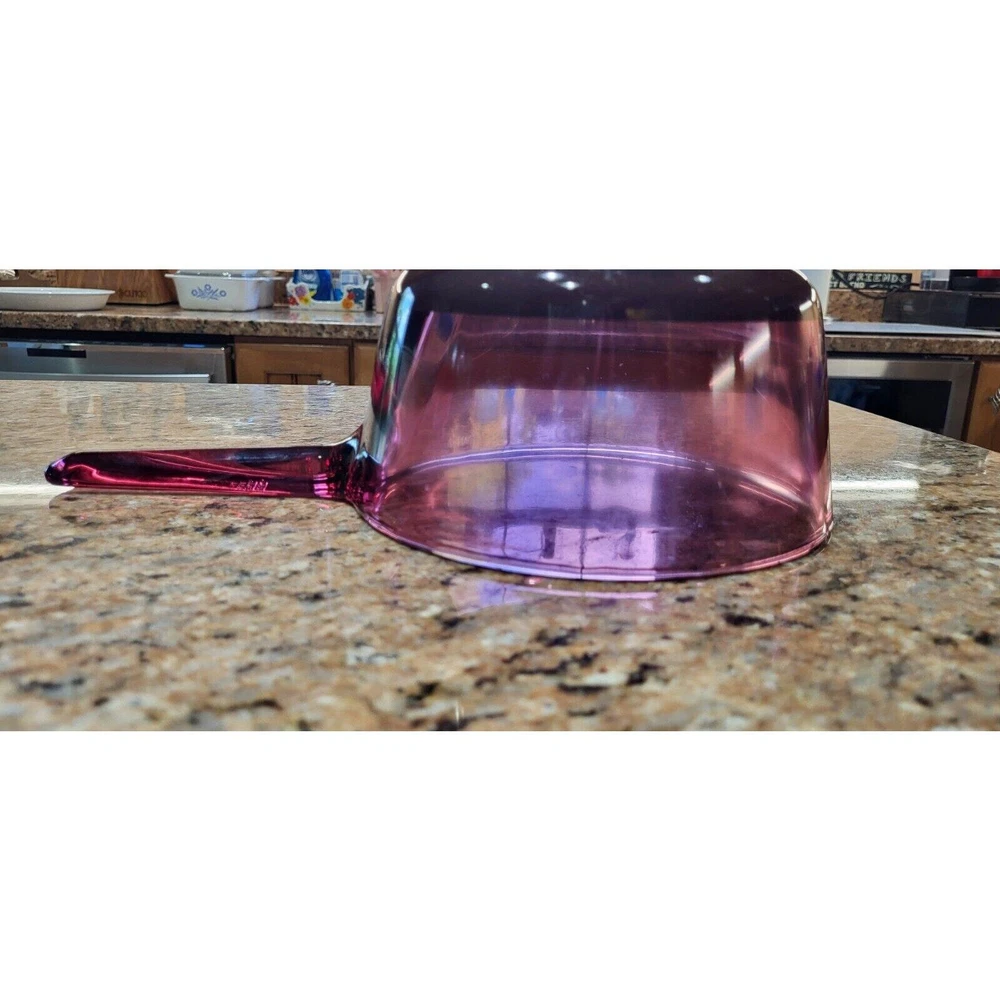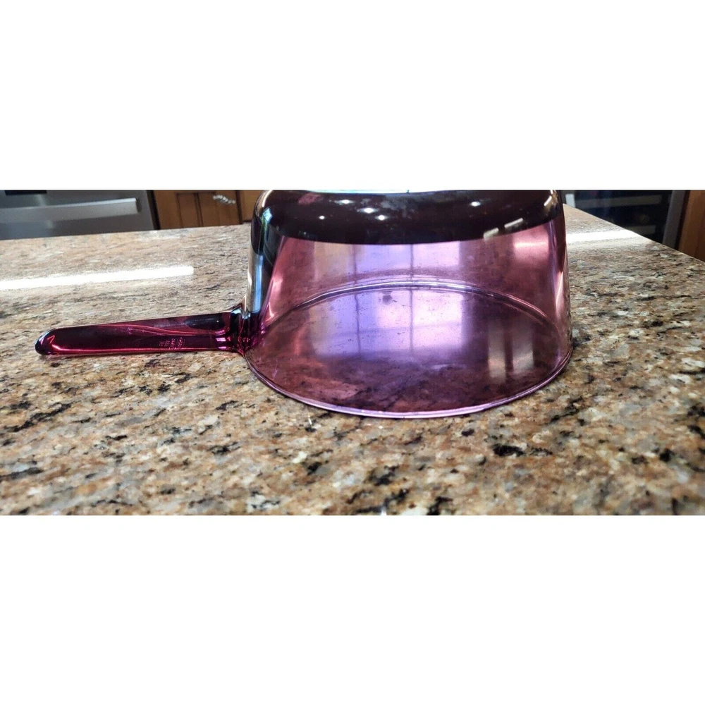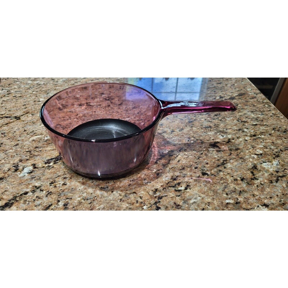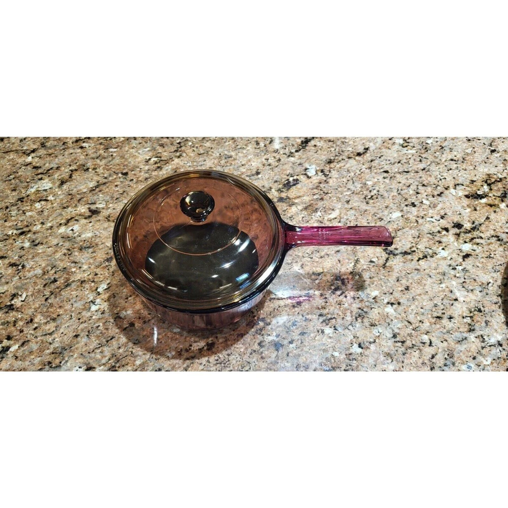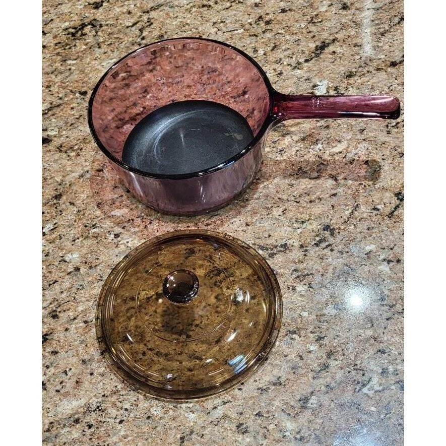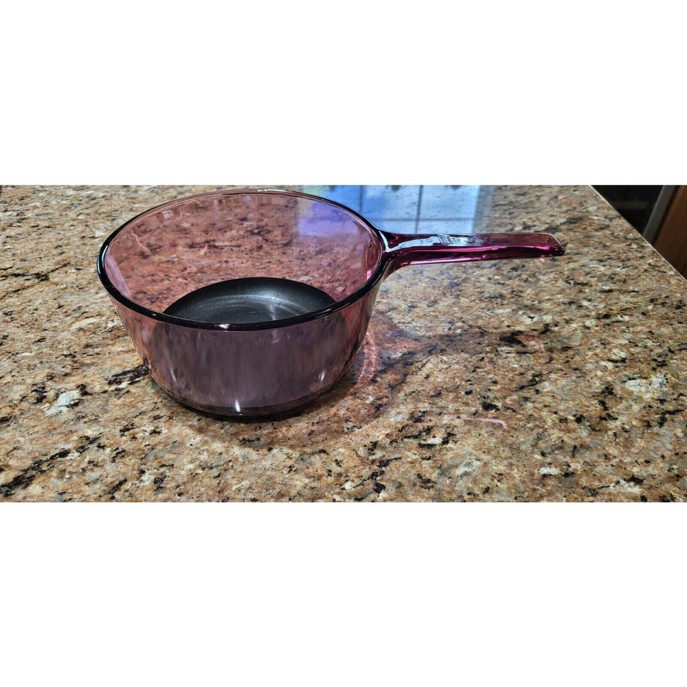 Add a pop of color to your kitchen with this Vintage Cranberry Visions Sauce Pan. Made by the renowned brand VISIONS, this casserole pan/pot has a 1.5-liter capacity and is perfect for cooking and serving sauces. Included is an amber color lid The set includes a non-stick surface coating that ensures easy cleaning. This original, licensed reproduction piece is compatible with all stove types. Its unique cranberry color adds a touch of elegance to your kitchen while its vintage design brings a classic touch to your collection. Don't miss out on this rare find! There are some halos in the teflon in the sauce pan from use. Please review the pictures for condition. Otherwise no chips or cracks! Add this to your collection today!