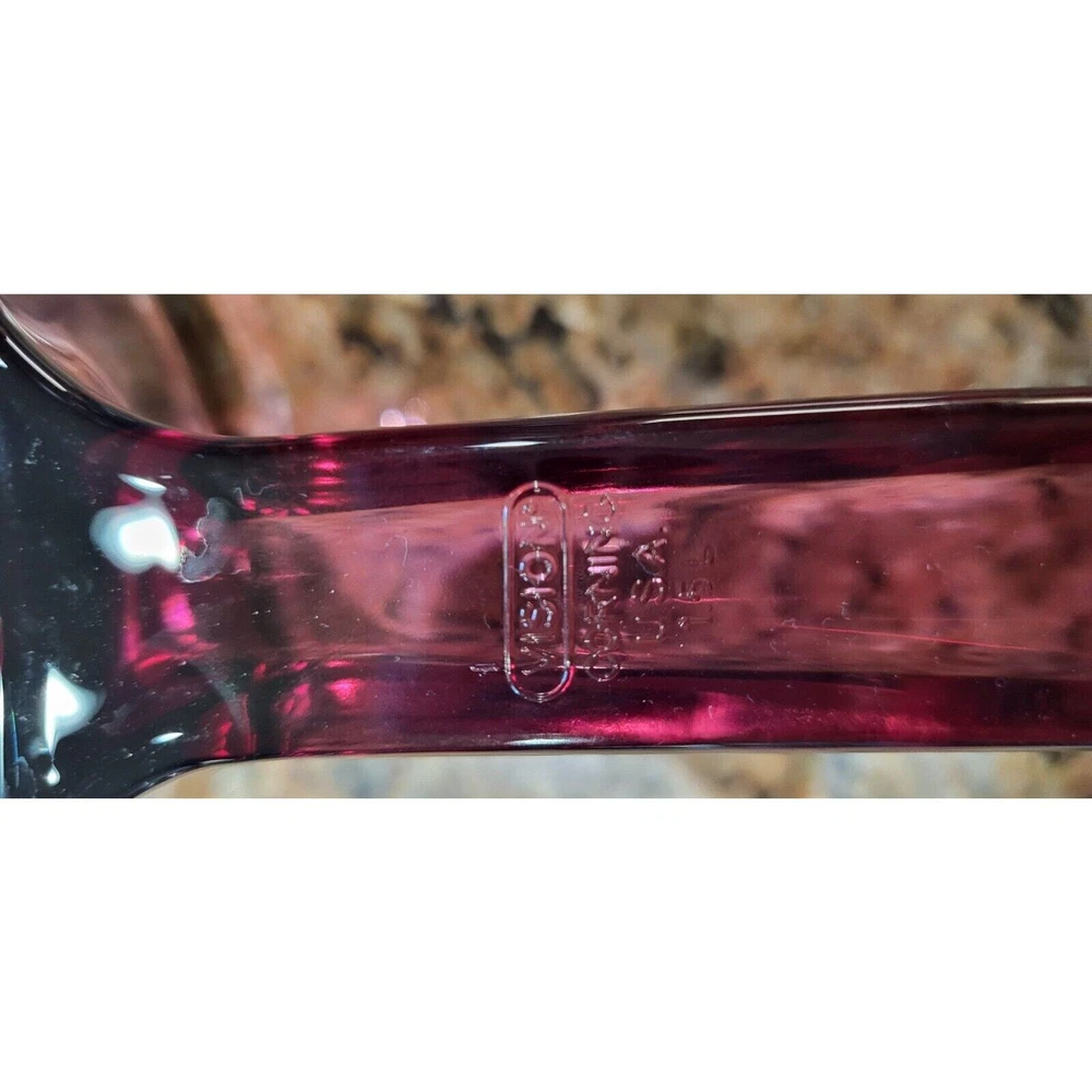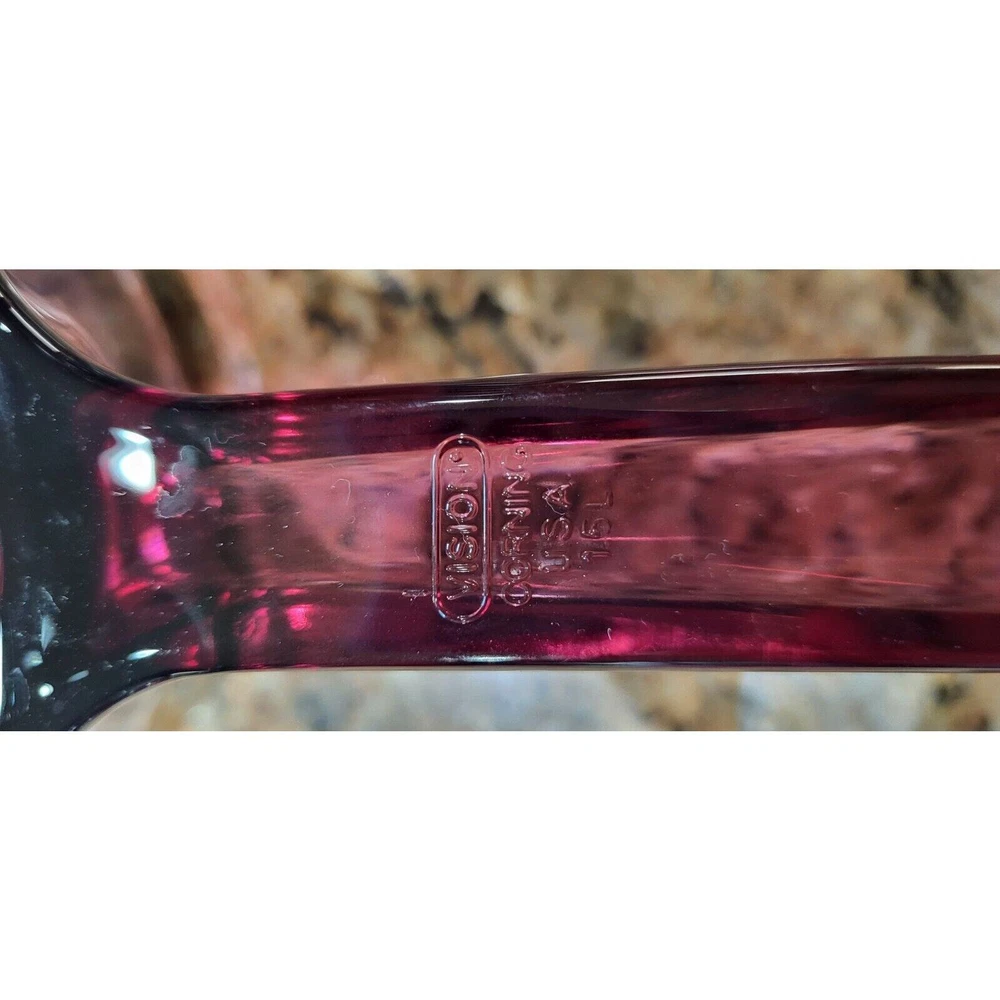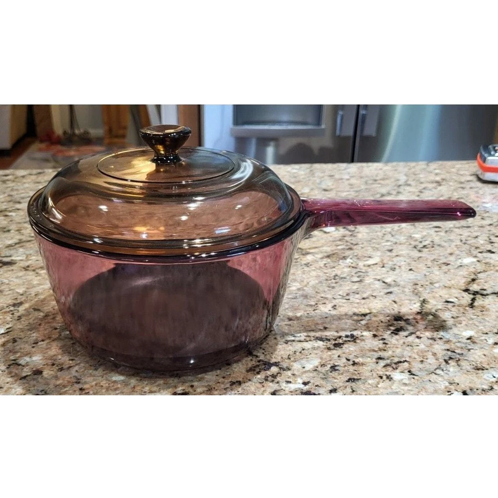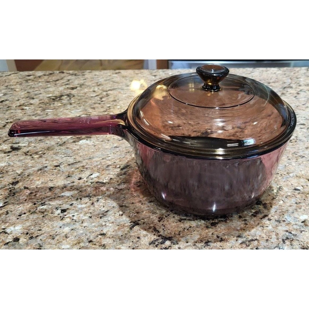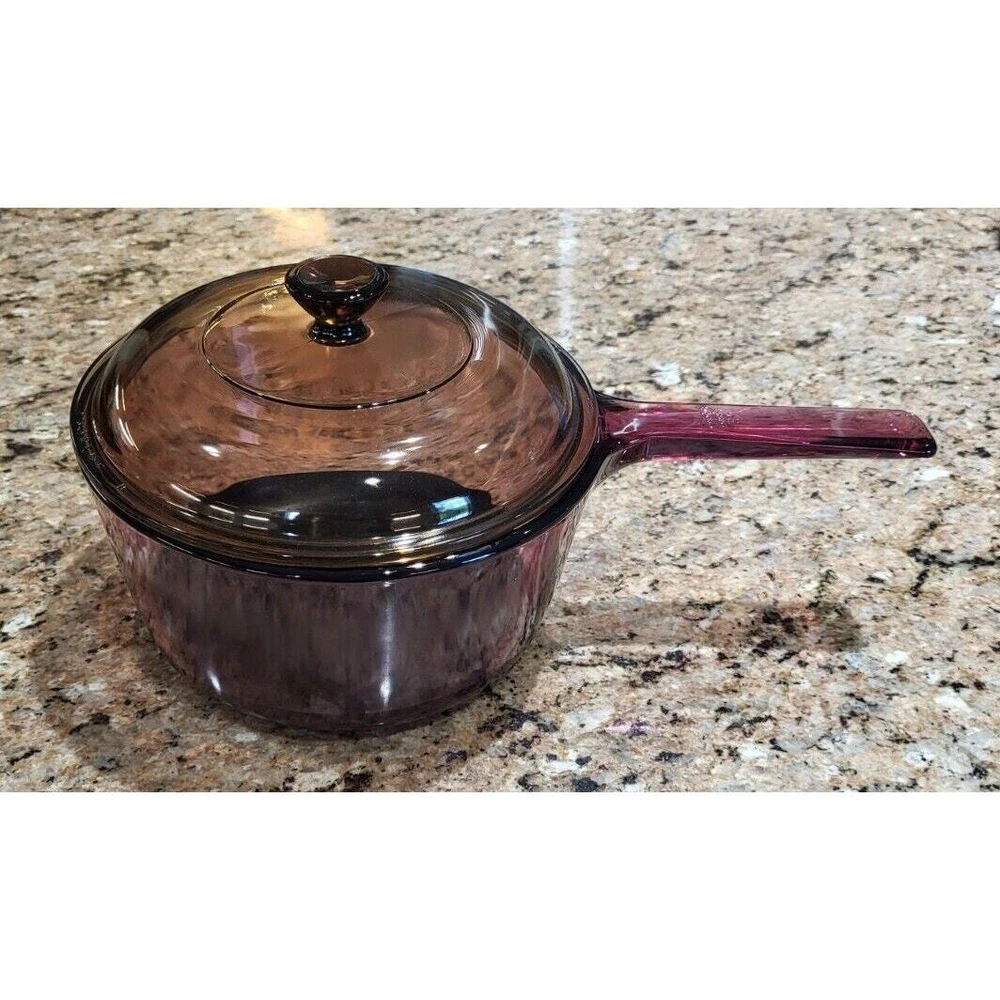 Add a pop of color to your kitchen with this Vintage Cranberry Visions Sauce Pan. Made by the renowned brand VISIONS, this casserole pan/pot has a 1.5-liter capacity and is perfect for cooking and serving sauces. Included is an amber color lid The set includes a non-stick surface coating that ensures easy cleaning. This original, licensed reproduction piece is compatible with all stove types. Its unique cranberry color adds a touch of elegance to your kitchen while its vintage design brings a classic touch to your collection. Don't miss out on this rare find! There are some halos in the teflon in the sauce pan from use. Please review the pictures for condition. Otherwise no chips or cracks! Add this to your collection today!