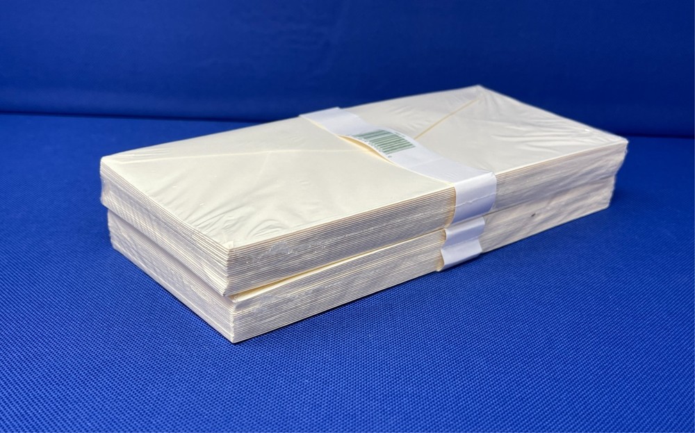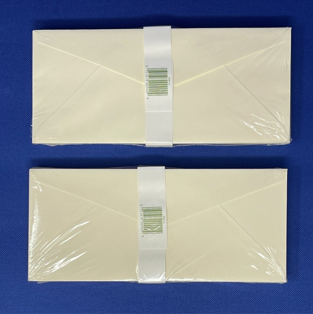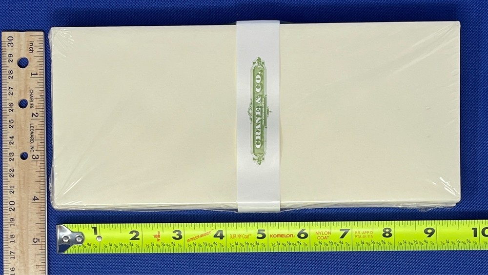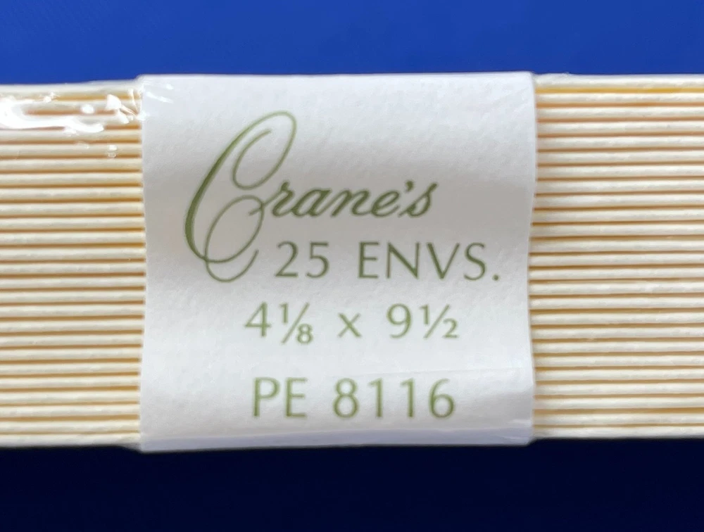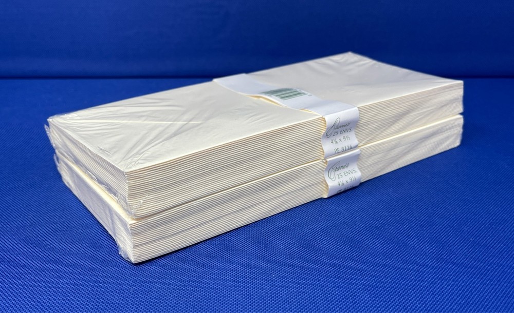Vintage Crane & Co. Kid Finish 100% Cotton Fiber Envelopes New Old Stock- Factory Sealed / Original Packaging Label Reads: PE8116. Size: 4-1/8" x 9-1/2" Envelopes per Pack: 25qty LOT of 2 Packs Envelope packs show very little handling and age wear. As with any vintage envelopes, the adhesive may be discolored and not 100% effective. I try my best to take good quality pictures so you can determine that the overall condition meets your requirements and expectations. Therefore, please zoom-in on photos to review the condition of the product. All sales are final—no returns accepted. Please note: Shipping carriers may experience delays. For any shipping-related inquiries, please contact the courier directly with the provided tracking number. Thank you!