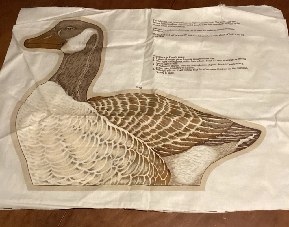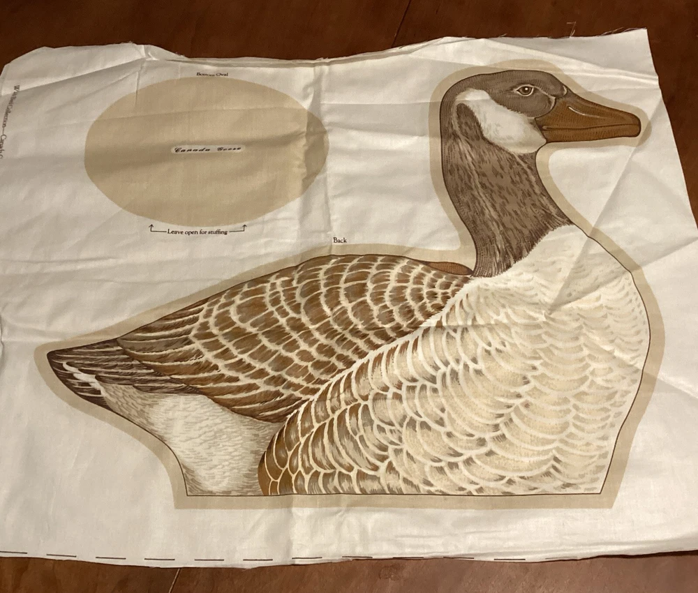 Vintage Cranston Print Works VIP fabric panel featuring a Canada Goose pattern in browns, beige, ivory, and yellow colors. The panel is made of 100% cotton and measures 17 7/8" x 45". Suitable for crafting or making pillows. Made in the United States.