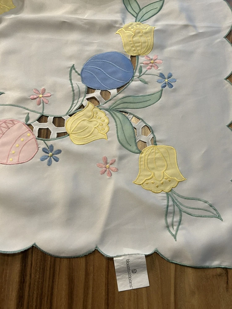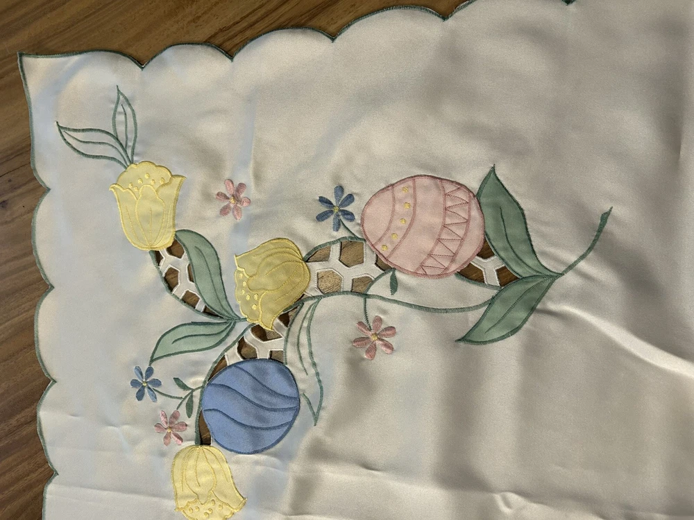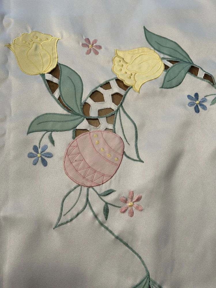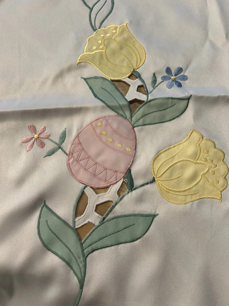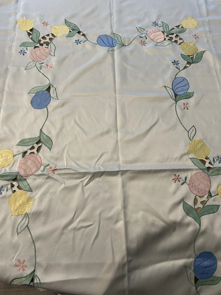 Number of Items in Set:1Handmade:NoItem Width:More Than 25 inMaterial:SatinTime Period Manufactured:1960-1969Item Length:71-90 inColor:CremeTheme:ClassicalPattern:DamaskFeatures:EmbroideredOriginal/Licensed Reproduction:OriginalShape:RectangleCountry/Region of Manufacture:UnknownStyle:1960sType:TableclothBrand:UnbrandedSize:MAntique:No