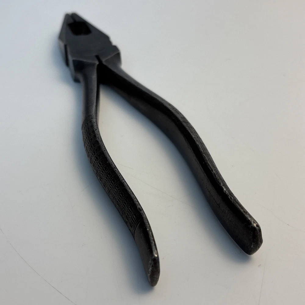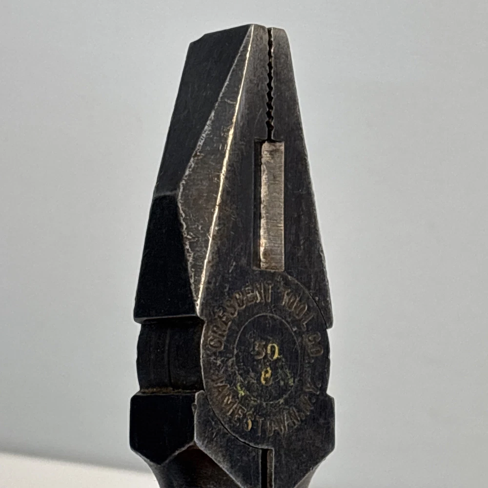 Crescent Tool Co. model 50-8 combination pliers marked Jamestown, New York USA. Forged steel construction with integrated gripping jaws, pipe grip section, and cutting edges near the pivot. Original cross-hatch grip texture on the handles. Markings are visible at the pivot. Condition Used vintage condition. Surface wear, darkened patina, and light pitting from age and use. Teeth and cutters show use but remain intact. No visible cracks or repairs.