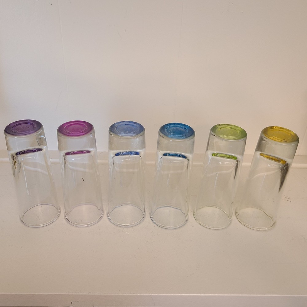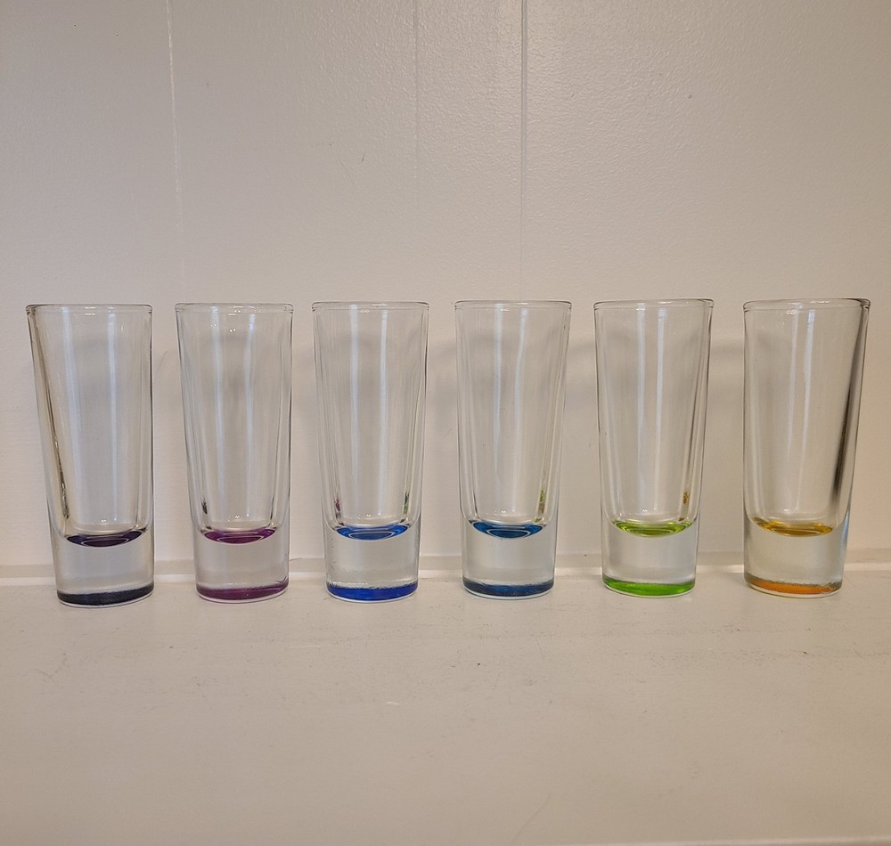 Set Of 6 Vintage Crisa Rainbow Color Bottom Shot Glasses 2oz. 4in tall. Please take a look at all of the pictures of this item for its actual condition. No chips or cracks. I do combine shipping.