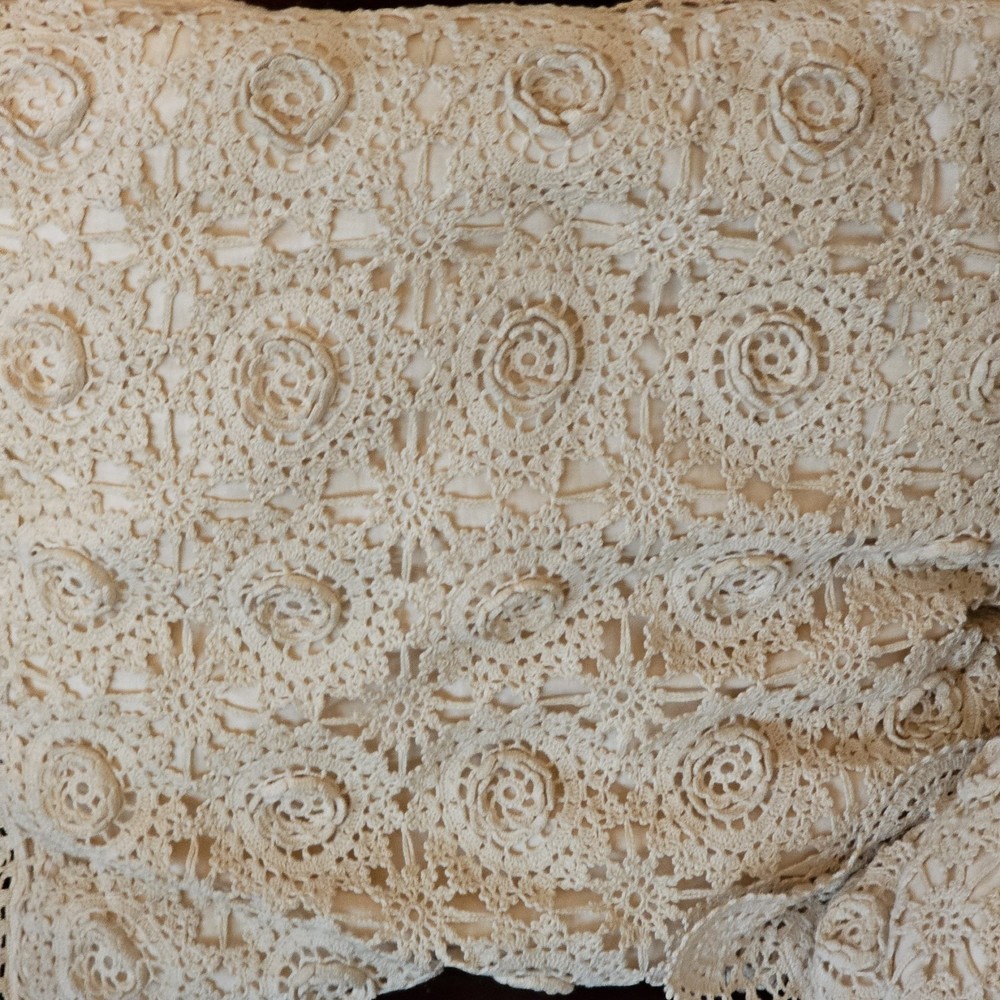 This is a set of two Vintage Crochet Lace Throw Accent Pillows in a Square shape measuring 16 x 16 inches. The pillows feature a Floral pattern in Beige color with a Cottagecore theme. Made of 100% Cotton lace material, they have a vintage/retro style and textured design. The pillows are bordered and 3D, suitable for indoor use and machine washable. Perfect for adding a Grannycore or romantic touch to any room. There is a stain on the back of one that I have not tried to clean. Sold as is
