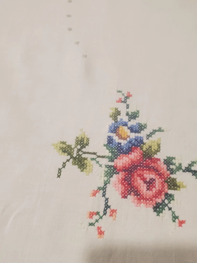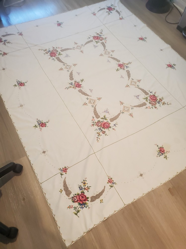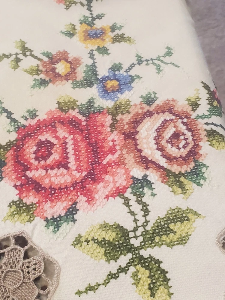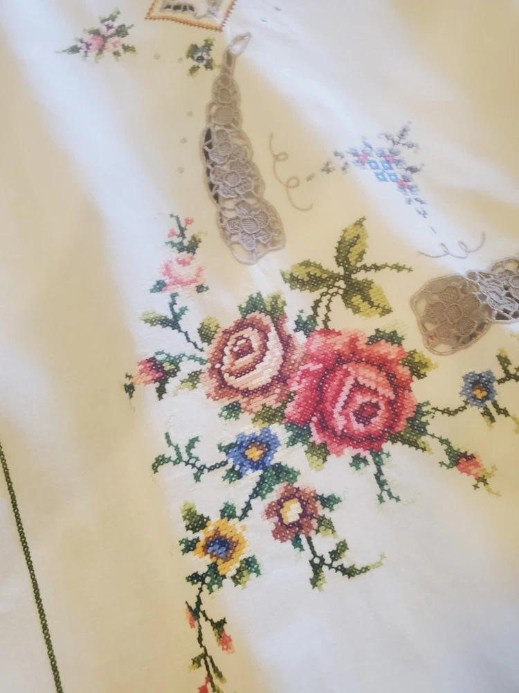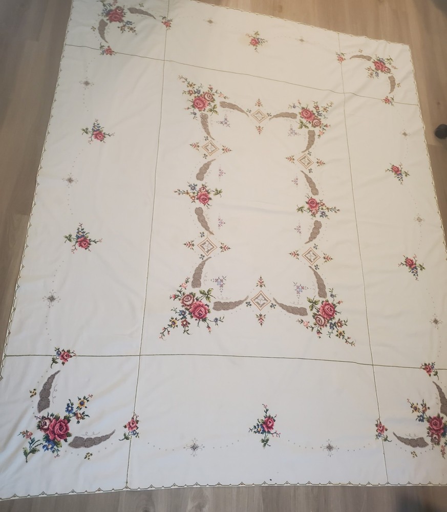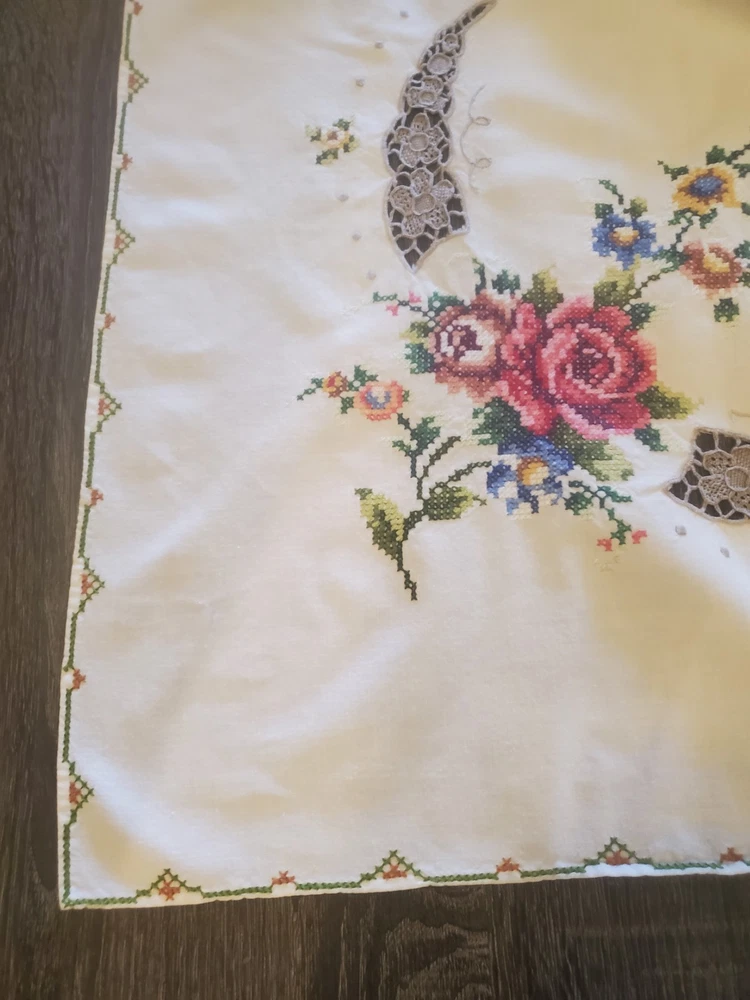 This is a stunning, vintage, handmade tablecloth featuring intricate cross-stitch and crochet lace work. The craftsmanship is exceptional, representing countless hours of meticulous hand-stitching. The beautiful floral design includes embroidered borders and handmade inlay lace work. The large size, measuring 82" by 68", makes it a perfect statement piece for a dining room or special occasion table. Please note that as a vintage item, there are some signs of age. There are a few faint stains, which have been highlighted in the product photos. Additionally, there is one tiny hole, which is also pointed out in the pictures for full transparency. Despite these minor imperfections, the tablecloth remains a beautiful and unique piece of textile art. This is a true treasure for collectors of vintage linens and handmade embroidery. Features Material: It appears to be a linen or cotton blend. Measurements: 82" (length) x 68" (width) Craftsmanship: Hand-embroidered cross-stitch, hand-stitched borders, and handmade crochet lace inlay. Condition: Pre-owned vintage condition with faint stains and a tiny hole (see photos for details).