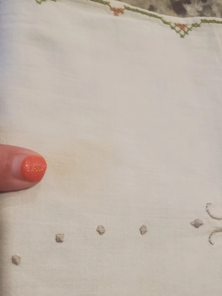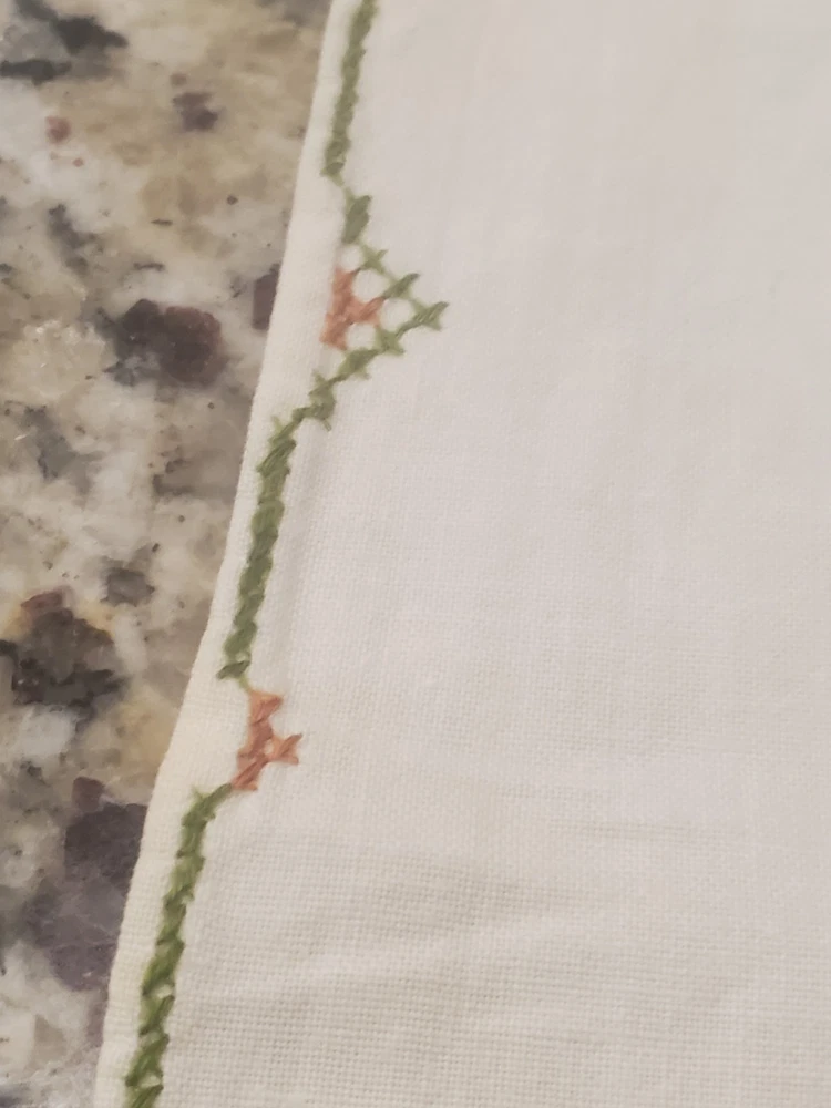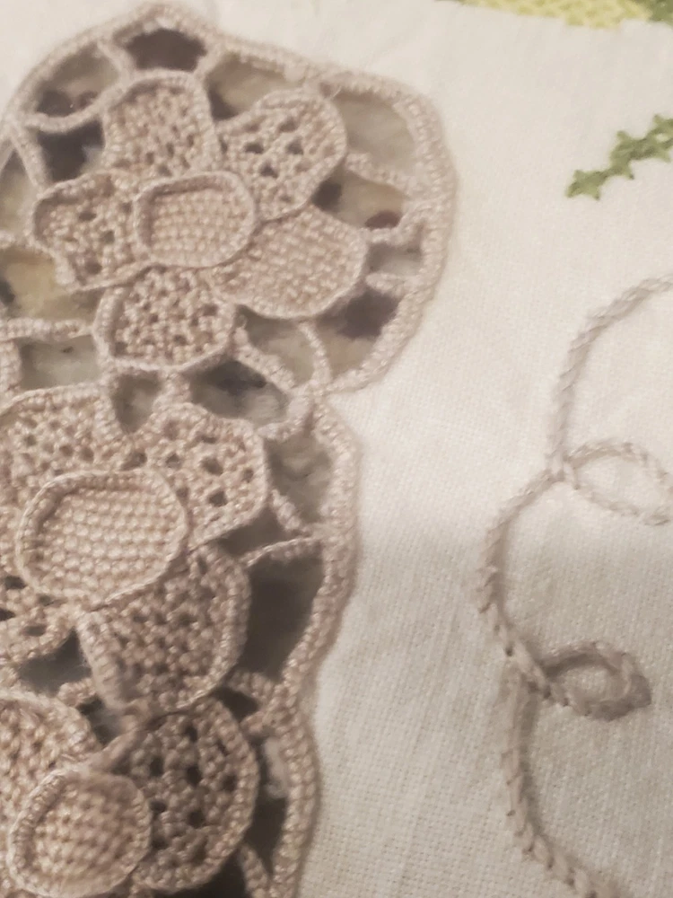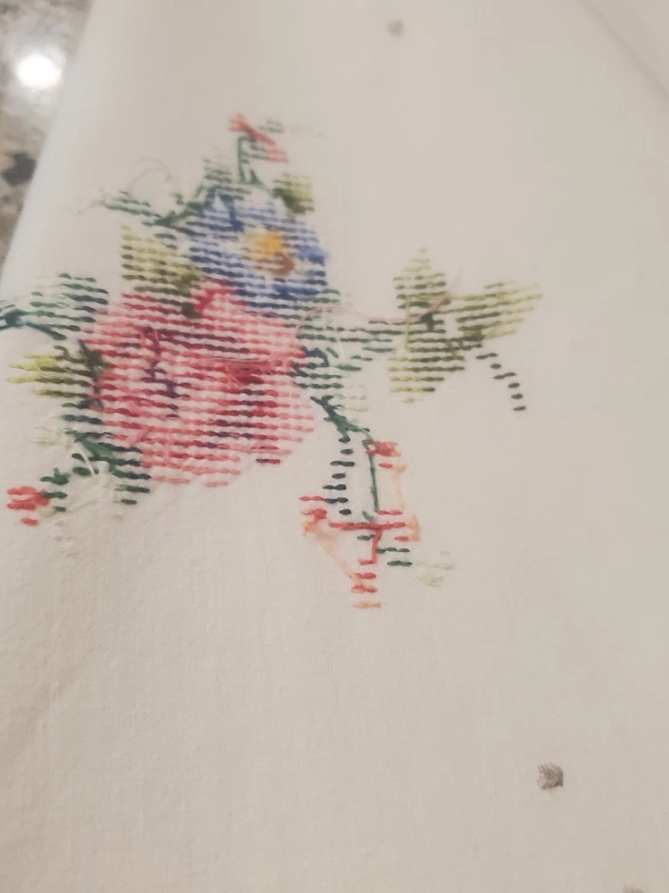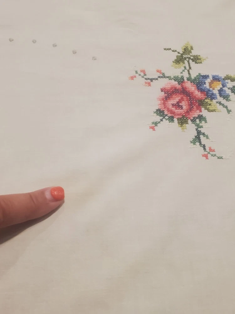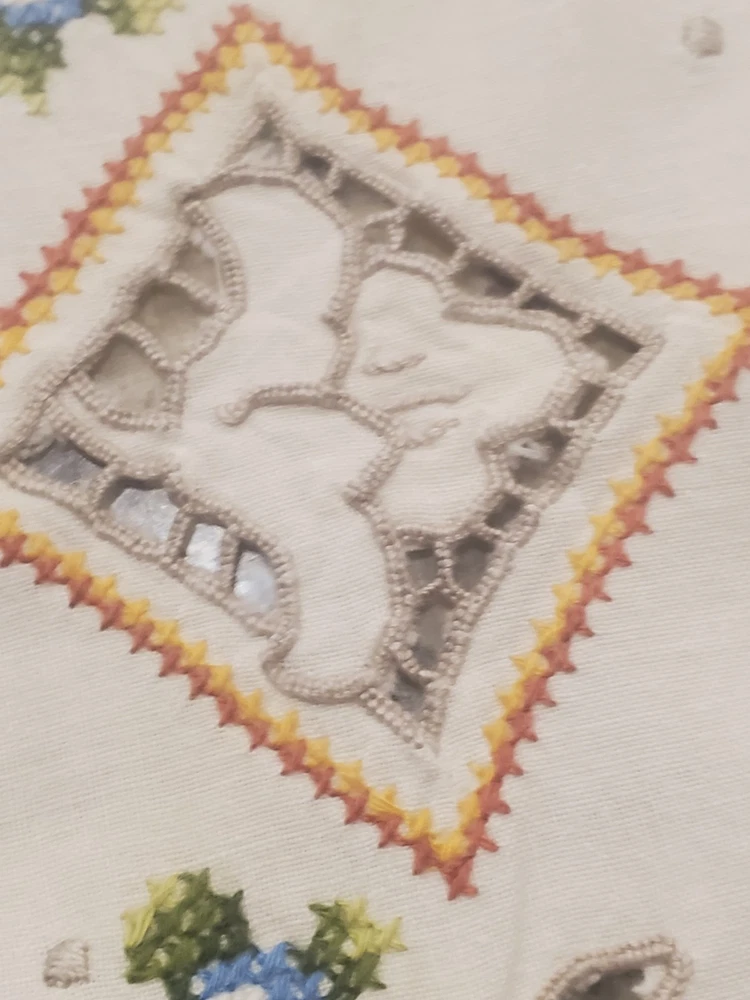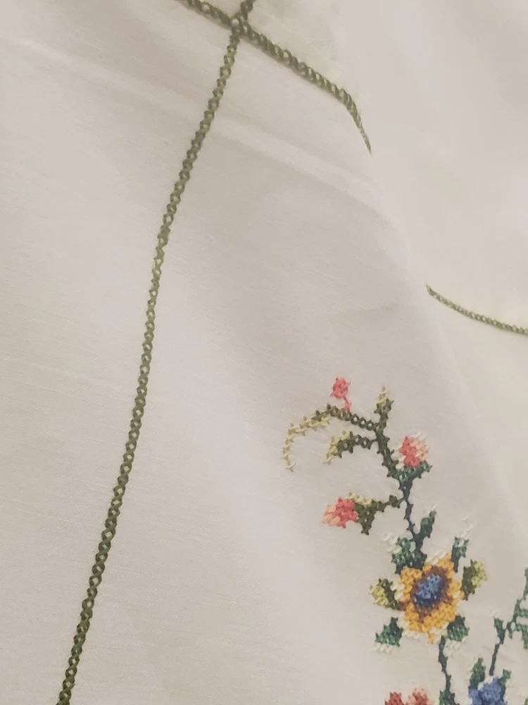 This is a stunning, vintage, handmade tablecloth featuring intricate cross-stitch and crochet lace work. The craftsmanship is exceptional, representing countless hours of meticulous hand-stitching. The beautiful floral design includes embroidered borders and handmade inlay lace work. The large size, measuring 82" by 68", makes it a perfect statement piece for a dining room or special occasion table. Please note that as a vintage item, there are some signs of age. There are a few faint stains, which have been highlighted in the product photos. Additionally, there is one tiny hole, which is also pointed out in the pictures for full transparency. Despite these minor imperfections, the tablecloth remains a beautiful and unique piece of textile art. This is a true treasure for collectors of vintage linens and handmade embroidery. Features Material: It appears to be a linen or cotton blend. Measurements: 82" (length) x 68" (width) Craftsmanship: Hand-embroidered cross-stitch, hand-stitched borders, and handmade crochet lace inlay. Condition: Pre-owned vintage condition with faint stains and a tiny hole (see photos for details).