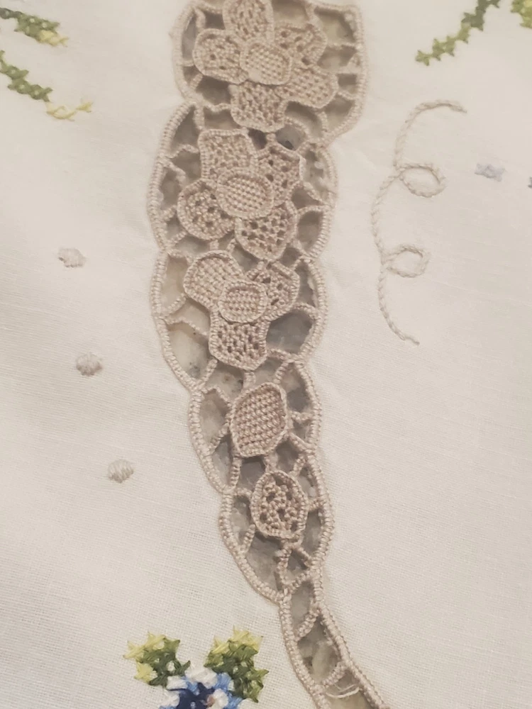 $ 51.75Vintage Battenberg Lace and Floral Embroidered Cotton Tablecloth Cream Shabby
