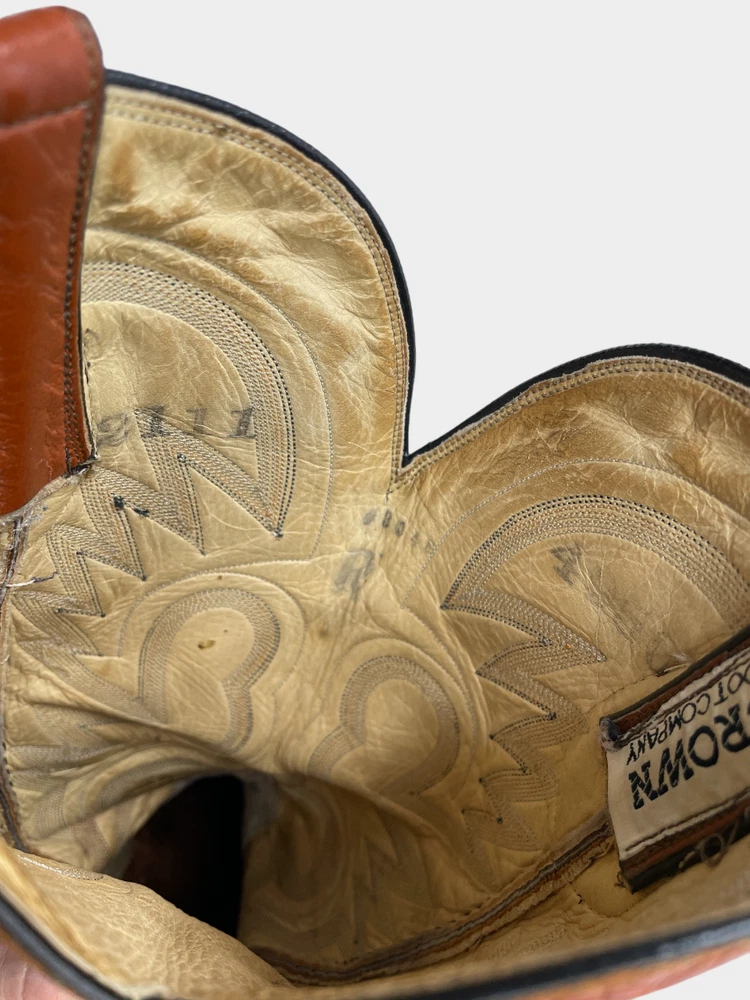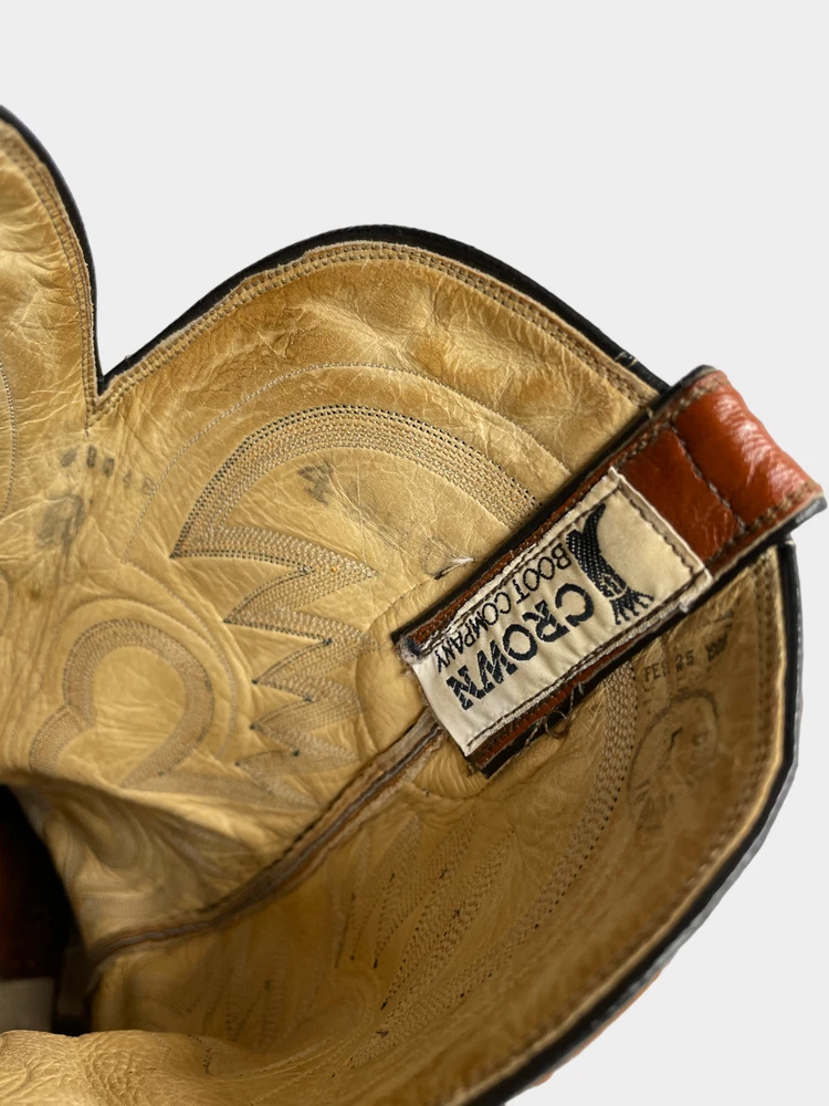 Model: 4804R Toe Shape: Almond Toe Shoe Width: Standard Type: Boot Vintage: Yes Color: Brown Theme: Biker, Cowboy, Motorcycle, Western Features: Comfort Pattern: Western Closure: Pull On Department: Men Upper Material: Leather Brand: Crown Boot Company Accents: Embroidered US Shoe Size: 8 Style: Western