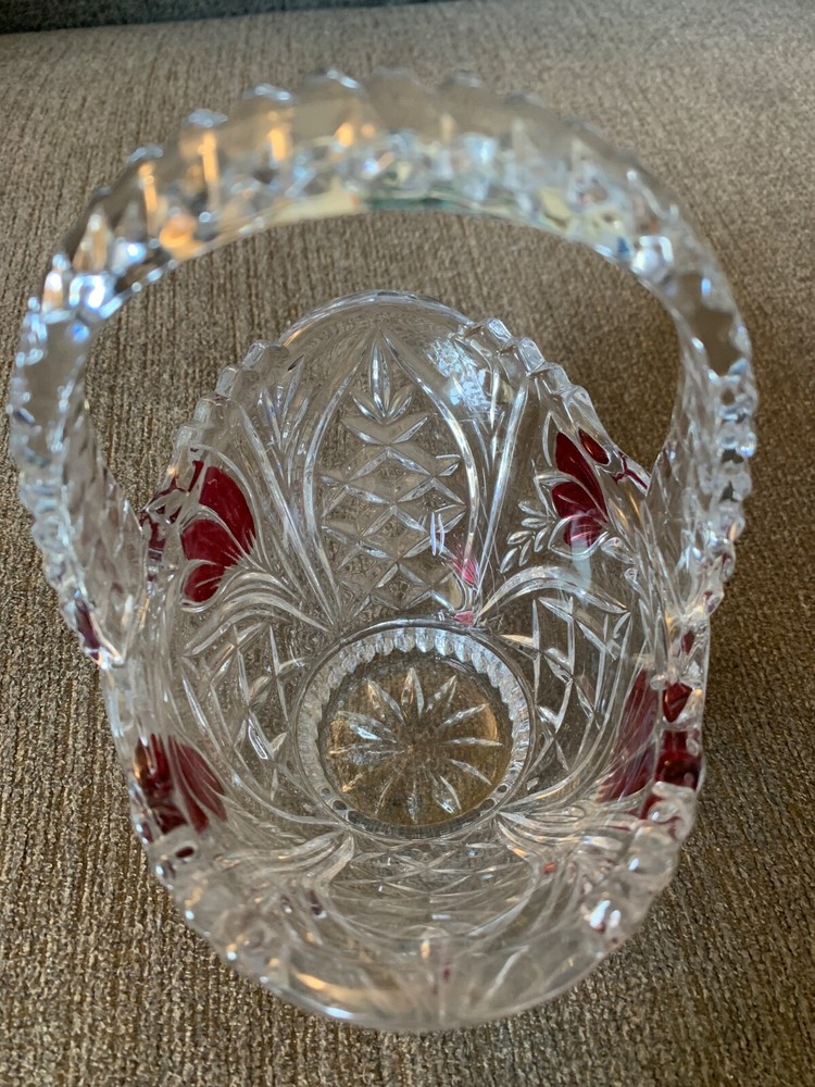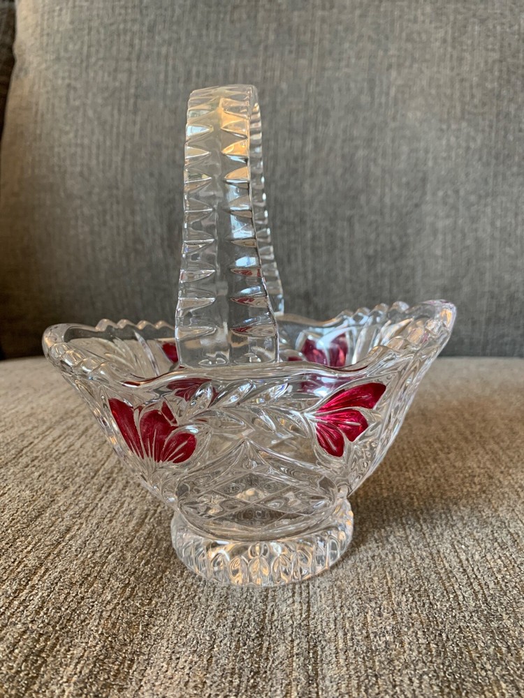 The vintage crystal candy/bonbon dish is oval-shaped, made of clear crystal, and ideal for displaying candies. It is perfect for adding a touch of elegance to your table setting or home decor.