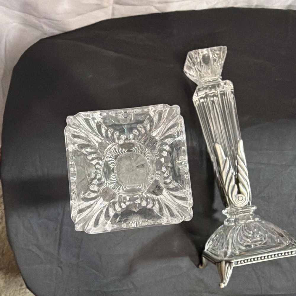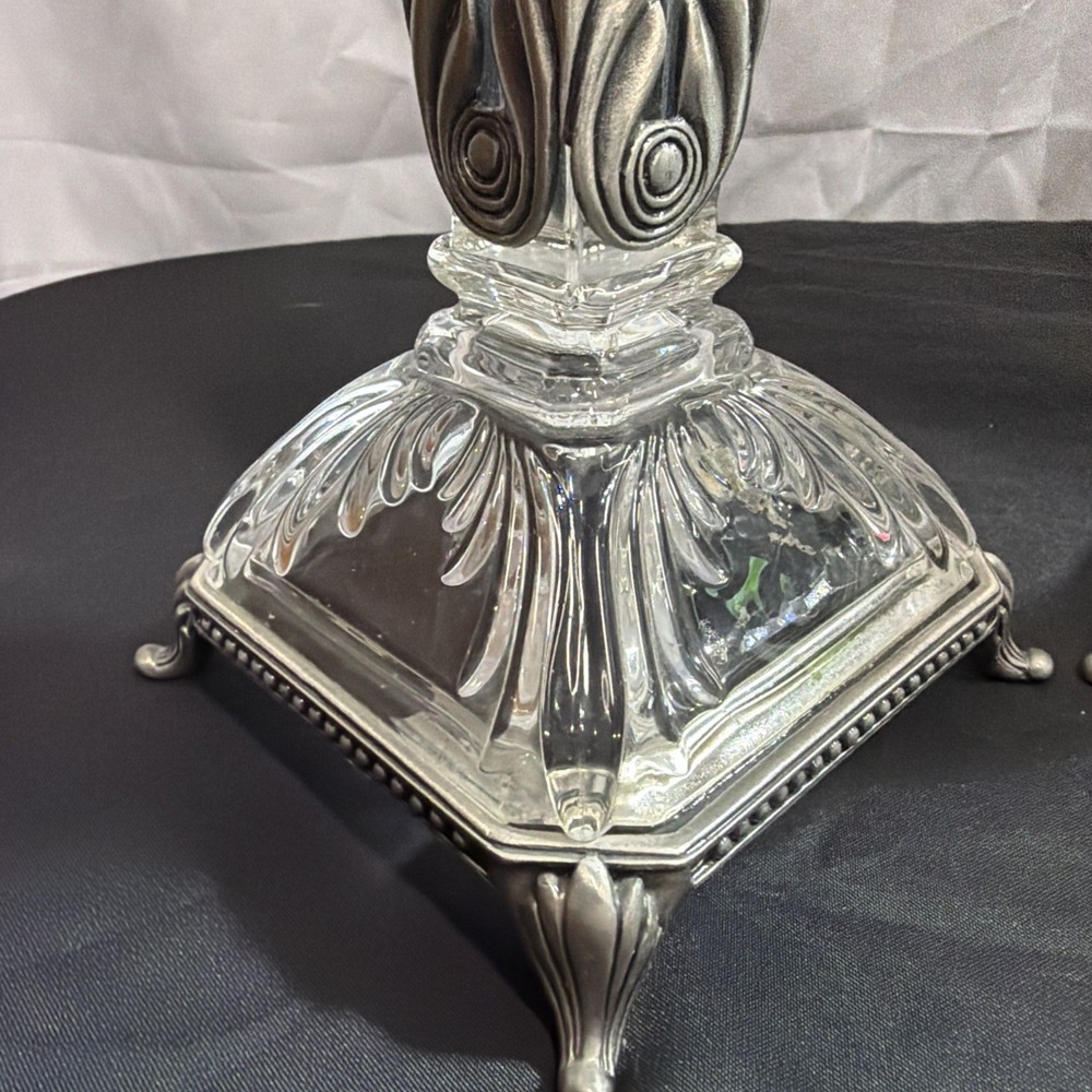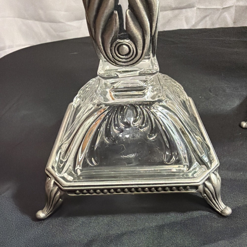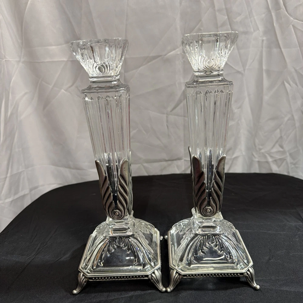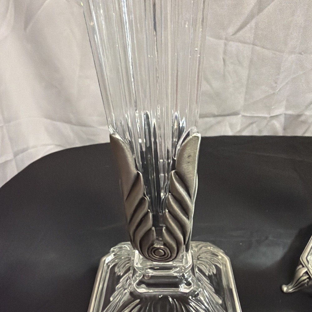 This Vintage Crystal Candlestick Heavy Crystal set features gorgeous lines and metal accents, embodying the mid-century modern and Art Deco styles. The elegant design adds a touch of sophistication to any space, making it a perfect decorative collectible for those who appreciate vintage charm and intricate details. These candle holders are not only functional but also serve as stunning statement pieces in any room.