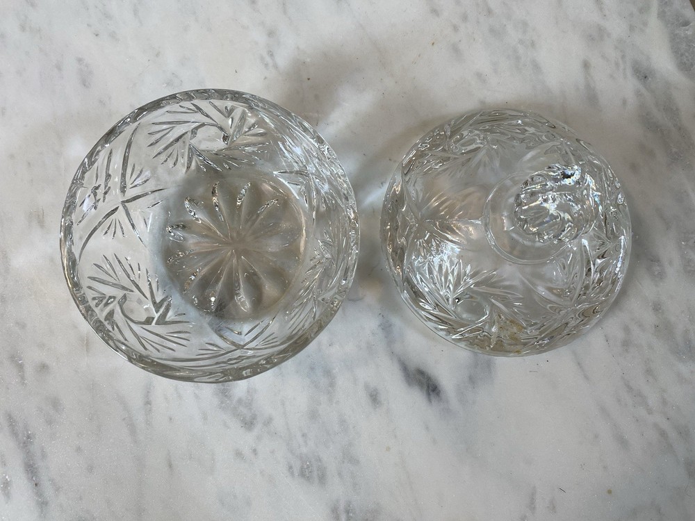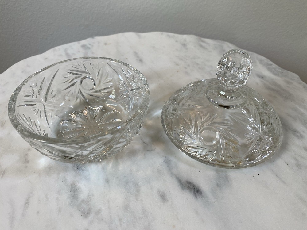 This vintage crystal candy dish with a lid features a beautiful pinwheel star pattern, adding a touch of elegance to any table setting or display. The clear crystal material gives it a luxurious look, while the 4 1/2" size makes it perfect for serving candies or other small treats. The unmarked brand adds to its vintage charm, making it a unique and timeless piece for any collection.