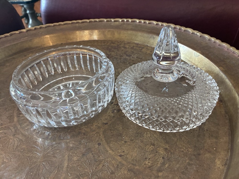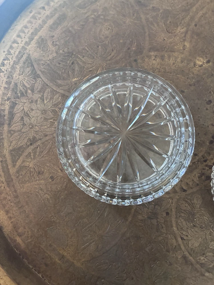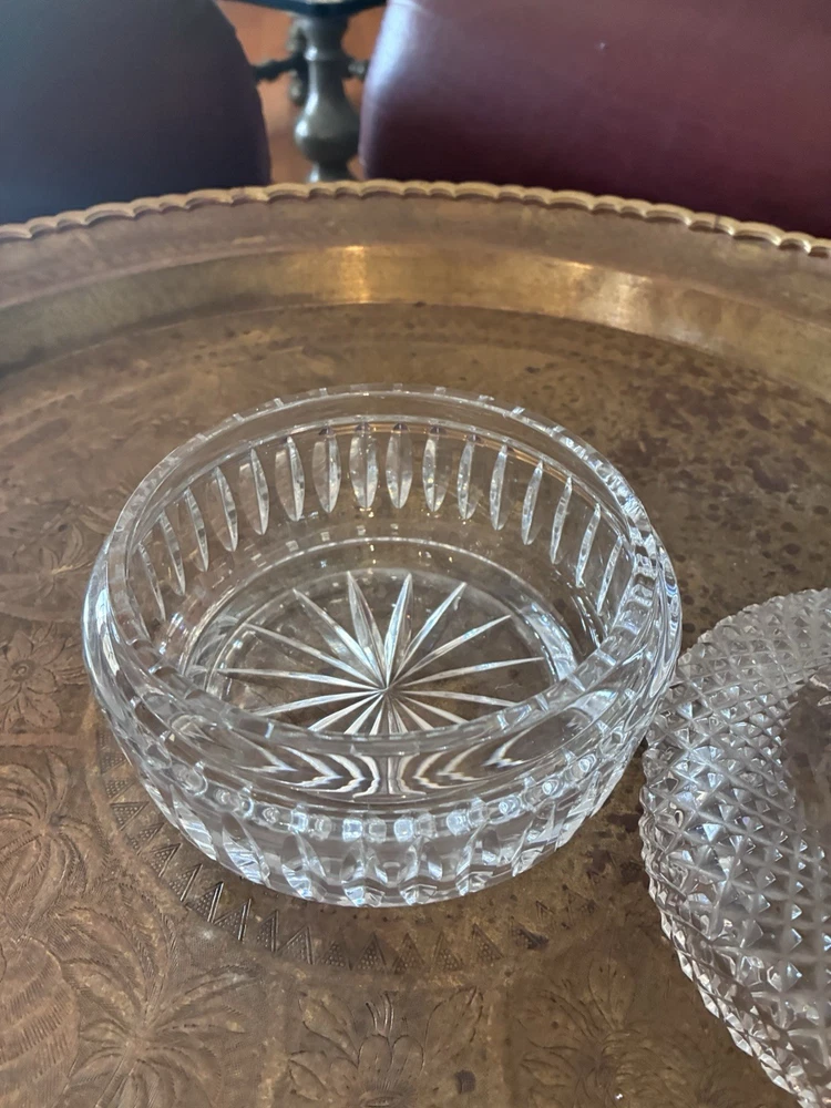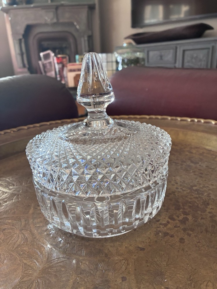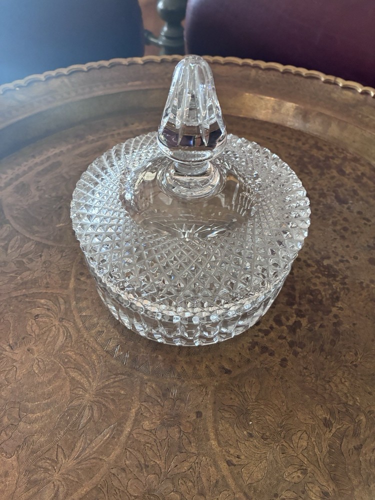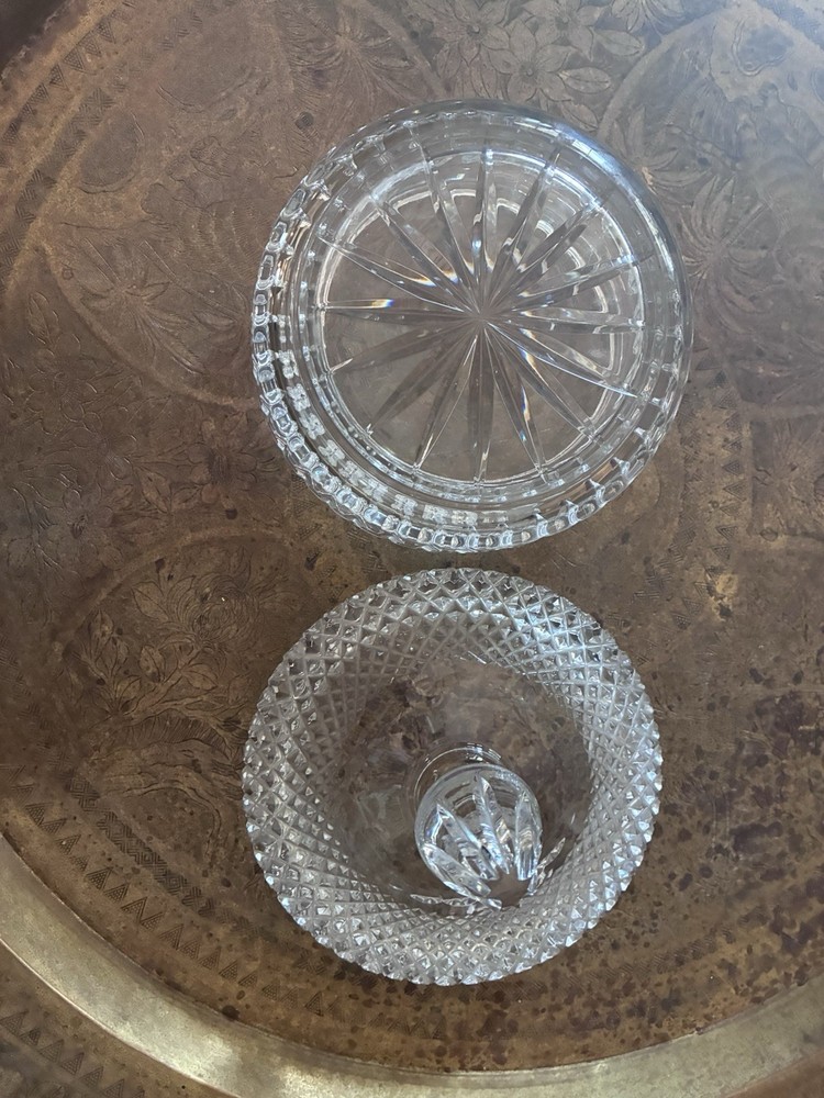 This vintage crystal candy/nut dish with lid exudes a mid-century modern style with its clear glass design. Perfect for serving candies or nuts, this decorative collectible adds a touch of elegance to any room with its timeless appeal. Made of glass, this piece showcases the beauty and sophistication of a bygone era, making it a unique and stylish addition to any collection.