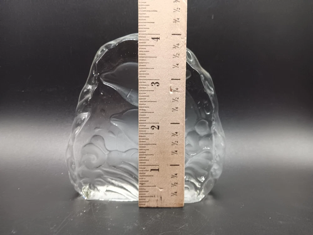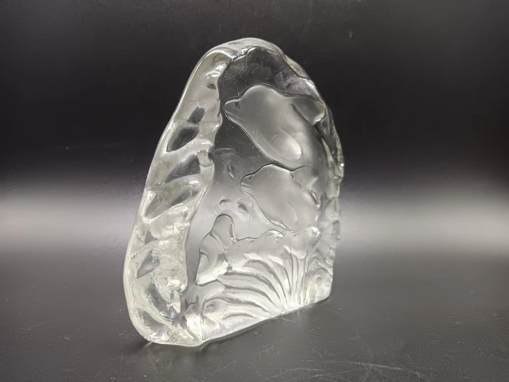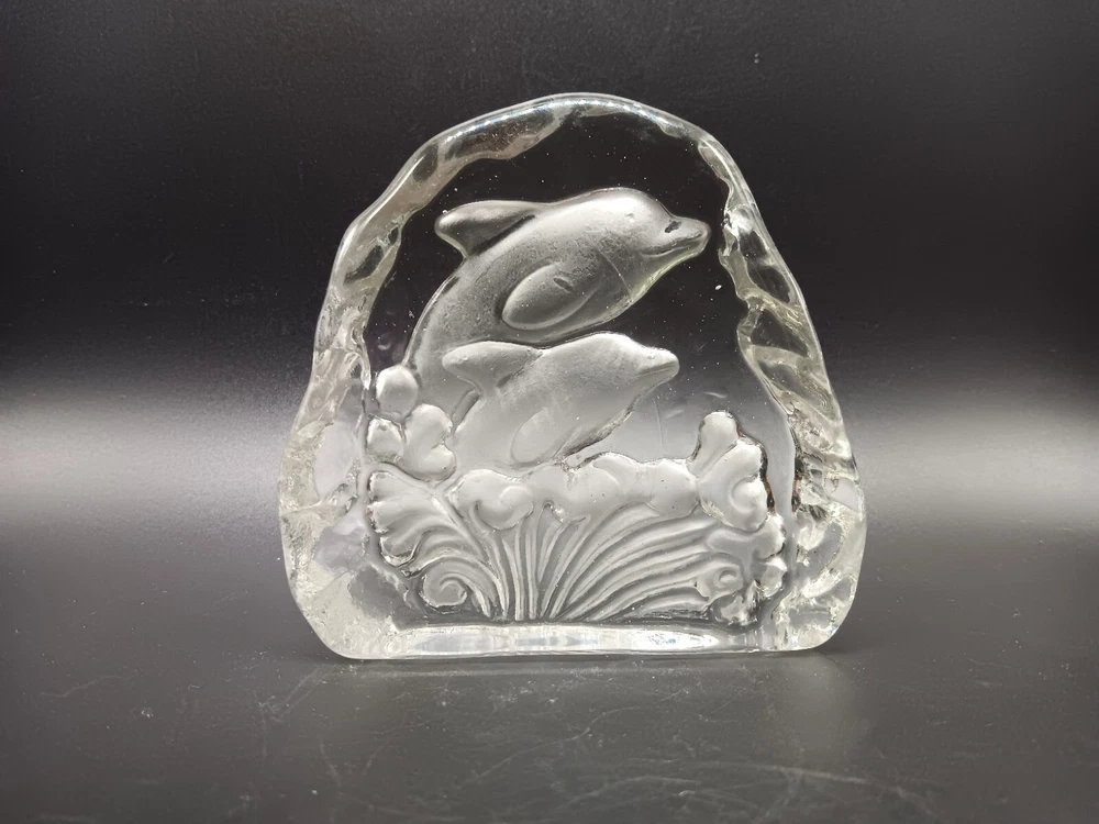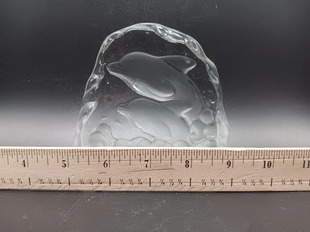 This vintage paperweight features a beautiful dolphin sculpture etched onto clear crystal glass. The intricate details of the dolphin make it a unique and eye-catching addition to any collection. The paperweight is handmade, and its origin is unknown. The type of glass is crystal, and the color is clear. The brand is unknown, and it is a vintage original. The production style is art glass, and the glassmaking technique is etched. It's a must-have for any dolphin or art glass enthusiast.