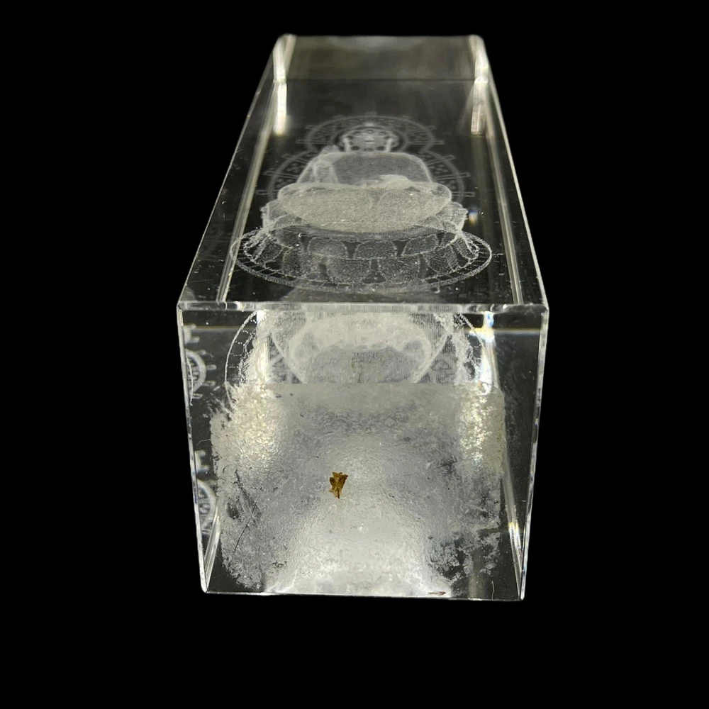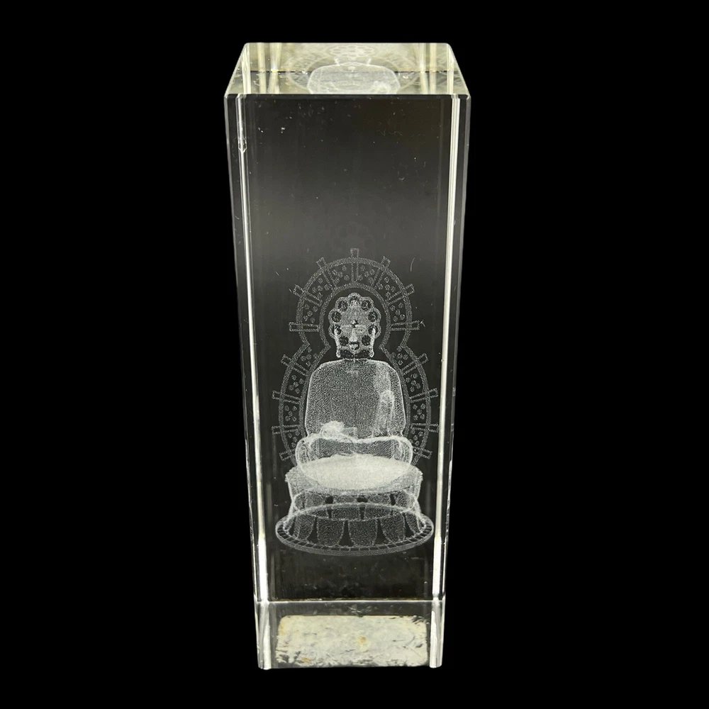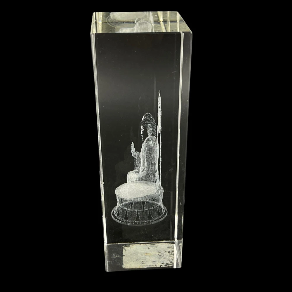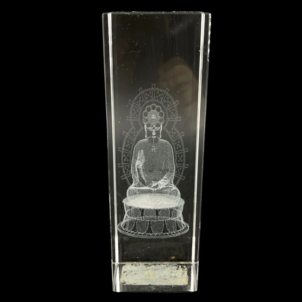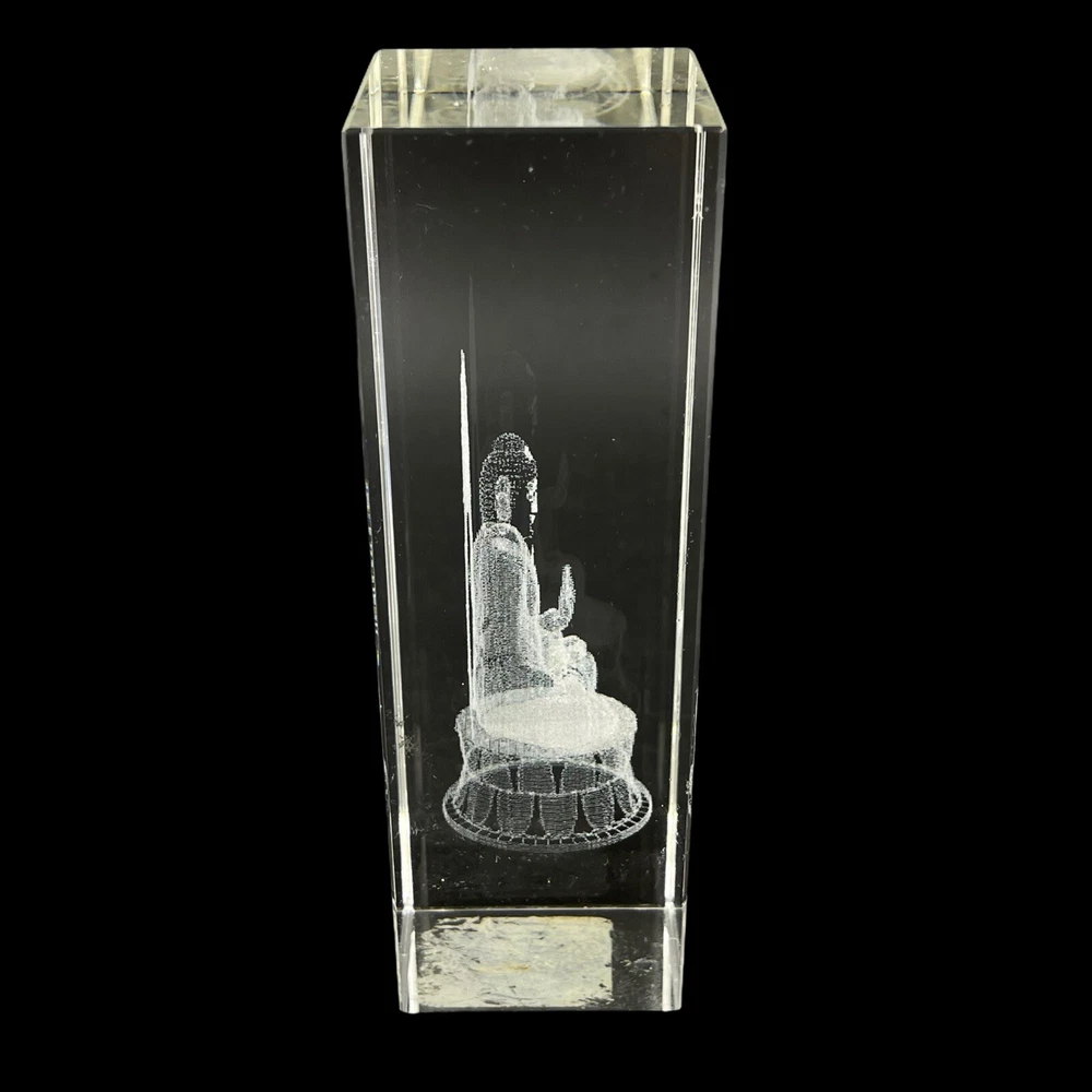 Vintage Crystal Glass Buddha Paperweight Laser Etched 3D Meditation 5 3/4" Tall 1 3/4" x 1 3/4" and 5 3/4" tall.