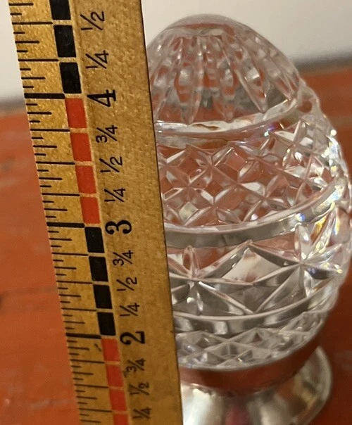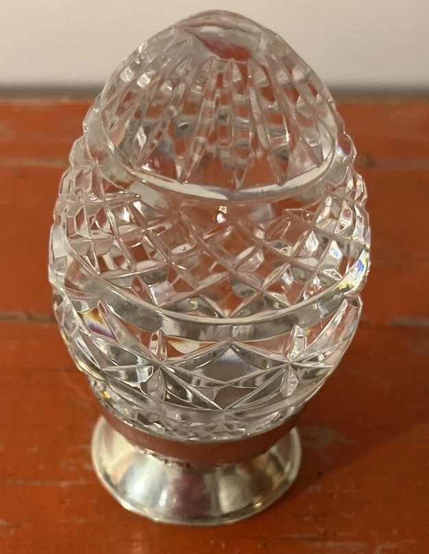 Retired annual Waterford Crystal Imperial Egg designed with the most ornate, intricate details The egg comes with its silver plated base / stand — exceptional condition and exceptionally beautiful when light shines upon it — quite an eye catcher See photos for approximate size and condition