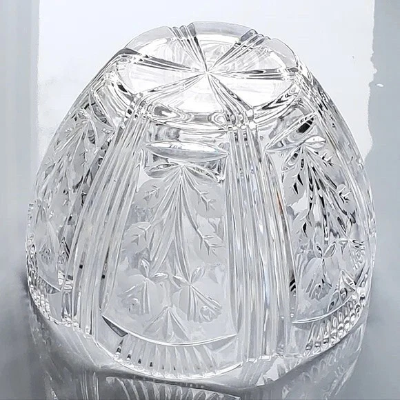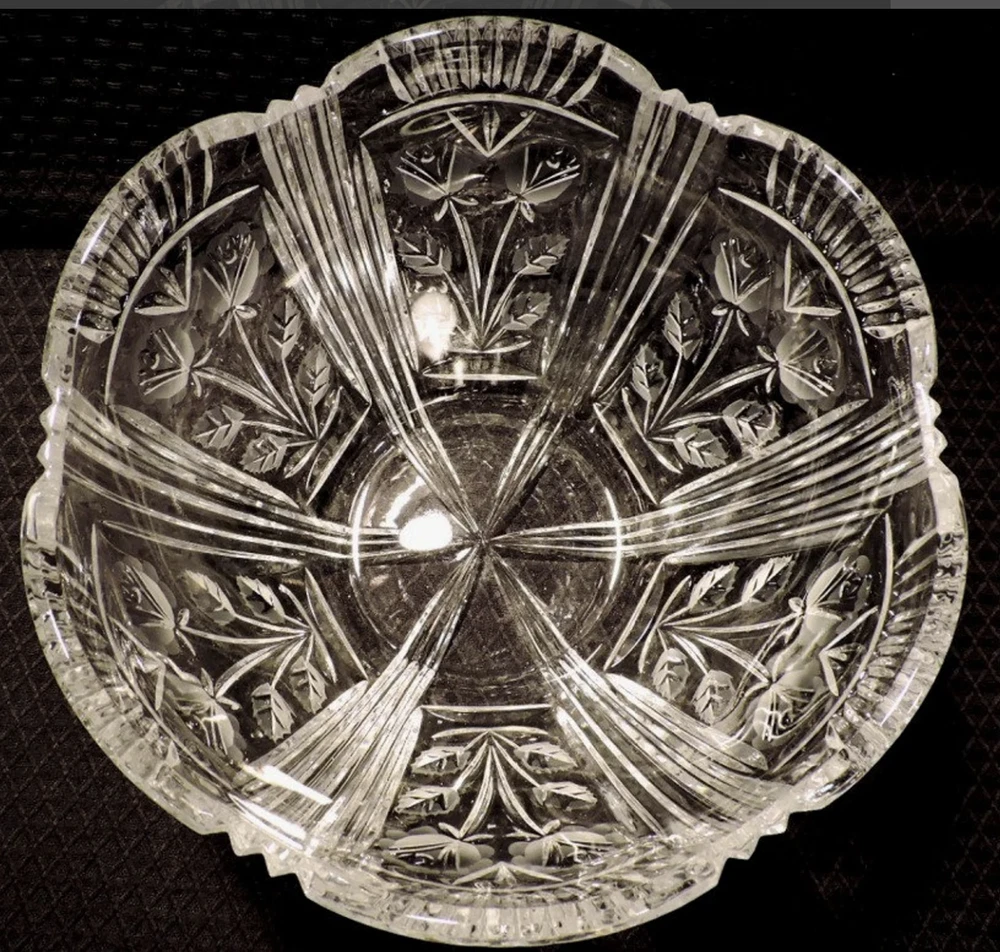 Low lead Crystal Glass Bowl . Darlington Pattern. Scalloped with frosted floral art nouveau decorations. A bold yet delicate, beautiful bowl, measures 8 1/4" diameter at top x 4" diameter at base. Previously owned but not used. Excellent shine, no nicks, chips, cracks, checking, or obvious scratches. Brilliant shine.