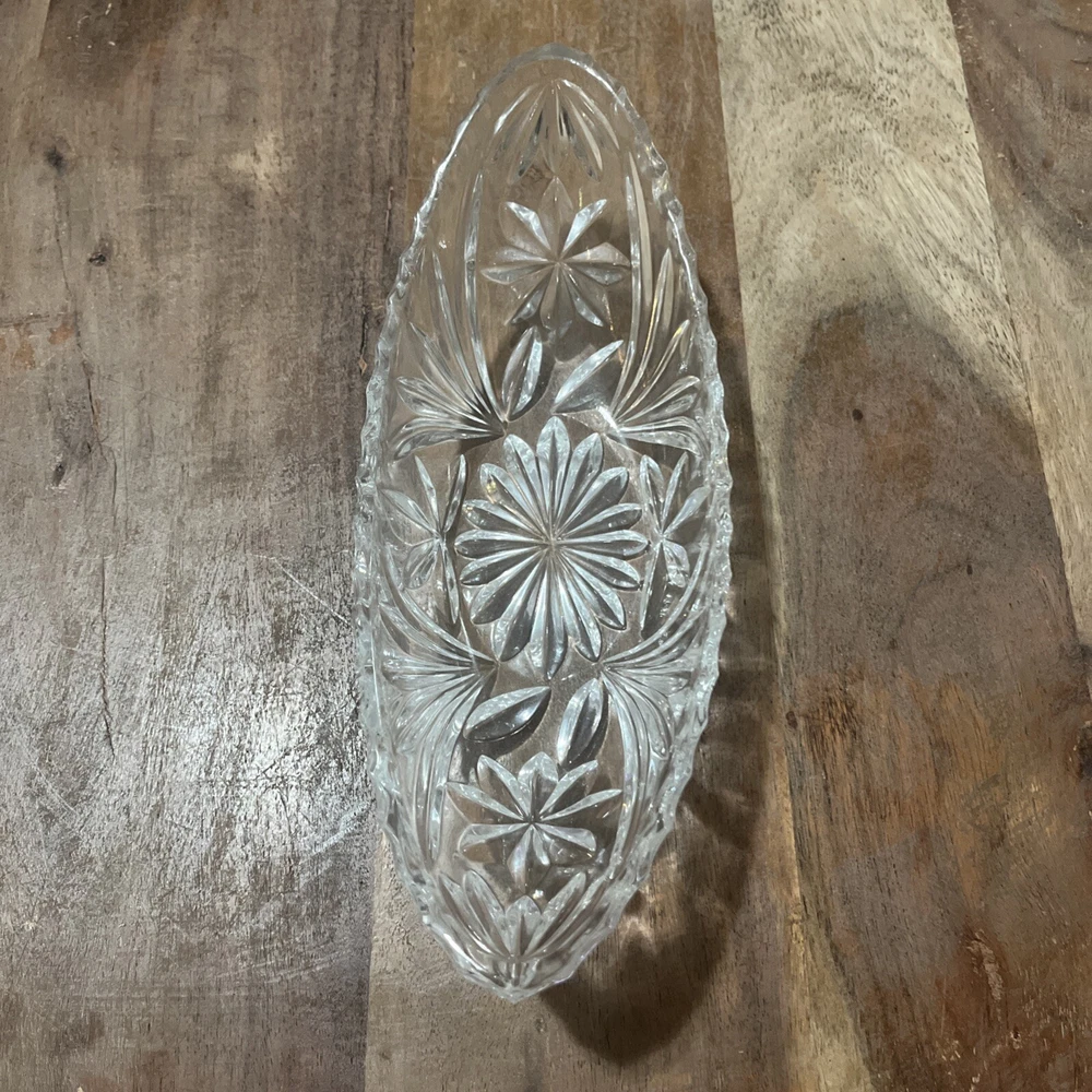 Add a touch of elegance to your dining table with this vintage Adriana Pickle Relish Dish. Made of 24% lead crystal, this dish is a perfect addition to your collection. The dish is beautifully crafted in West Germany. The dish is made of high-quality crystal and is perfect for serving pickles, relish, or any other condiment. The unique design and intricate details of this dish make it a great conversation starter. Whether you are hosting a dinner party or having a family meal, this dish is sure to impress your guests.