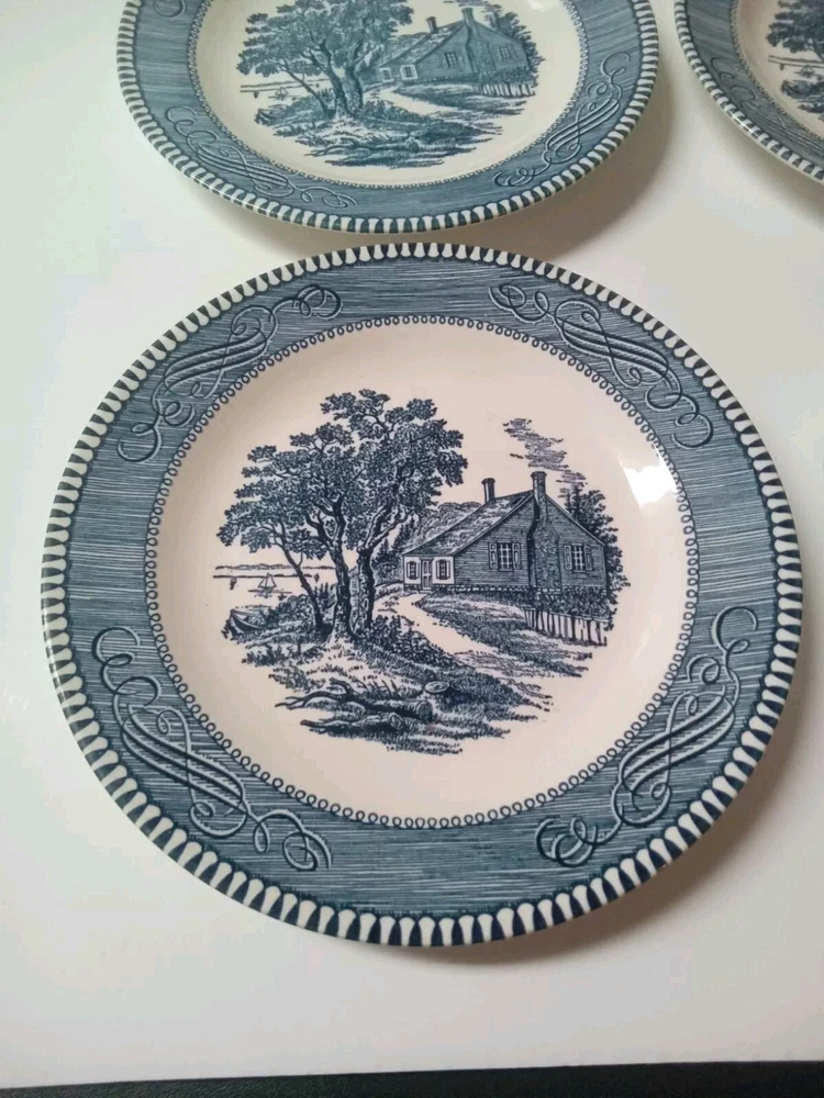 The Vintage Currier and Ives 7-1/4" Salad Plates by Royal China are a set of six retro-style salad plates featuring a multicolor Currier & Ives pattern. The plates are round in shape, measuring 7-1/4 inches in diameter, and are made of ceramic with a glossy finish. These salad plates showcase blue and white pottery production style, embodying a Farm theme from the Late 20th Century. Hand wash only, These original plates are perfect for all occasions, adding a touch of vintage charm to any table setting. These plates are in good used condition with no chips or cracks. See photos.