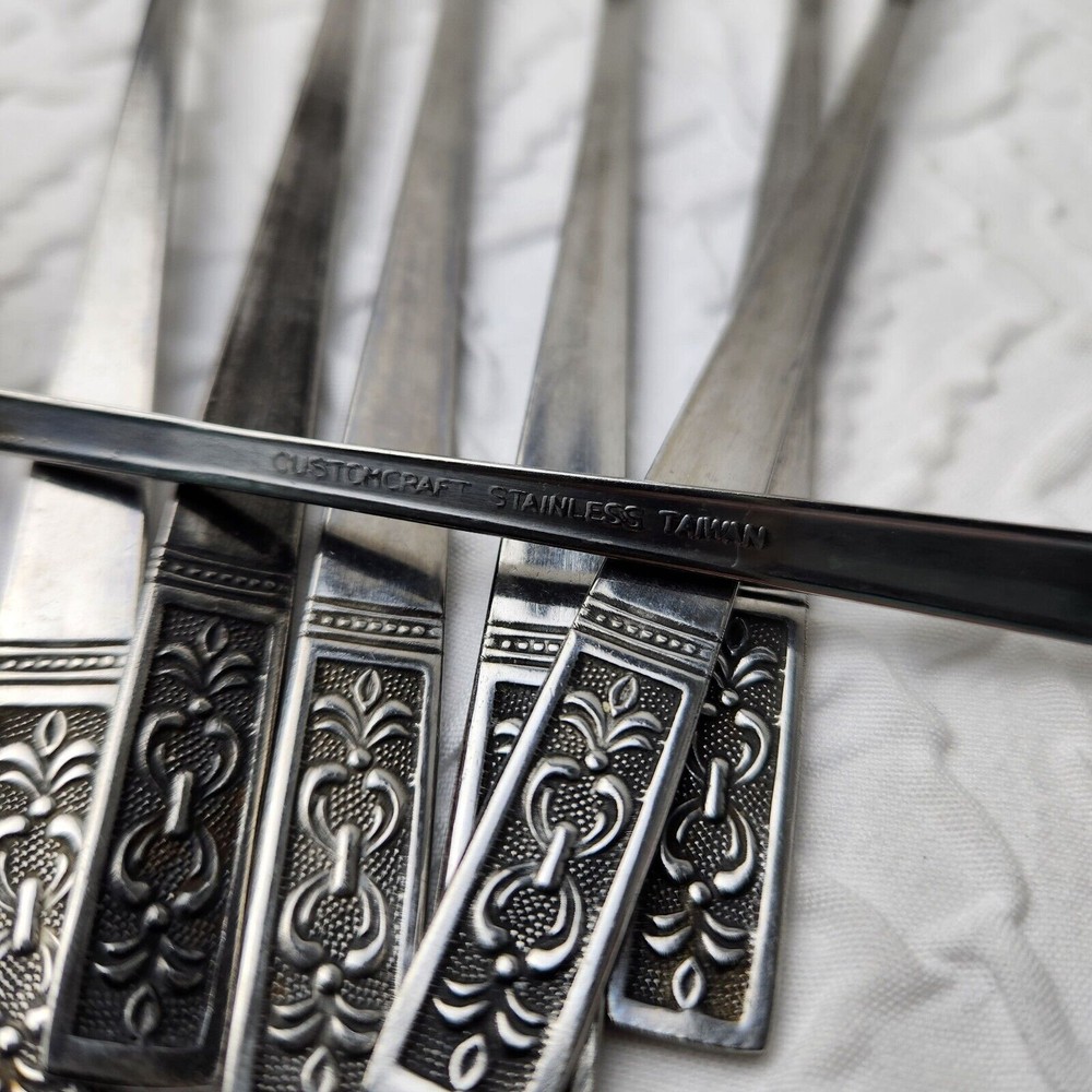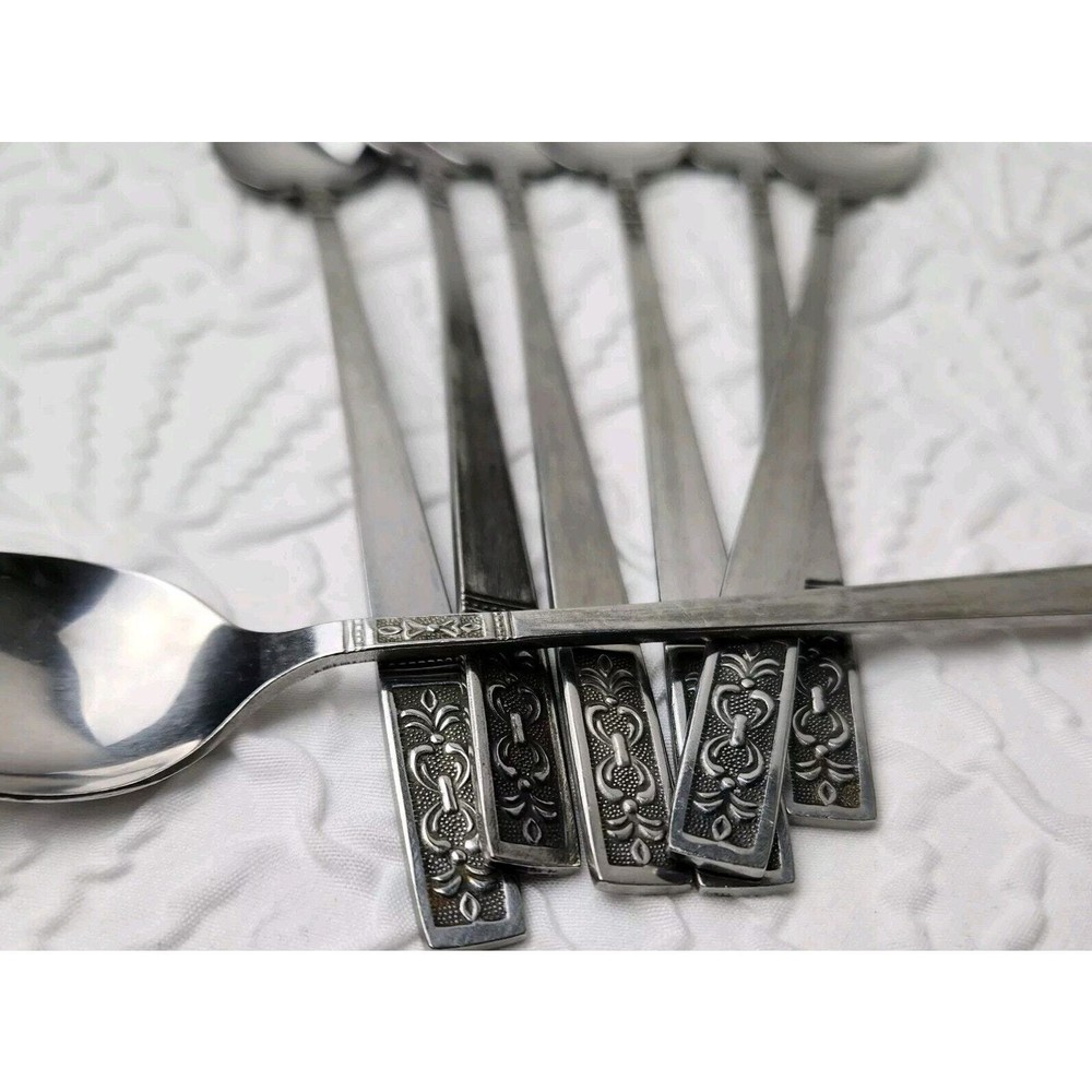 Normal Wear, used for holidays. Add a touch of vintage charm to your tea time with these Customcraft stainless ice tea spoons. The intricate Fleur de Lis design on seven spoons is sure to impress your guests. Made in Taiwan, these spoons are crafted from durable stainless steel, perfect for everyday use. The silver color adds a touch of elegance to any table setting. Ideal for adults, these ice tea spoons are a must-have addition to your flatware collection.