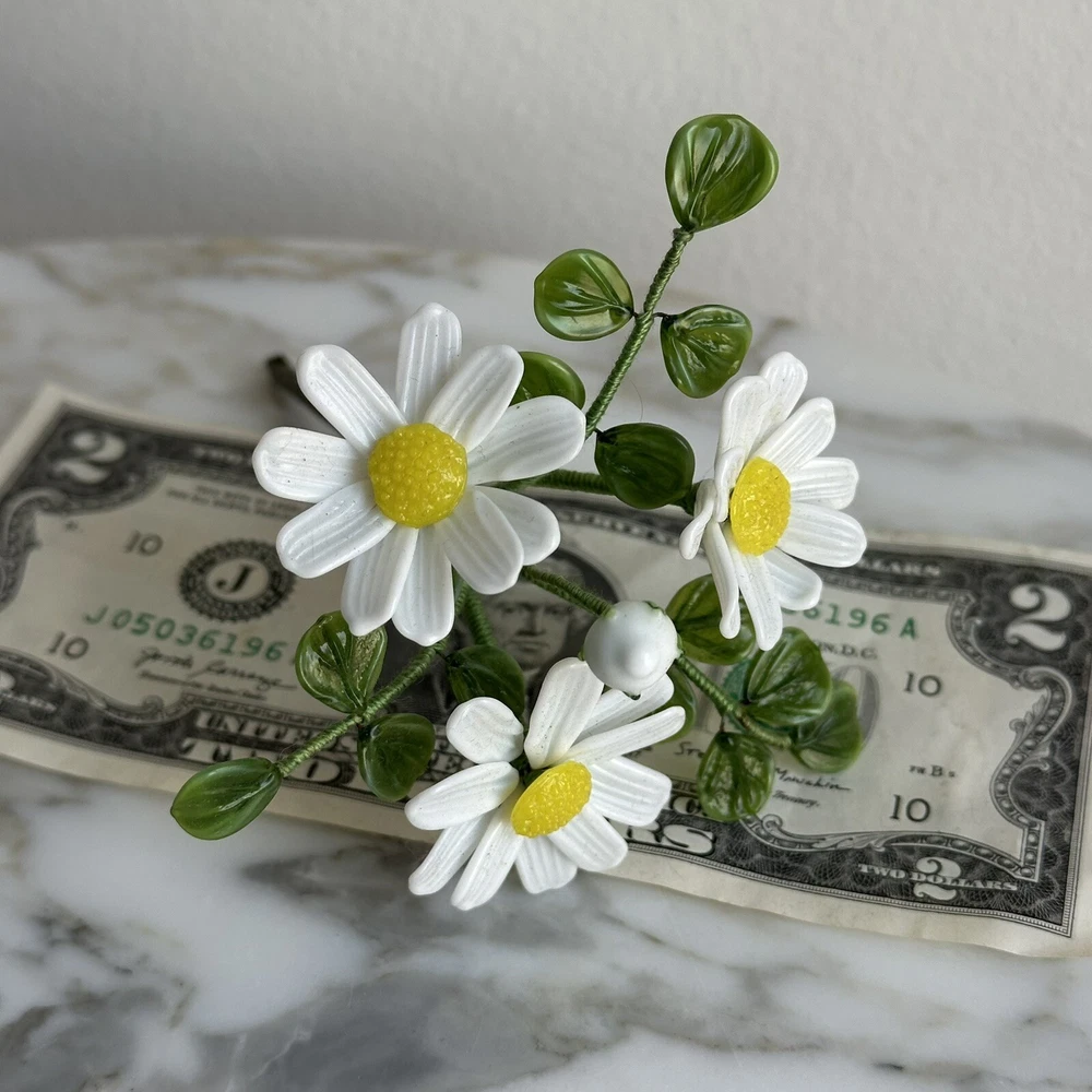 Vintage decorative flower bouquet. Glass with bendable wrapped wire construction. White flowers with green leaves. Be aware that these range in size somewhat. The bouquet pictured is approx. 4 1/4" x 3 1/2" x 5" tall. Very fine condition. Look like new!