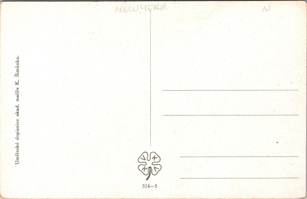 Celebrate the New Year with a touch of vintage charm with this exquisite Czech postcard featuring the artwork of Karel Simunek, one of Czechoslovakia’s leading artists. The piece captures a lovely lady dressed in traditional Czech attire, holding a winged cherub, an emblem of the new year. It's a perfect representation of the holiday spirit, infused with the elegance of Czech culture and the whimsy of children and infant themes. Crafted from quality paper, this standard-sized (5.5 x 3.5 in) original postcard is a single unit offering, unposted and waiting to be a part of your collection. It's a wonderful find for enthusiasts of art, fashion, and fantasy, as well as those who appreciate the sentiments of yesteryear.