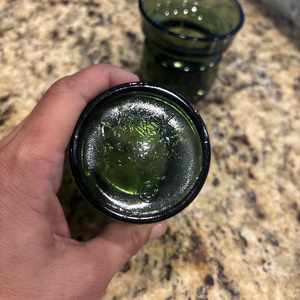 The Vintage DANSK Green Glass Votive Candle Holder set includes two small round candle holders made of green glass. These stylish design pieces are crafted in Denmark by the renowned brand Dansk, adding a touch of elegance to any space. Each candle holder stands at 2 1/2" in height and 2 3/4" in width, making them perfect for adding ambiance to a room or for use in a collection of decorative candle holders.