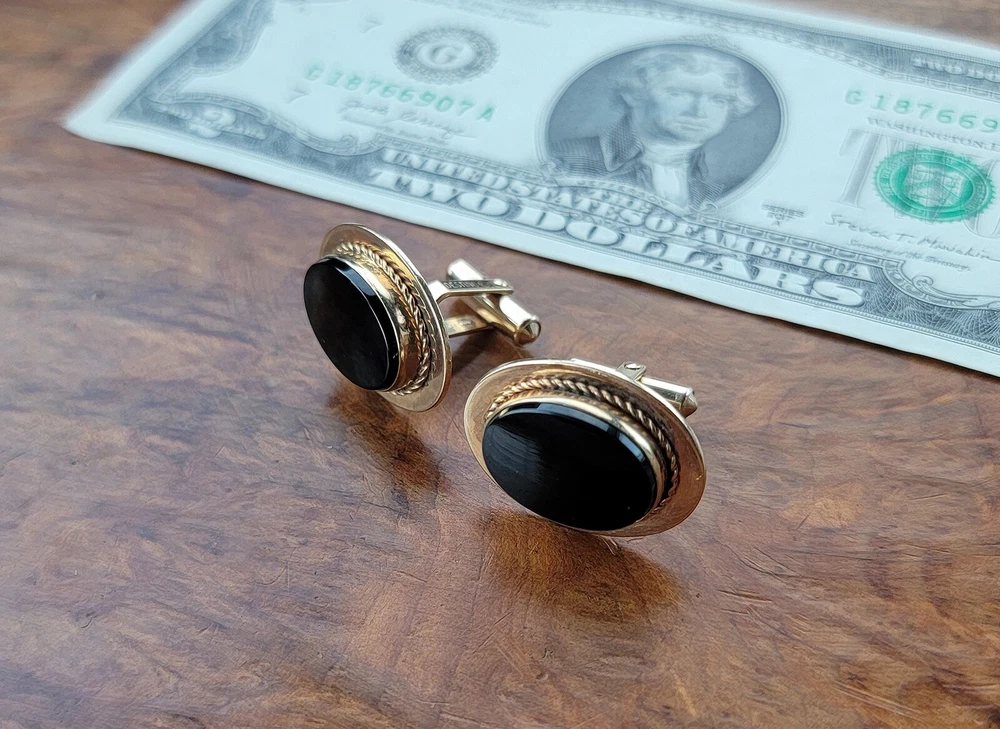 Vintage DESTINO Cufflinks - Oval - Gold Filled/Black Onyx DIMENSIONS: Front: 25 mm x 20 mm. Cabochon: 18 mm x 13 mm. Total weight, both cufflinks: 13.3 grams. DESCRIPTION: Vintage cufflinks. By DESTINO. 1/20th 12K gold filled cufflinks. Oval front with bezel-set flat oval black onyx cabochon and twisted wire accent. Bullet toggle with hinged post. All original. Maker's marks: "Destino © - 1/20th 12K G.F. - D&F"; "Pat 2093723 - Pat 2544833". Mid 20th century. USA. CONDITION: Both cufflinks are in excellent original condition. No damage and no significant wear. No restorations / repairs. Gently used, not abused. No dings, dents, scuffs, cracks, splits, bends, breaks. No significant scratches or rubs. No significant edge wear. The hinges and toggles hold position as designed with no issues. On close inspection you may detect light typical use- / handling-related wear: scattered fine superficial scratches and rubs. Nothing at all significant or conspicuous. Old patina as found. Light typical age-related oxidation.
