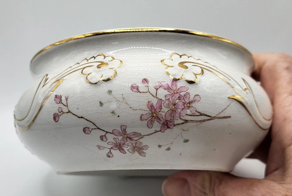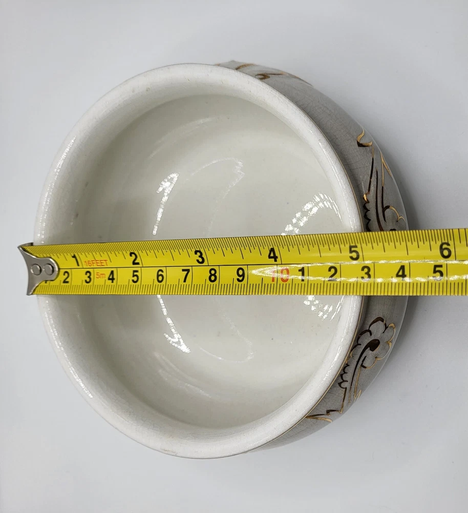 I am not sure about this piece. It's lovely, but I'm only guessing about the use. I'm going with shaving dish and that it is vintage. Or it could be a trinket dish. It appears to be hand painted with gold accents over embossing. The diameter measures 5 in. With a height of 2.5 in. The guilding is sharp and in good condition.