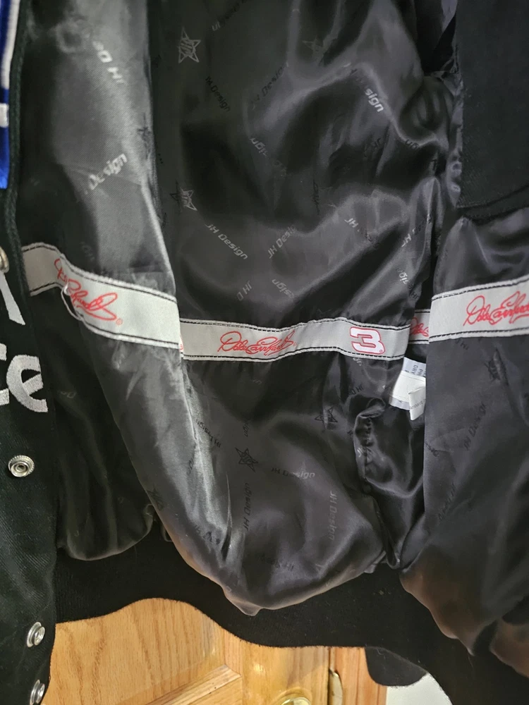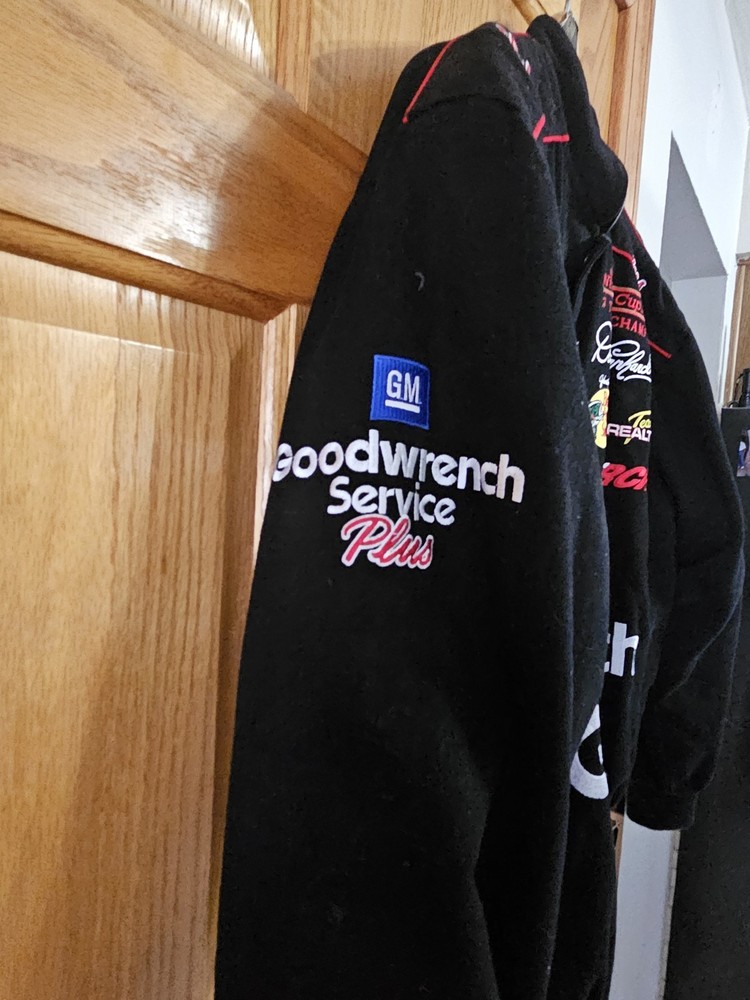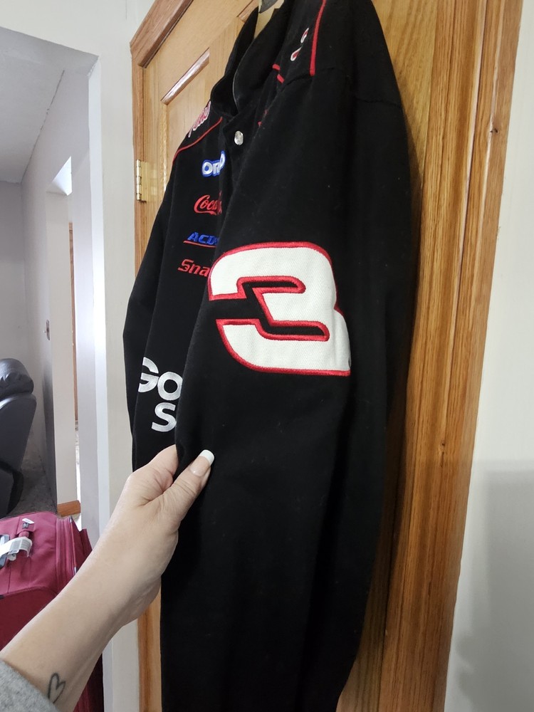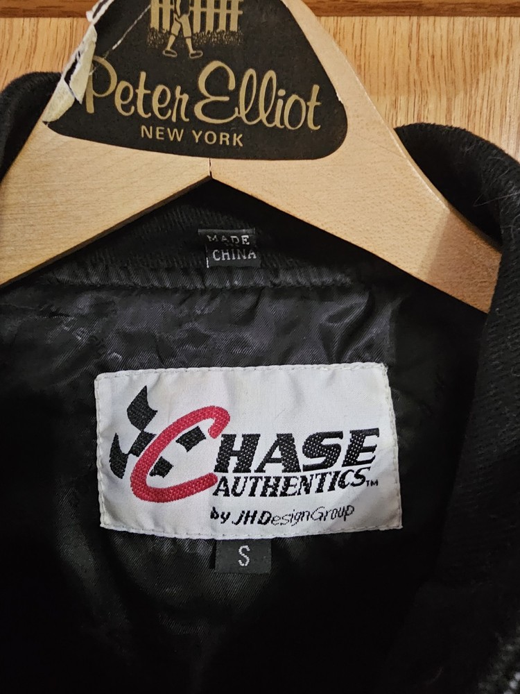 The product is a vintage Dale Earnhardt jacket from the 90s, featuring the iconic black color associated with the driver's Goodwrench sponsor. This jacket is a size small for men, showcasing the branding of Chase, the team of Richard Childress Racing. As a piece of fan apparel, it is a must-have for any NASCAR racing enthusiast looking to honor the legendary driver and his racing legacy.