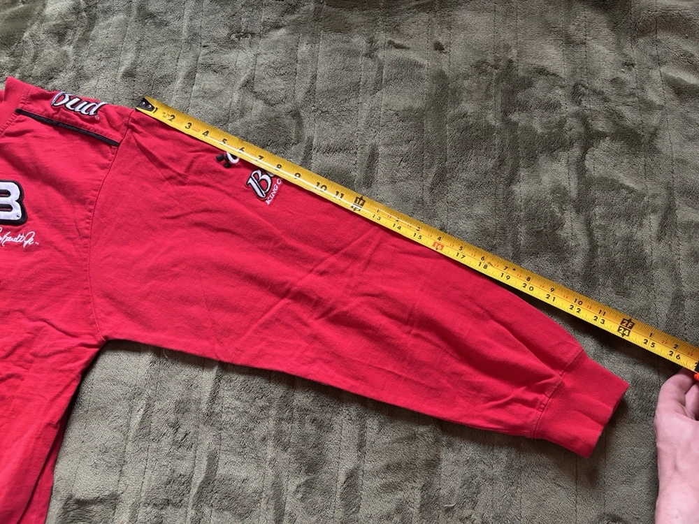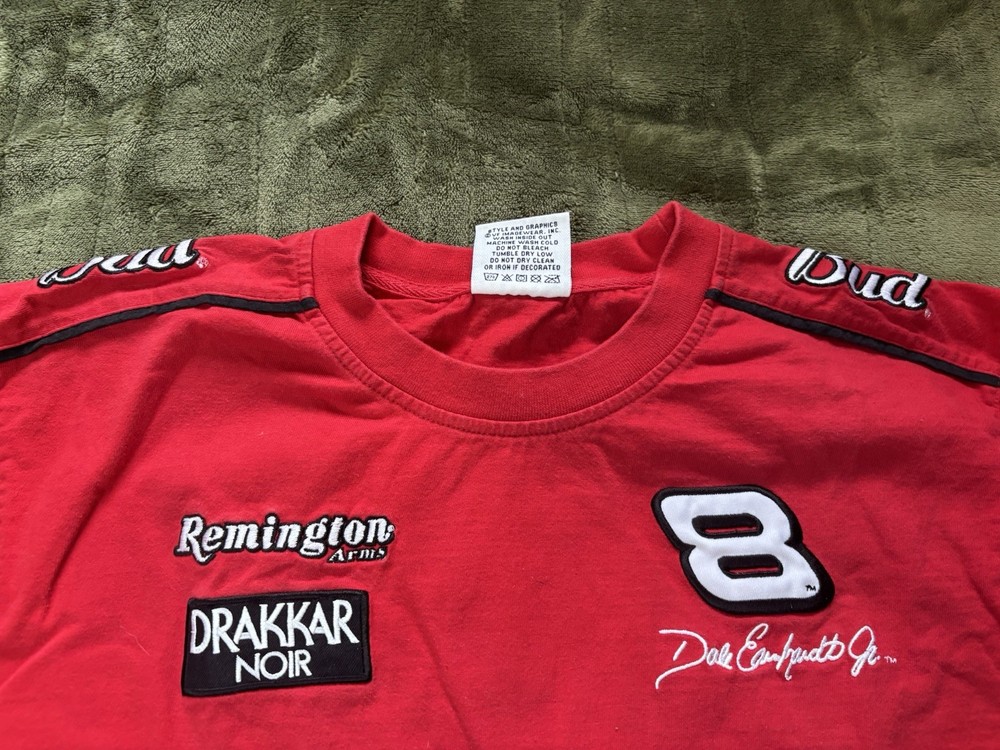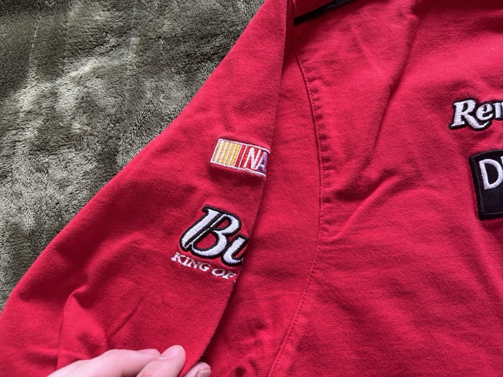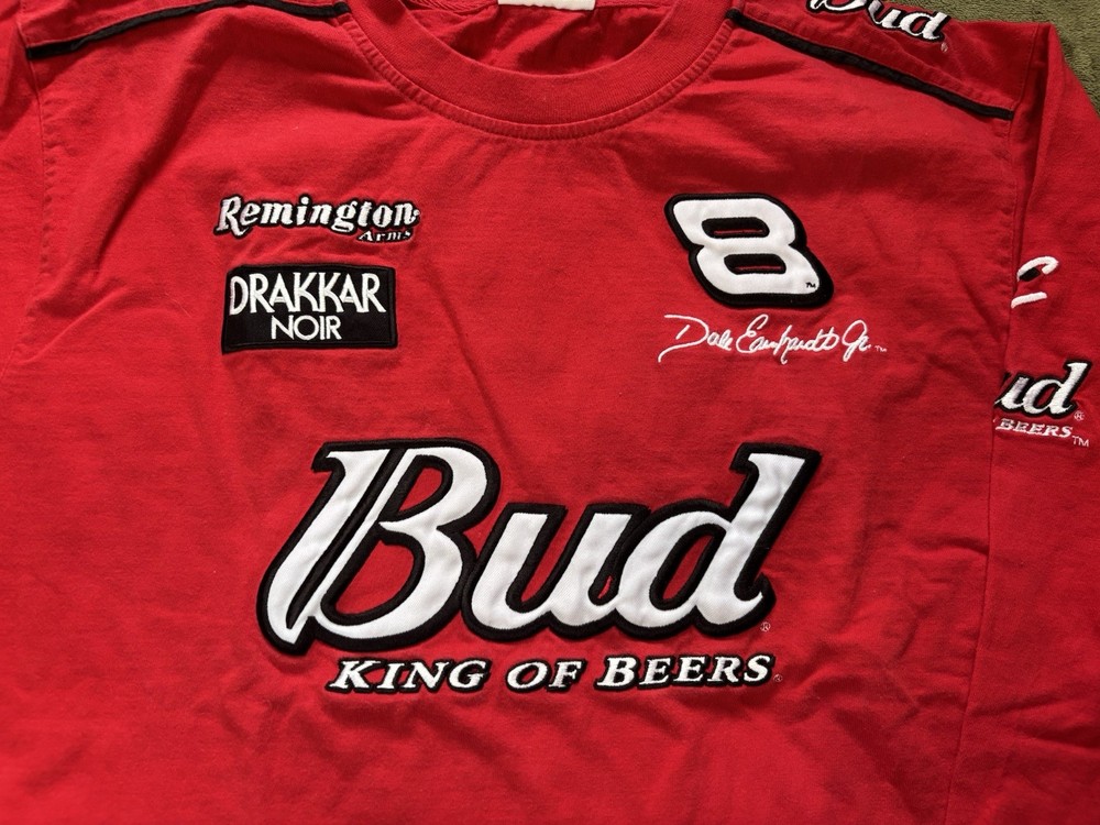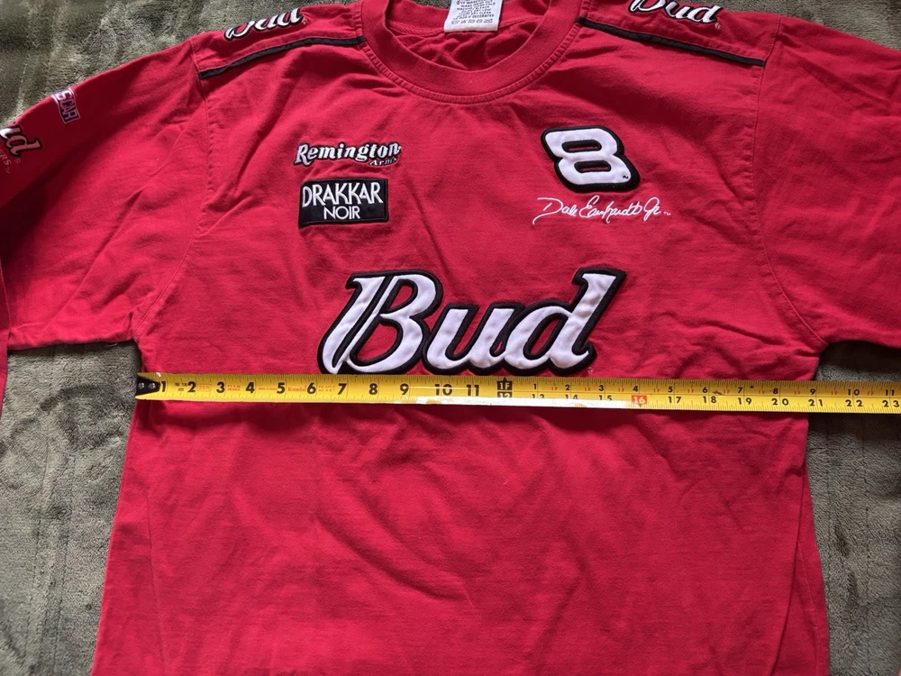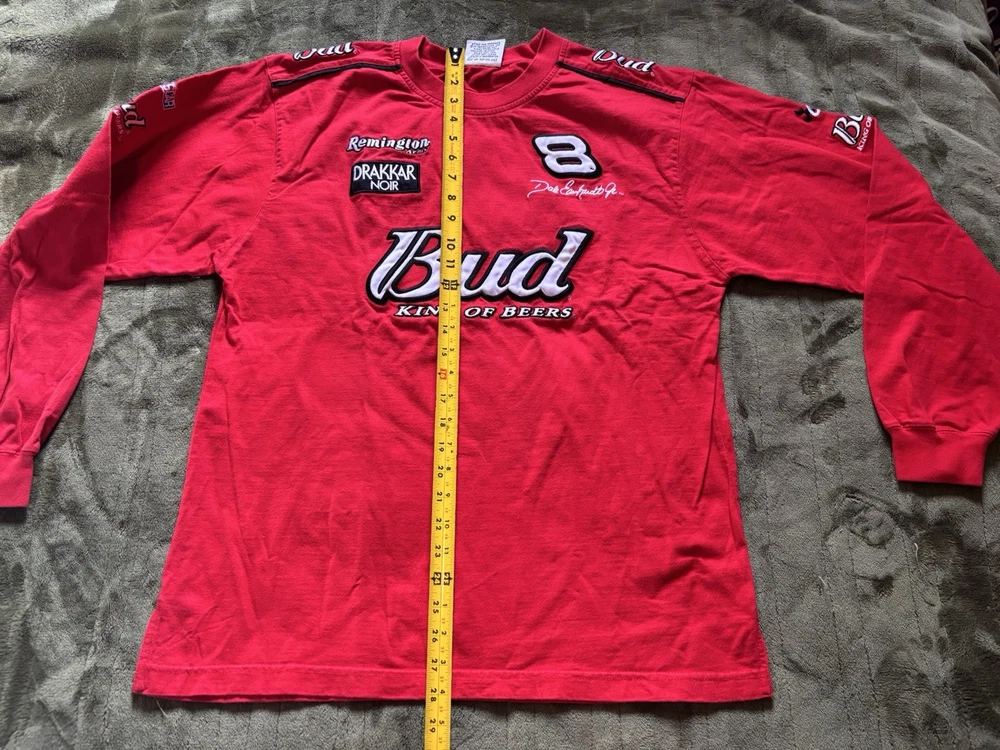 The product is a vintage Dale Earnhardt Jr shirt in men's medium size, featuring a red color and long sleeves. It is a fan apparel item for supporters of auto racing, specifically NASCAR. The shirt showcases the driver's association with the Hendrick Motorsports team and highlights the brand Chase. Perfect for fans of the sport and enthusiasts of Dale Earnhardt Jr, this shirt commemorates the iconic Bud King Of Beers campaign.