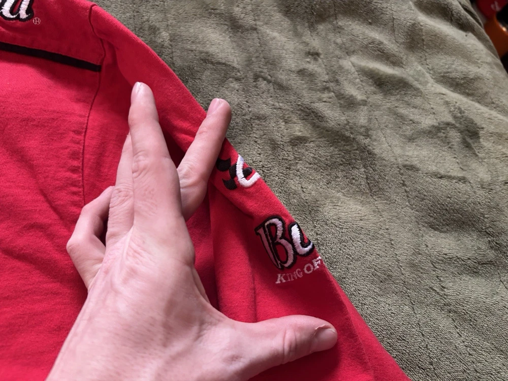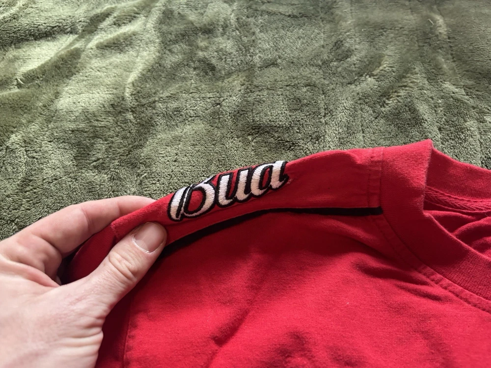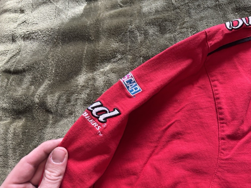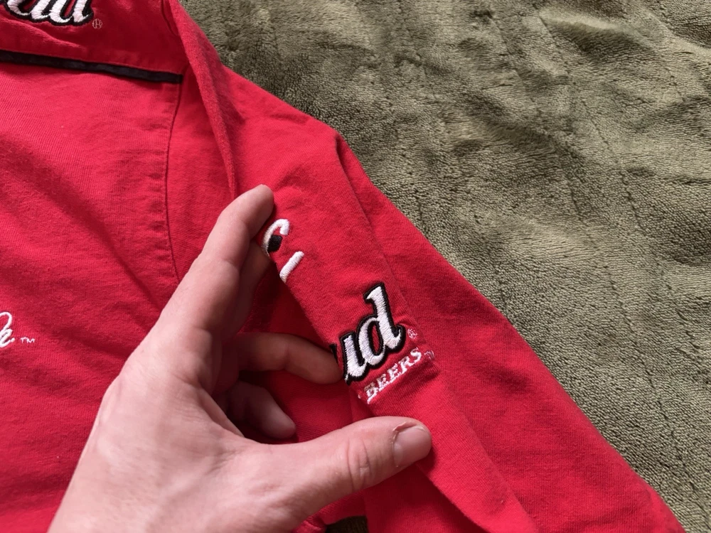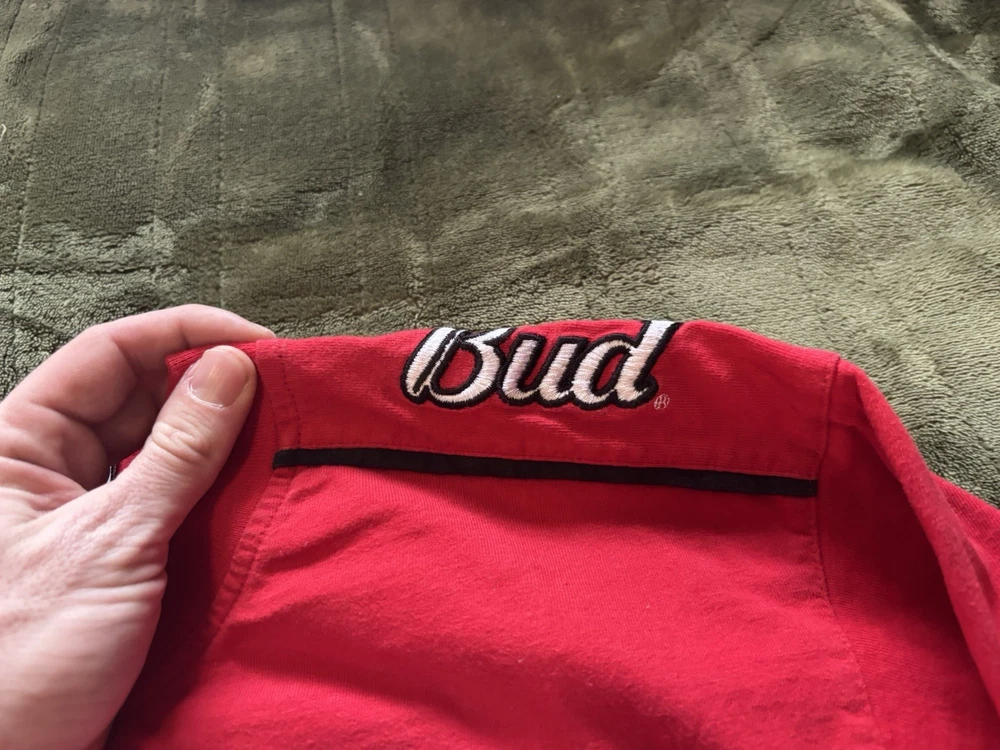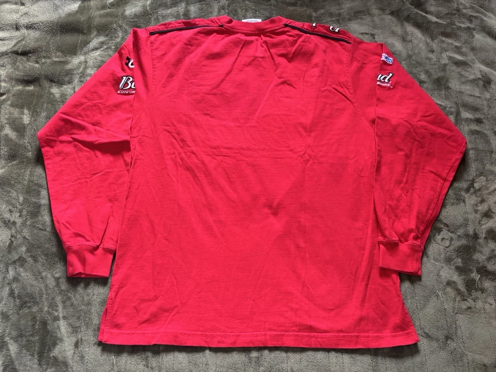 The product is a vintage Dale Earnhardt Jr shirt in men's medium size, featuring a red color and long sleeves. It is a fan apparel item for supporters of auto racing, specifically NASCAR. The shirt showcases the driver's association with the Hendrick Motorsports team and highlights the brand Chase. Perfect for fans of the sport and enthusiasts of Dale Earnhardt Jr, this shirt commemorates the iconic Bud King Of Beers campaign.
