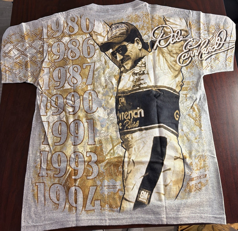 Vintage Dale Earnhardt Sr NASCAR All-Over Print Championship Shirt – Size Medium. Features: • Large front & back graphics • Championship years: 1980, 1986, 1987, 1990, 1991, 1993, 1994 • Talladega Speedway graphic • Goodwrench / GM / Goodyear sponsor details • Official NASCAR licensed apparel Condition: Pre-owned in great condition. No stains, holes, or cracking visible. Graphics are strong and vibrant. See photos for details.