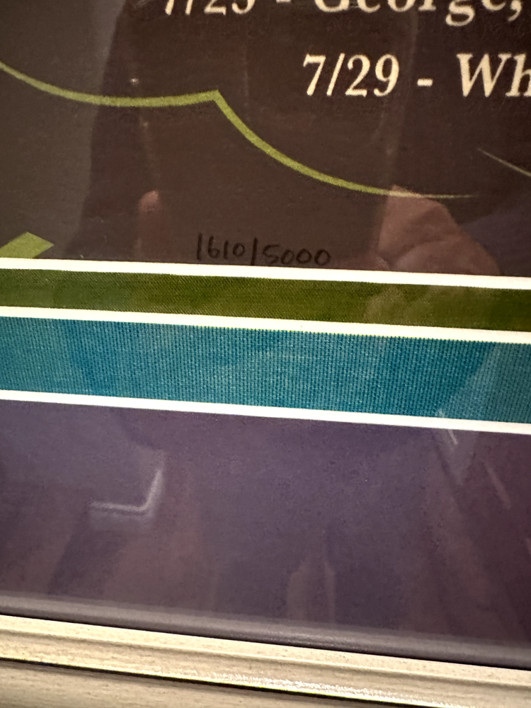 Capture a piece of music history with the 36" X 29" Framed Dead & Company Concert Poster for their 2016 Summer Tour. Rare numbered poster # 1610 of 5000. Poster art by Status Serigraph. Excellent condition. Celebrate the iconic Grateful Dead spin-off with this original piece, a must-have for any collector or fan of the rock and pop genre. Expertly crafted in the United States, this poster is not just a visual memento but a tribute to the enduring legacy of the band. It's a standout addition to any music memorabilia collection, bringing a touch of the Grateful Dead's spirited energy into your space. Poster description: Tan frame with a sheet of glass, light purple outer matting, green inner matting; Green VW bus with two turtles dancing on top of the bus