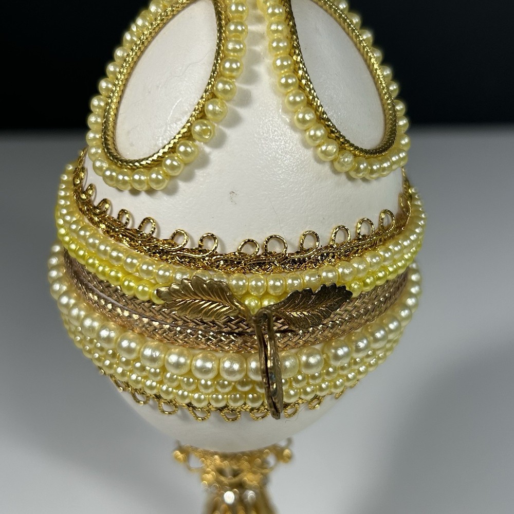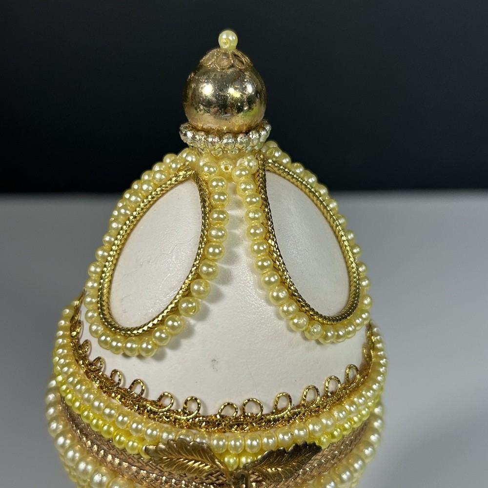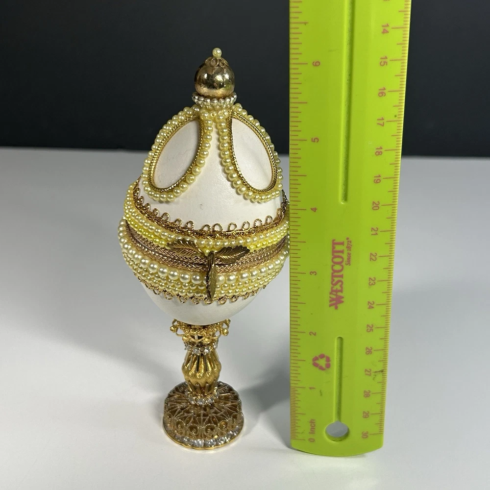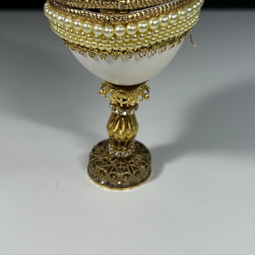 Vintage Decorative Egg Jewelry Box Floral Pearl Ornate Gold Rhinestone Stand Elevate your jewelry storage with a touch of vintage charm using this exquisite Vintage Decorative Egg Jewelry Box. Ornately designed with a hand-painted floral motif and accented with pearl and jewel embellishments, this gold-tone box boasts a majestic presence, making it a regal addition to any dresser or display cabinet. The box features a hinged top with a clasp closure, ensuring your precious items are kept secure while adding a dash of elegance to your space. Ideal for those who appreciate the allure of Victorian and Fabergé-inspired design, this unbranded jewelry box is a testament to classic style and craftsmanship. Whether it's a luxurious gift for an anniversary or a whimsical addition to your home decor, this collectible piece resonates with a romantic and feminine aesthetic, perfect for bridging the gap between functionality and decorative art. Please See All Pictures For Condition of Item and Details Before Purchasing ! Thank You For Looking and Have a Great Day!