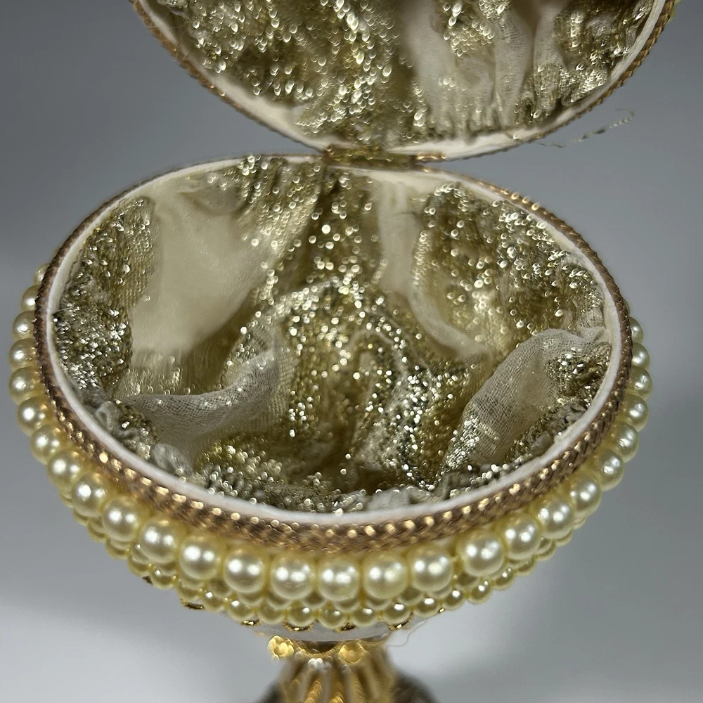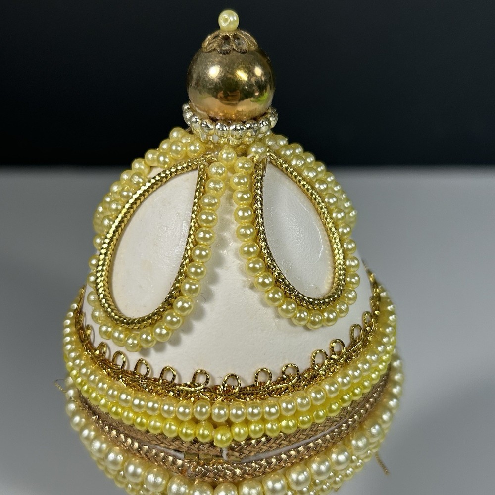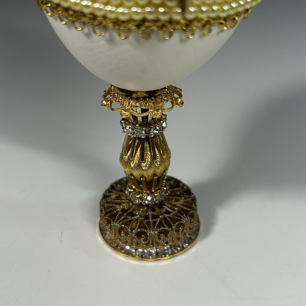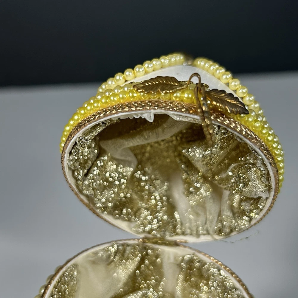 Vintage Decorative Egg Jewelry Box Floral Pearl Ornate Gold Rhinestone Stand Elevate your jewelry storage with a touch of vintage charm using this exquisite Vintage Decorative Egg Jewelry Box. Ornately designed with a hand-painted floral motif and accented with pearl and jewel embellishments, this gold-tone box boasts a majestic presence, making it a regal addition to any dresser or display cabinet. The box features a hinged top with a clasp closure, ensuring your precious items are kept secure while adding a dash of elegance to your space. Ideal for those who appreciate the allure of Victorian and Fabergé-inspired design, this unbranded jewelry box is a testament to classic style and craftsmanship. Whether it's a luxurious gift for an anniversary or a whimsical addition to your home decor, this collectible piece resonates with a romantic and feminine aesthetic, perfect for bridging the gap between functionality and decorative art. Please See All Pictures For Condition of Item and Details Before Purchasing ! Thank You For Looking and Have a Great Day!