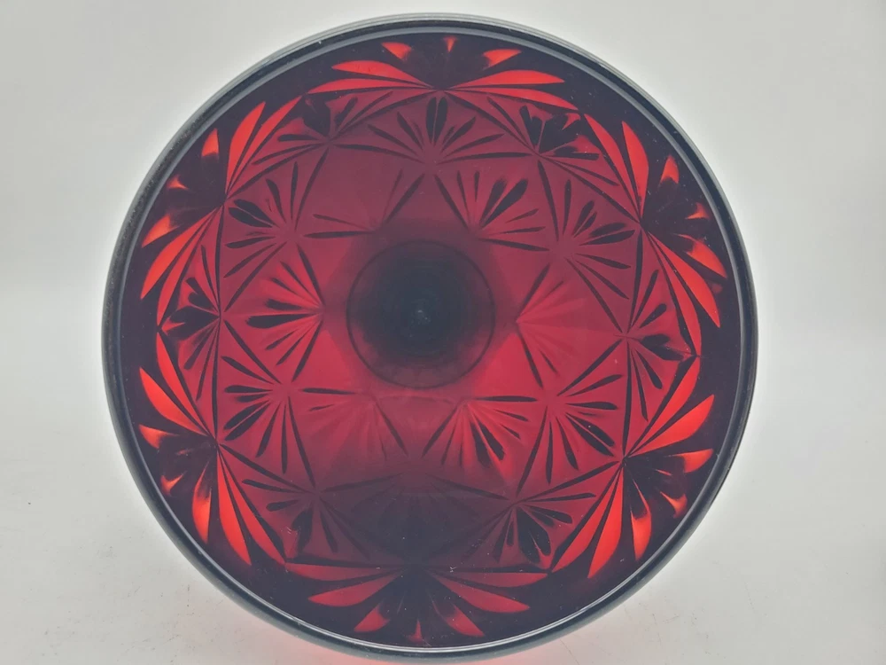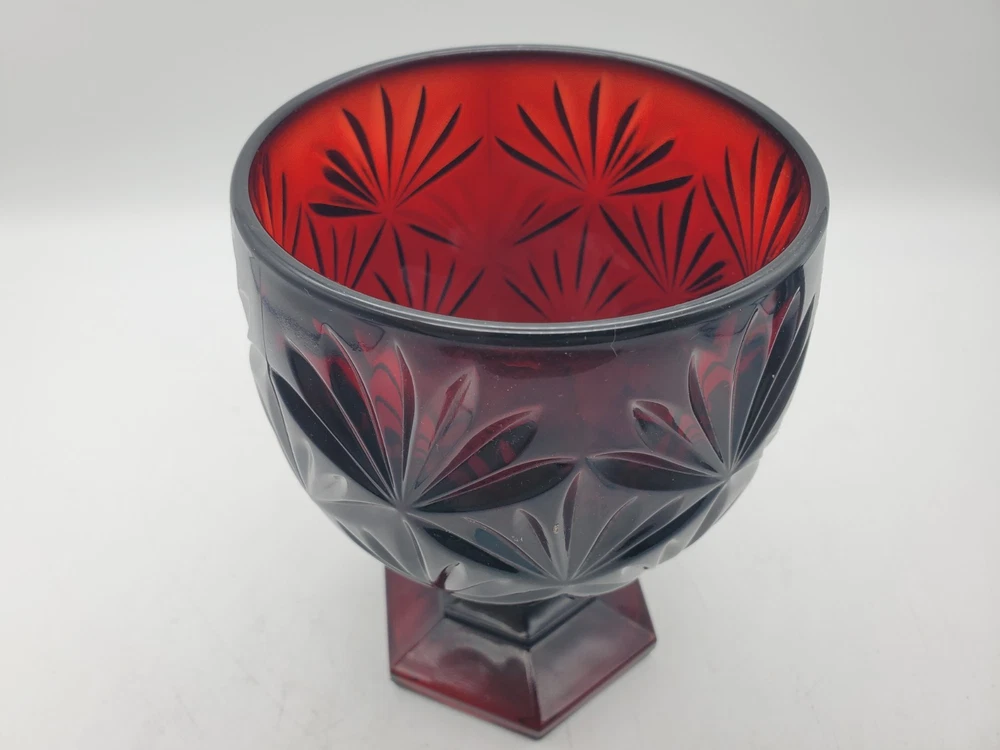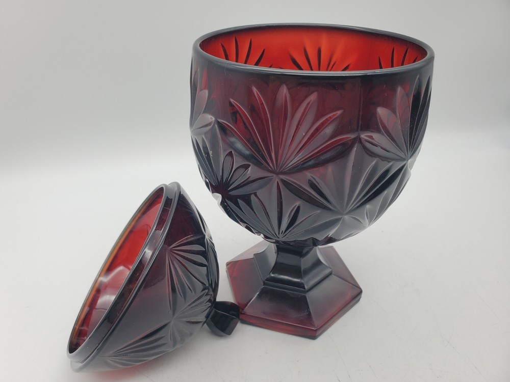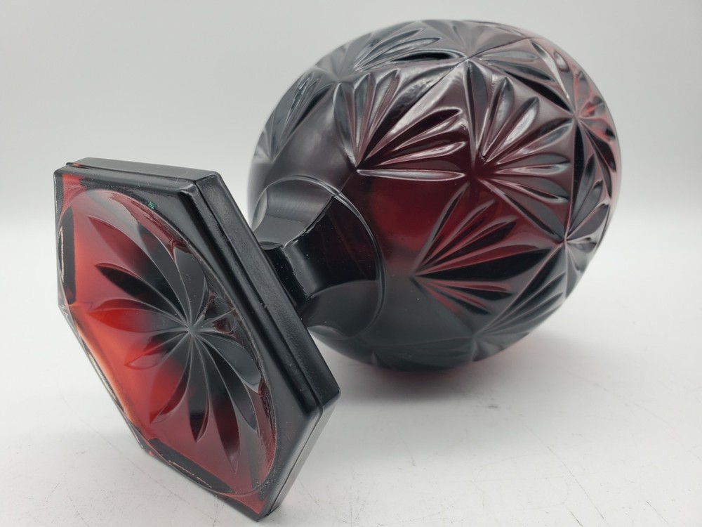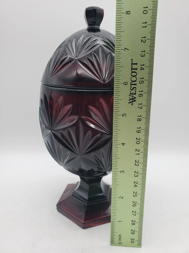The Cristal D’arques Durand Luminarc Ruby Red Glass Egg Pedestal Candy Dish Jar is a stunning antique-style collectible featuring a vibrant red glass design. Made by the reputable brand Luminarc, this original piece adds a touch of elegance to any decor with its unique egg-shaped pedestal base. Perfect for displaying candy or potpourri, this beautiful glass dish is a must-have for collectors of decorative items. Made in France circa 1984, this piece features the beautiful fanned fern pattern and stands 8.75" tall with its lid and 4.5" in diameter. The deep red color makes it great for bright holiday candy, or any time of year.