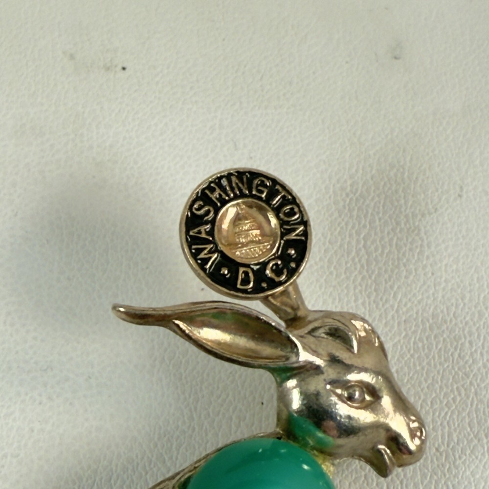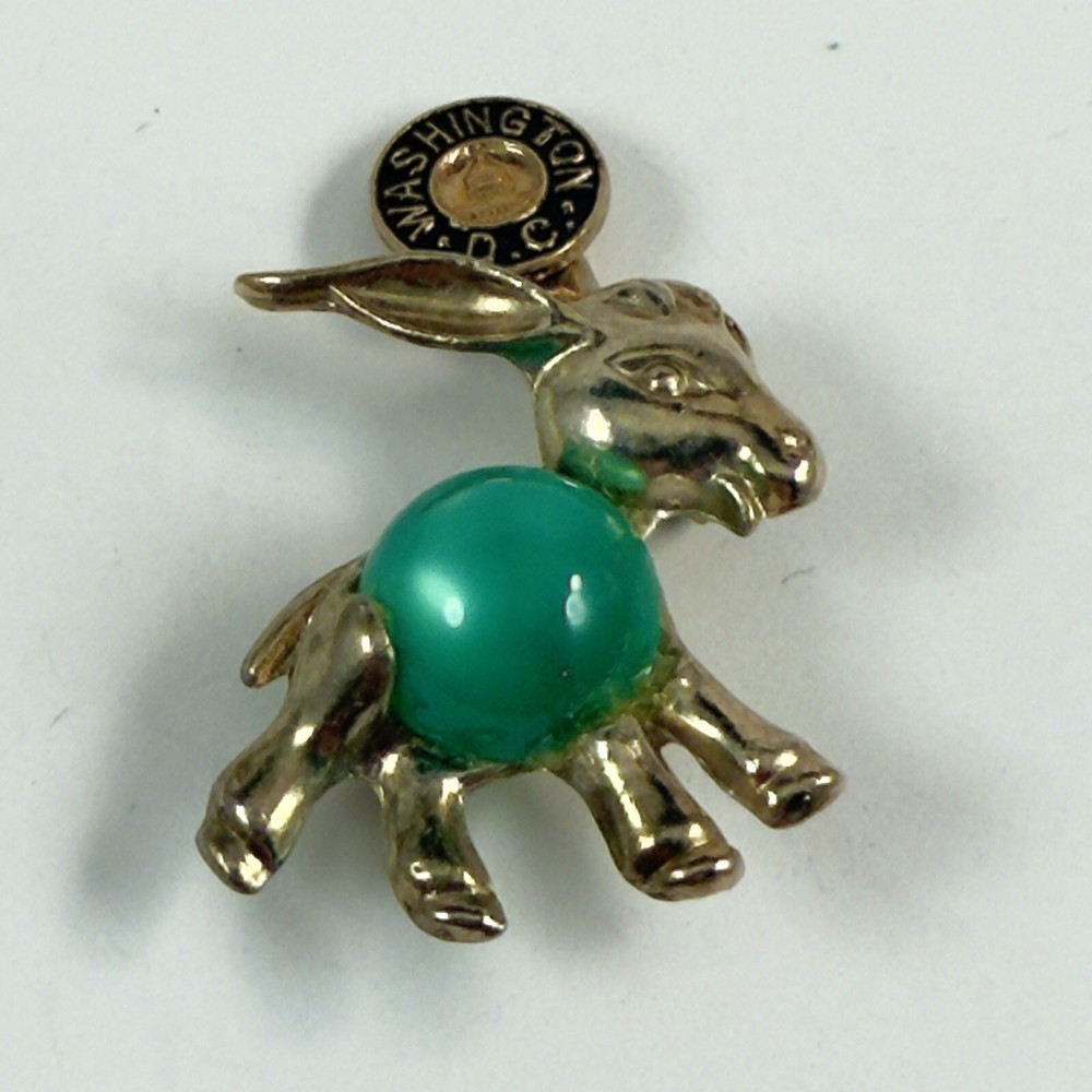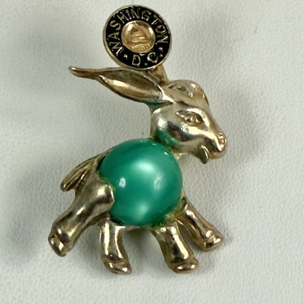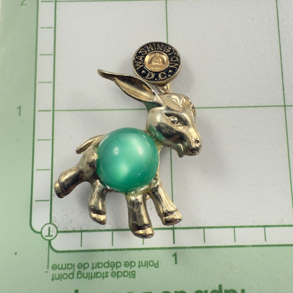 VTG Democratic Donkey Green Moonglow Lucite Jelly Belly Washington DC Brooch. Pre-Owned Estate Jewelry in Very Good Condition. Ready to wear, give as gift or add to a collection. Our Vintage items are mostly from estate sales and vary in age from 100+ years old to more modern pieces. Please use your judgement. Items are photographed on a measuring matte with one-inch squares to give you an idea of size. Any photography props / holders you see are not included.
