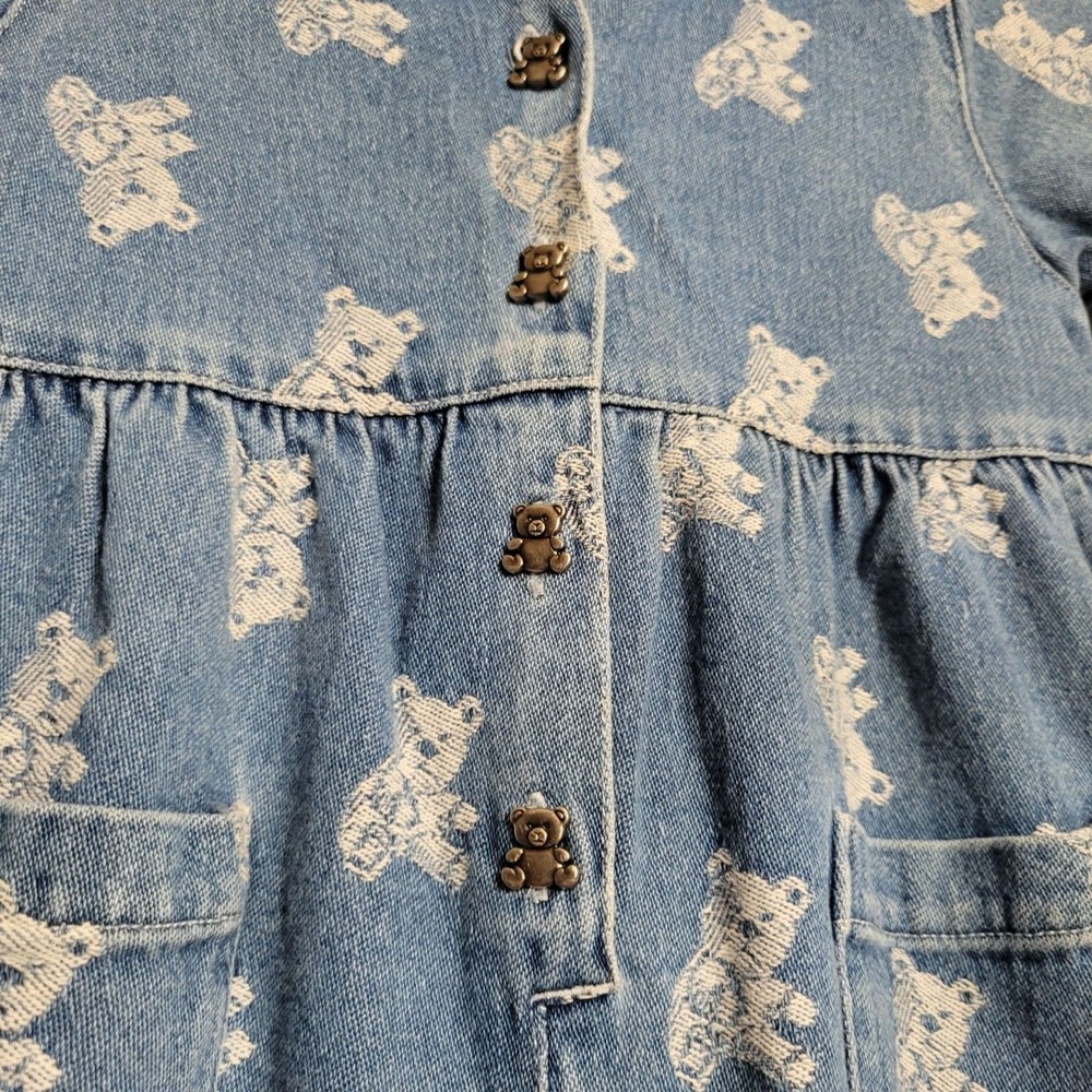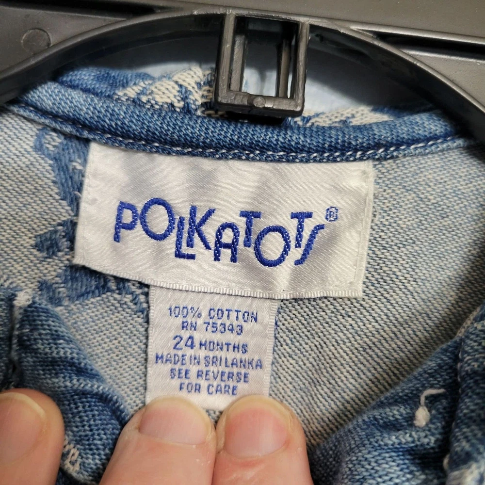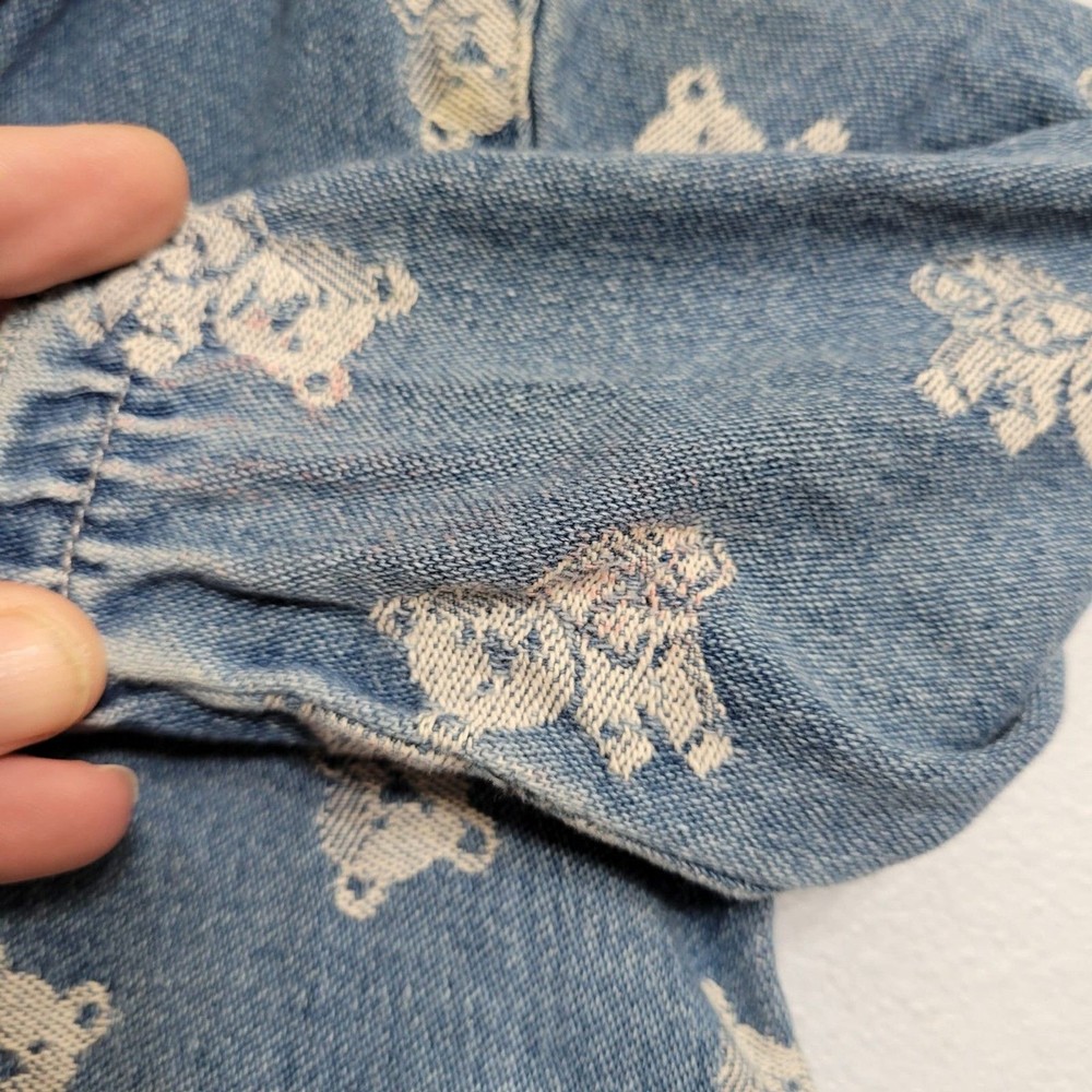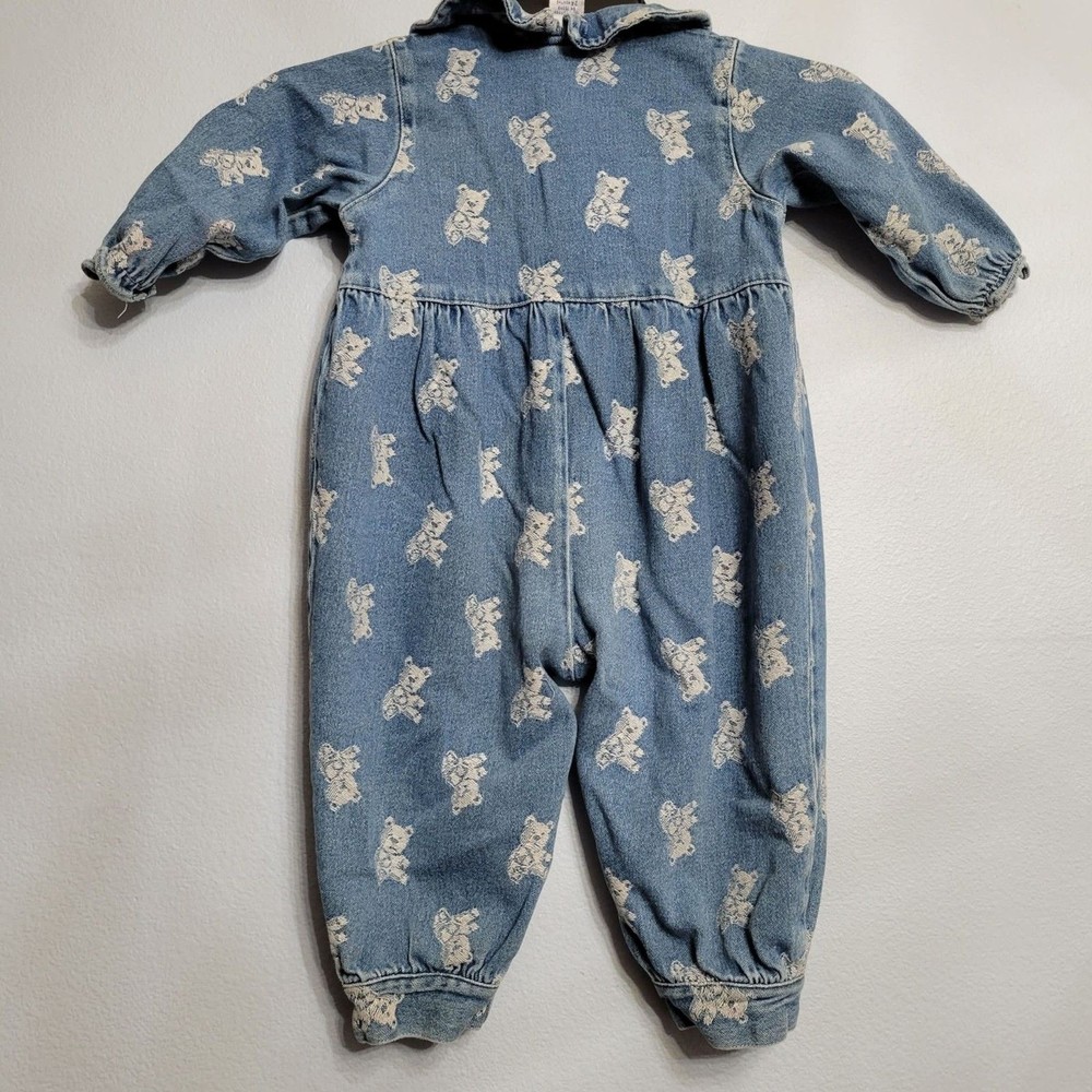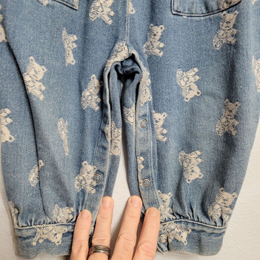 Brand : Polkatots Type: One-piece denim romper/jumpsuit for a baby. Material: 100% cotton denim, light blue wash. Pattern: All-over white teddy bear print. Sleeves: Long sleeves with elasticated cuffs. Legs: Full length with elasticated ruffled cuffs. Features: Closure: Button-down front closure with five teddy bear buttons. Pockets: Two front patch pockets at the hip area. Collar: Soft, rounded collar. Snaps: Snaps along the inner legs for easy diaper changes.