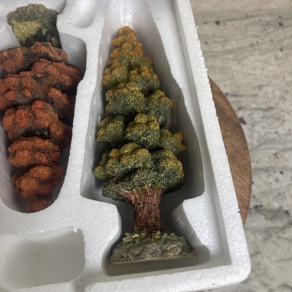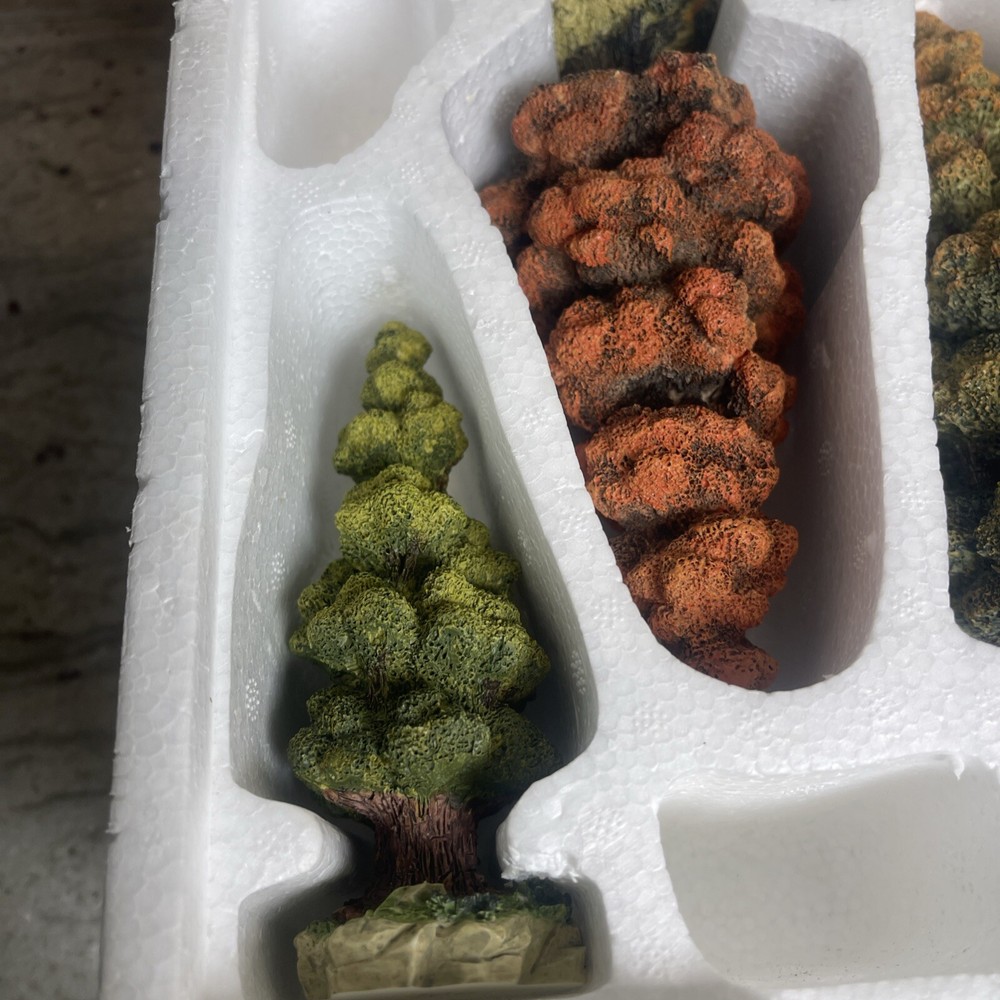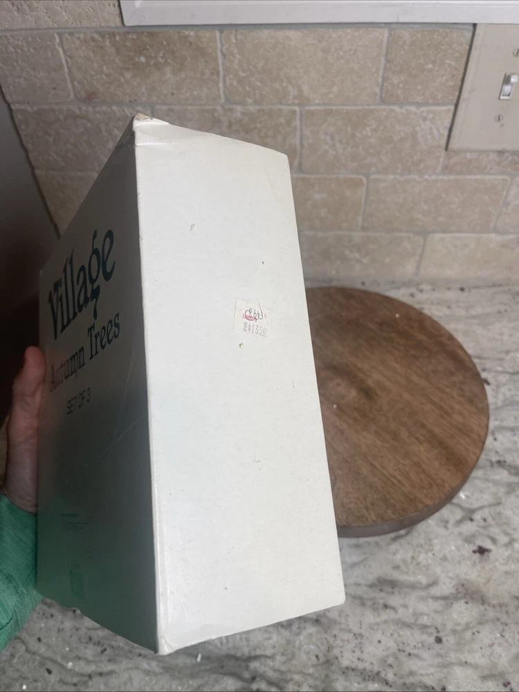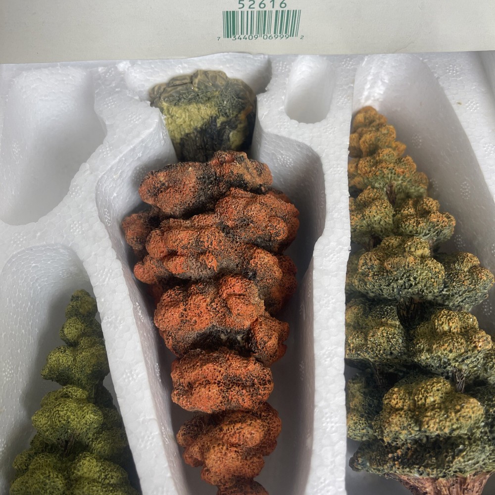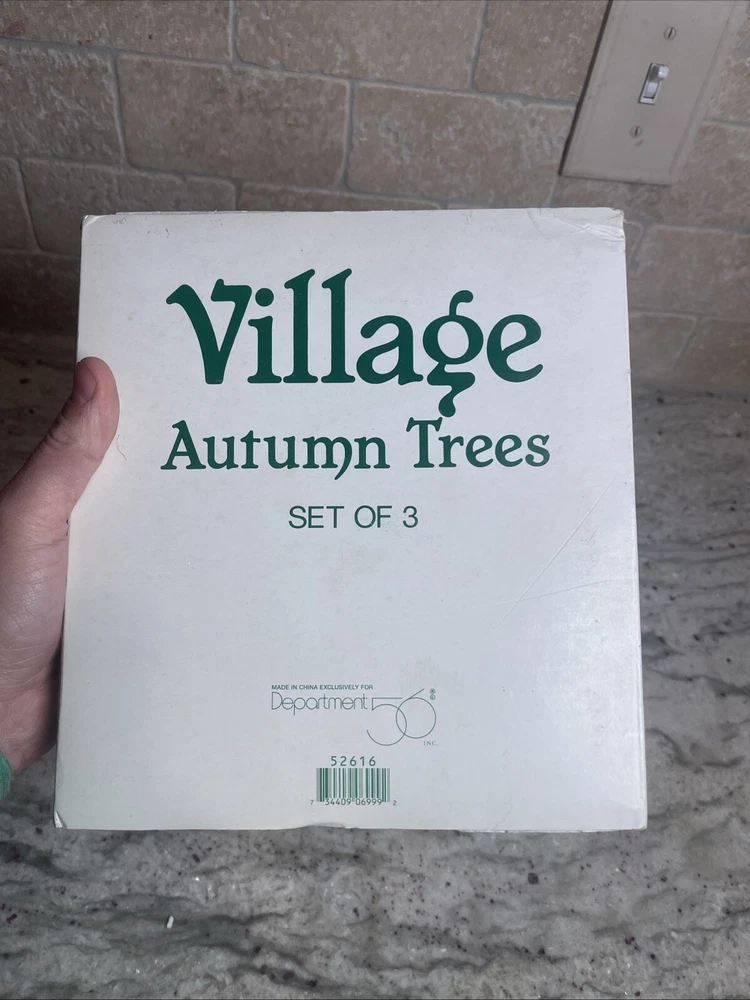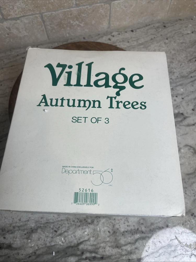 Always been stored in the original packaging Add a touch of autumn to your Christmas Village with this set of 3 Vintage Department 56 Autumn Trees. The trees come in their original box and are made of ceramic and porcelain. The multicolored trees are perfect for any room and will complement any traditional style village. The trees are an original production and feature an antique finish. They make a great addition to any collection, especially for adults who love fall-themed villages. Get your hands on this boxed set of Village Autumn Trees and create a festive display that will bring joy to your home for years to come.