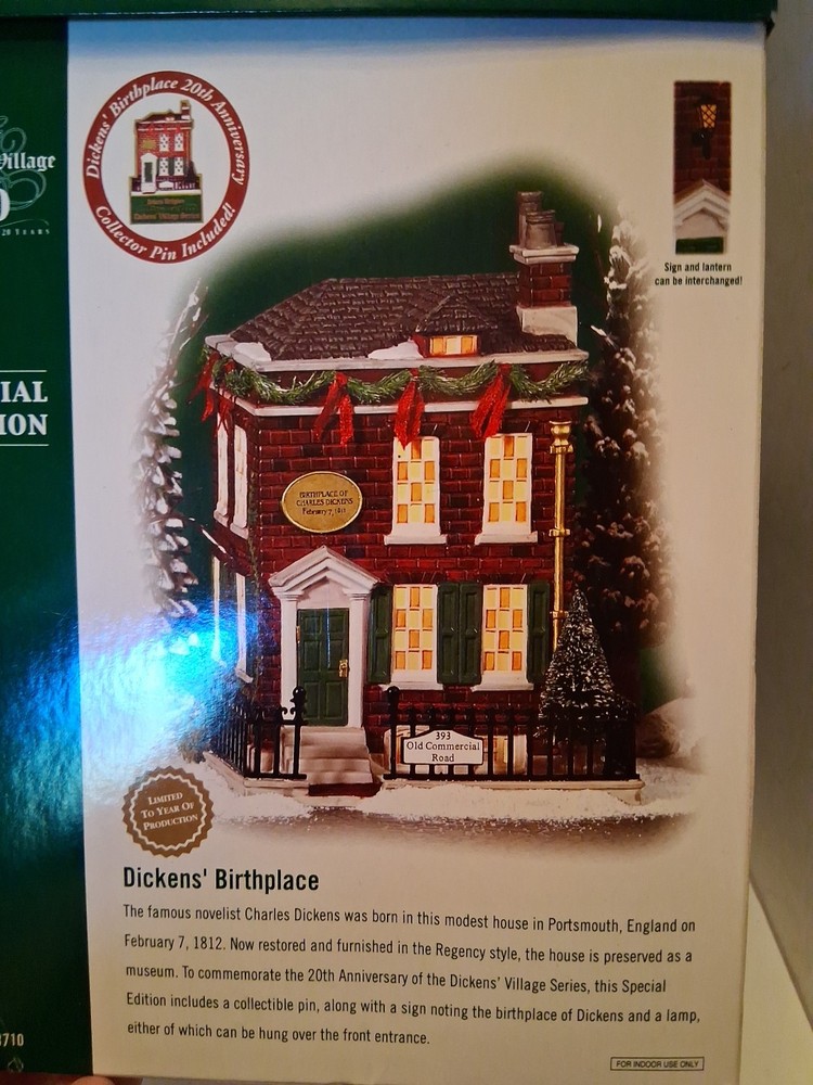 Add a touch of vintage charm to your holiday decor with this special edition Department 56 Dickens Village Building. With its asymmetrical shape and multicolor design, this porcelain piece is perfect for any room in your home. Whether you're a collector or just looking for a unique addition to your holiday display, this "Birthplace" village building is sure to impress. Pre-owned like new with original box and pin see pictures for details perfect for any dept 56 collector perfect addition to any Christmas Village display could make a great gift shipped right out USPS ground advantage Celebrate the season with this beautiful piece from the Dickens Village collection. With its intricate details and high-quality construction, it's a great investment that will bring joy for years to come. Perfect for Christmas enthusiasts who appreciate unique and timeless decorations.