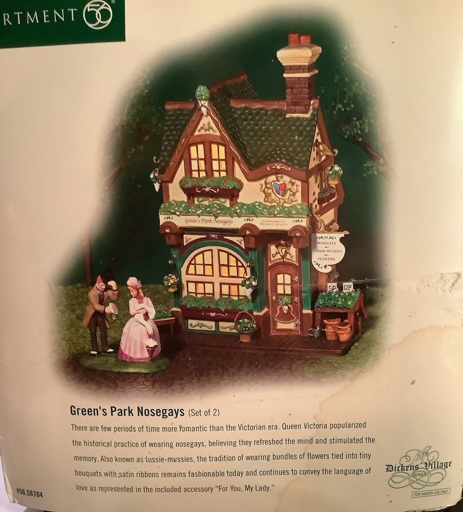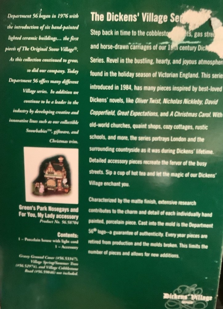 Add a touch of Victorian elegance to your holiday decor with this beautiful Department 56 porcelain house and couple figurine. The asymmetrical, hand-painted house is illuminated for a warm, inviting glow, and the matte green finish complements any room's color scheme. Perfect for furniture, this large 8.75" high and 8.25" long house weighs 2 lbs and comes in a box for safekeeping. *Missing the cord to light it up. Myself, I would just put a strand of white Christmas lights in it.* The house and couple are part of the Dickens Village collection and were manufactured in 2003, making them a licensed reproduction from the 21st century. Whether you're a collector or just looking for a stunning holiday decoration, this Department 56 piece is sure to impress.