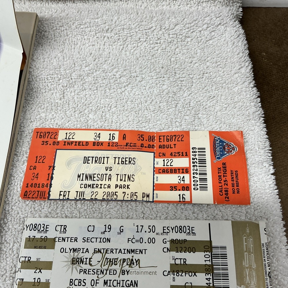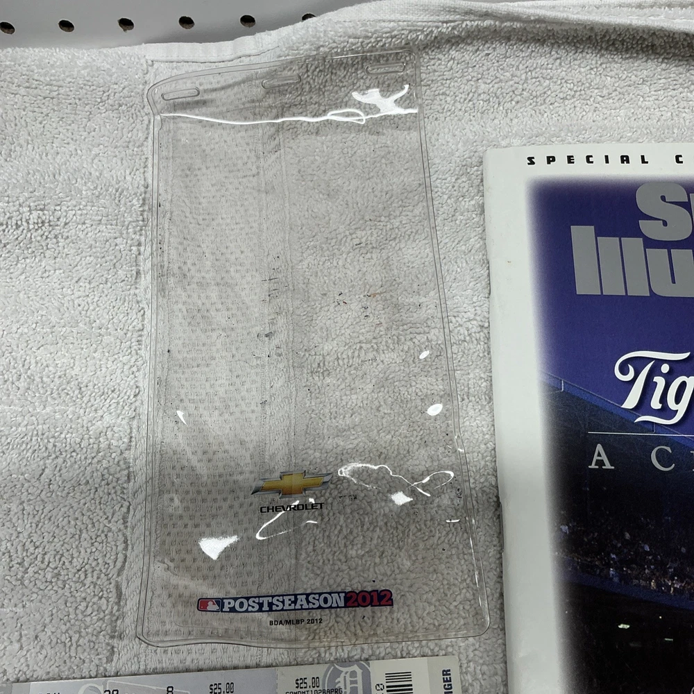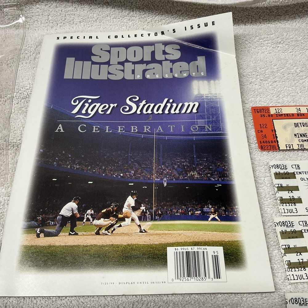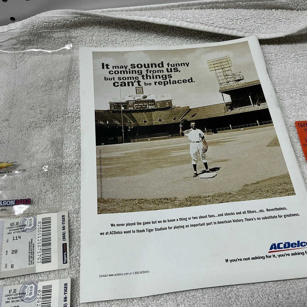 For all you Detroit Tigers fans out there, here's a wonderful piece of vintage sports memorabilia featuring your favorite team. This item includes a magazine looking at Tiger Stadium memories It's the perfect addition to any baseball fan's collection. The memorabilia from Tiger Stadium includes a ticket stub, program, and other related items. This is a must-have for any true Tigers fan and a great way to commemorate the team's storied history. Detroit Tiger rally towel. As pictured