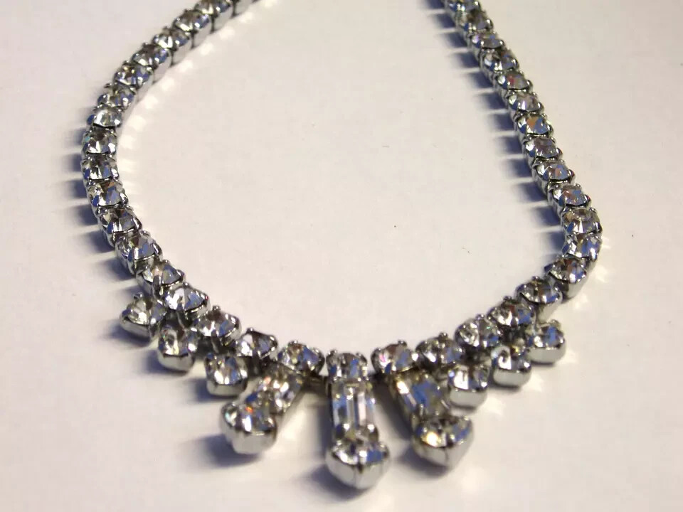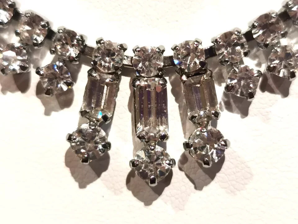 A pretty Vintage Diamante Necklet Plated base metal Circa 1950s Still as good as new. Measures 15.5" Weight 16.3 grams Complete with gift box