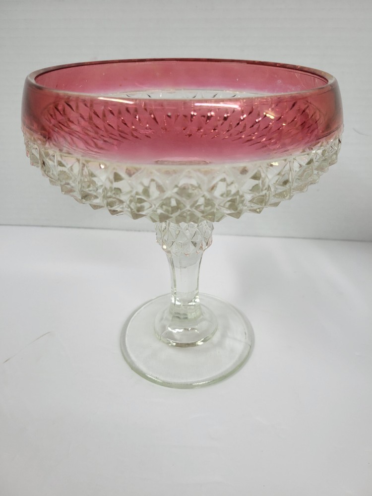 Vintage diamond point ruby edge glass candy dish. 7" tall x .5" in diameter. Very good condition. No chips, cracks or repairs. Item will ship within one business day of completed sale. I DO NOT ship media mail. All items will be securely packaged and will ship USPS Ground Advantage, Priority mail, UPS or Fedex depending on weight and size. I do offer a 30-day money back guarantee on almost every item I sell. If there are issues with your item, please return it for a refund. Refund will be issued upon return of item. Some restrictions may apply. It is always appreciated if you contact me before starting a return so that I can try and assist without the hassle of a return.