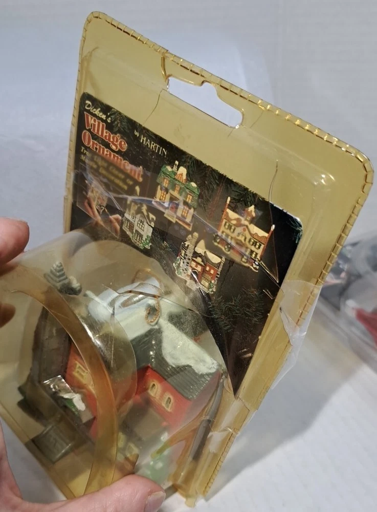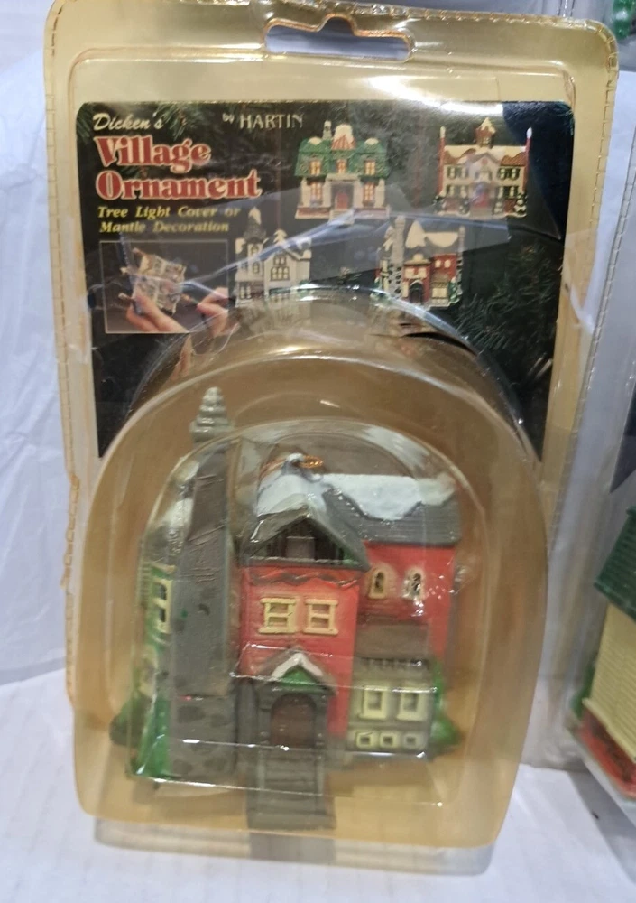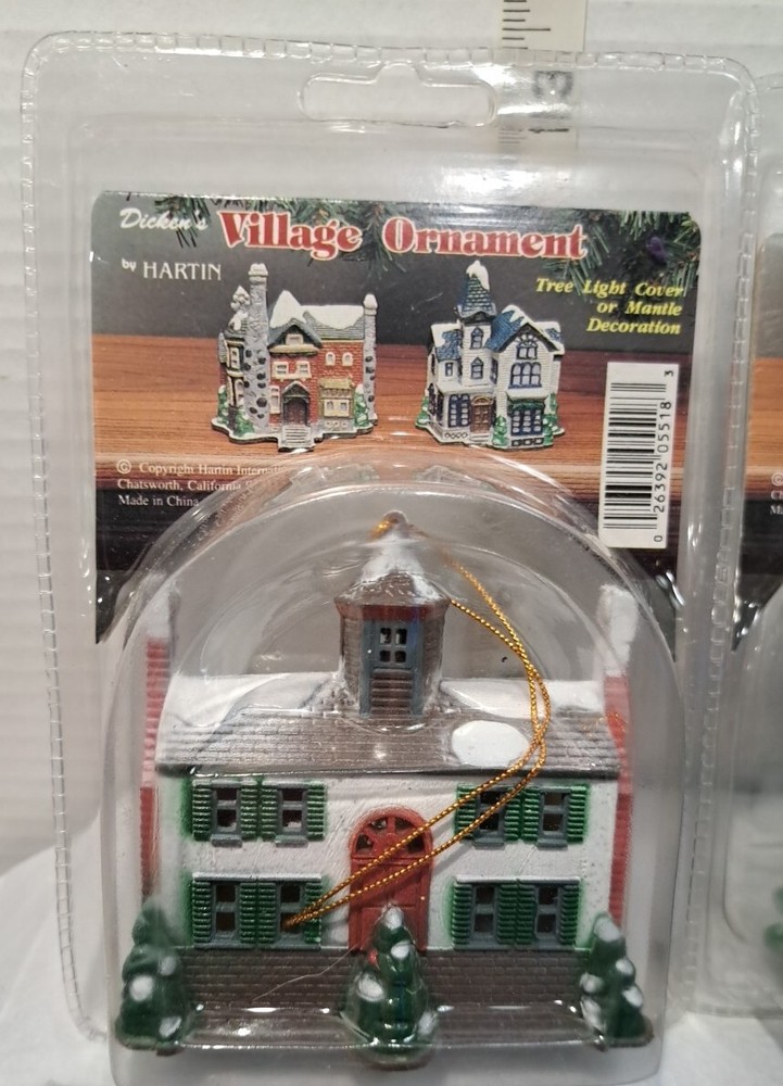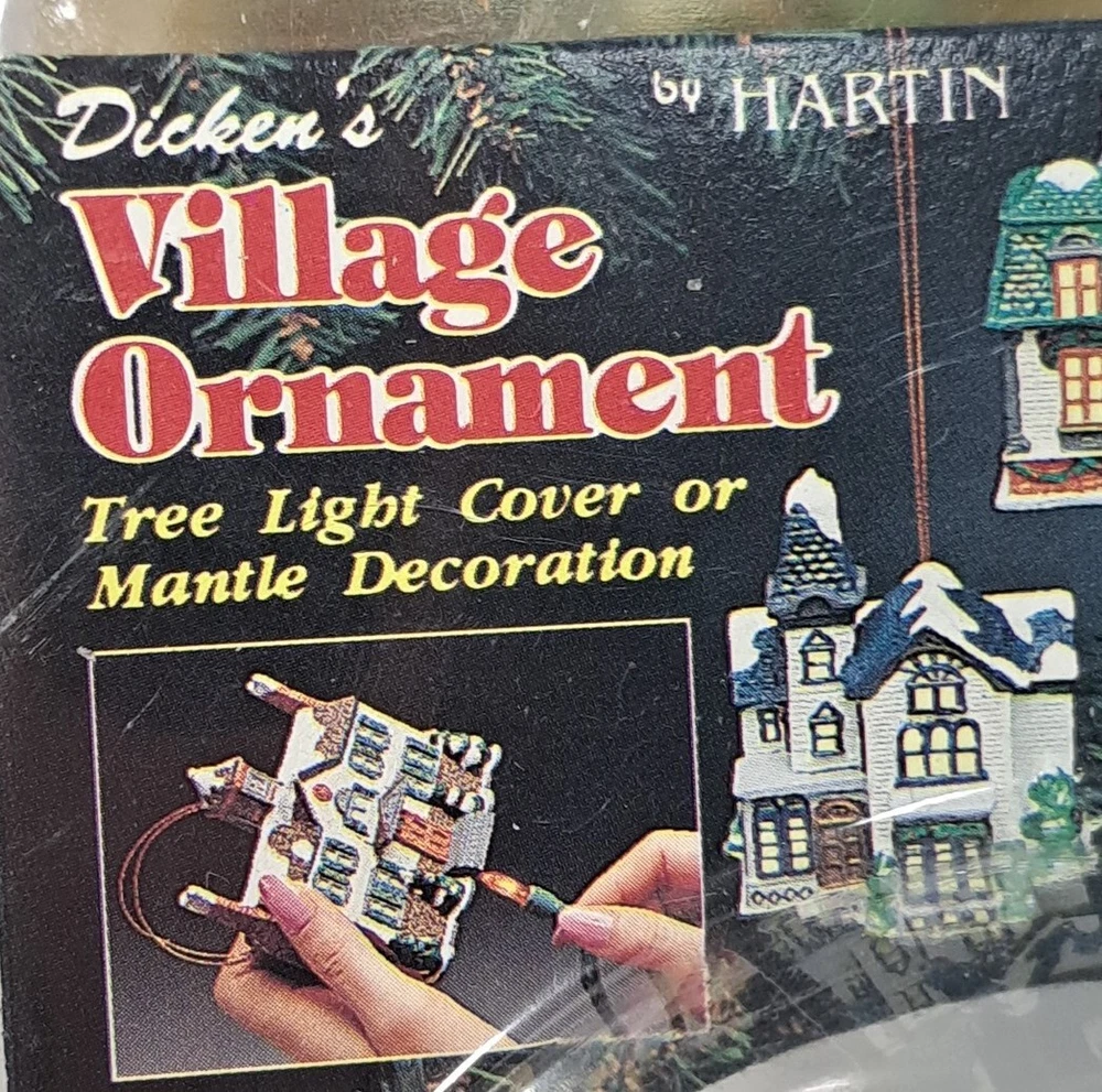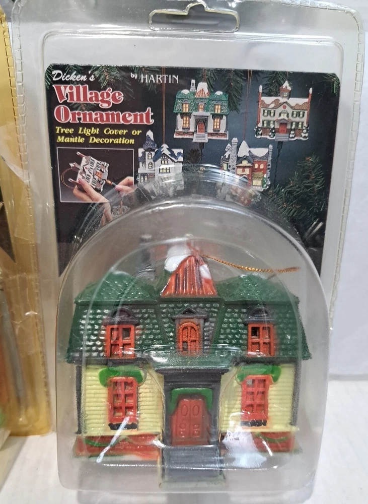 Vintage Tree Light Cover Hartin Dickens Village House Christmas Ornament 4pc set - Included in this set is houses 1 through 4 See photos for measurements These are vintage new House number 1's packaging has a little yellowing and a few cracks/splits but the house is unaffected House number 4's packaging has yellowed and became brittle with age so there is tape on this ones packaging as there is several cracks/splits in the packaging - the house inside the packaging appears to be just fine. Please see photos Please view all photos zooming in on them as they are part of the description for you to judge conditi