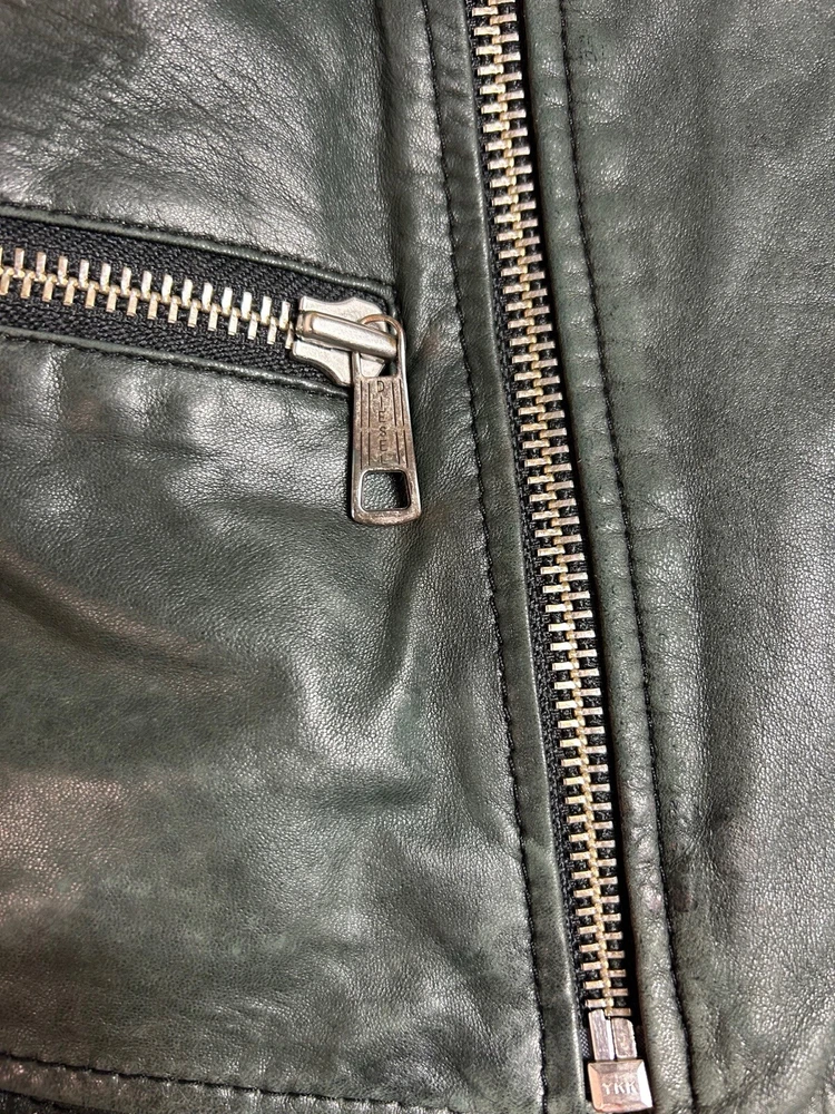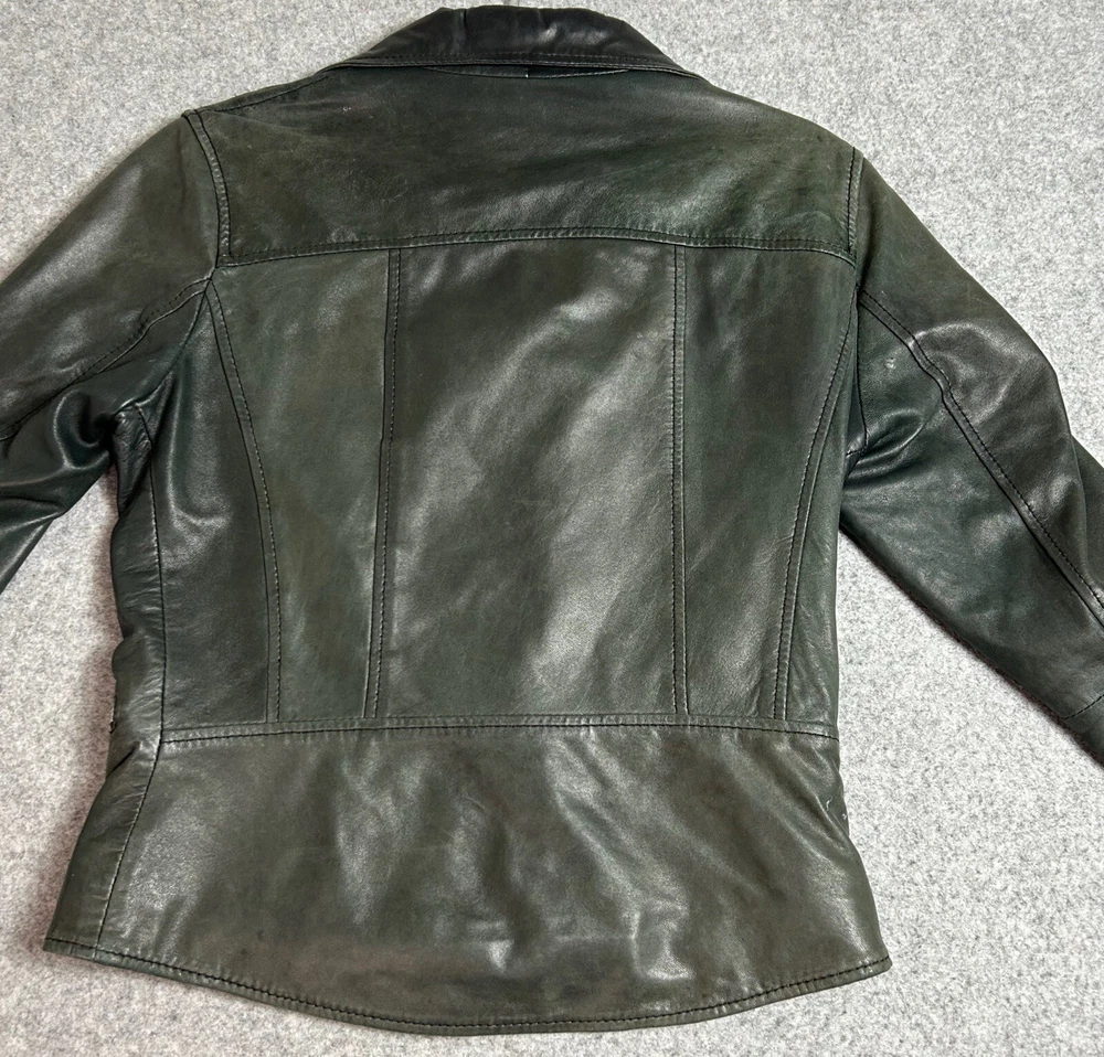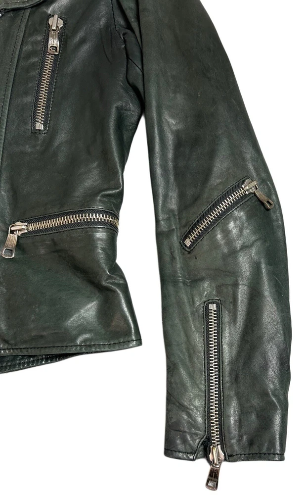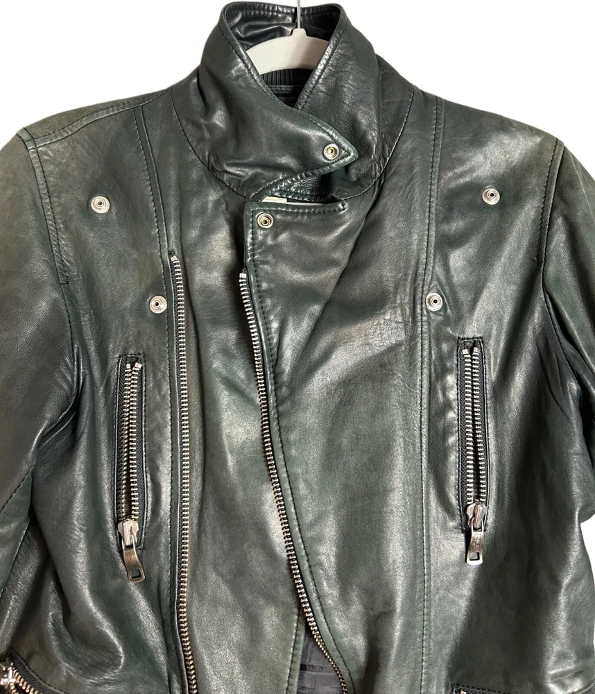 Vintage Women Diesel zipped Moto jacket. Size M Measurements have been provided in the photos. Lamb skin leather Made in Turkey Color: Black The leather on the jacket shows common vintage wear. Some areas of the leather look faded in color. Flaws: Few white stains. ( I have provided pictures ) 2 small spots where the leather has peeled. ( I have provided pictures ) 1 small tear on the sleeve ( I have provided pictures )