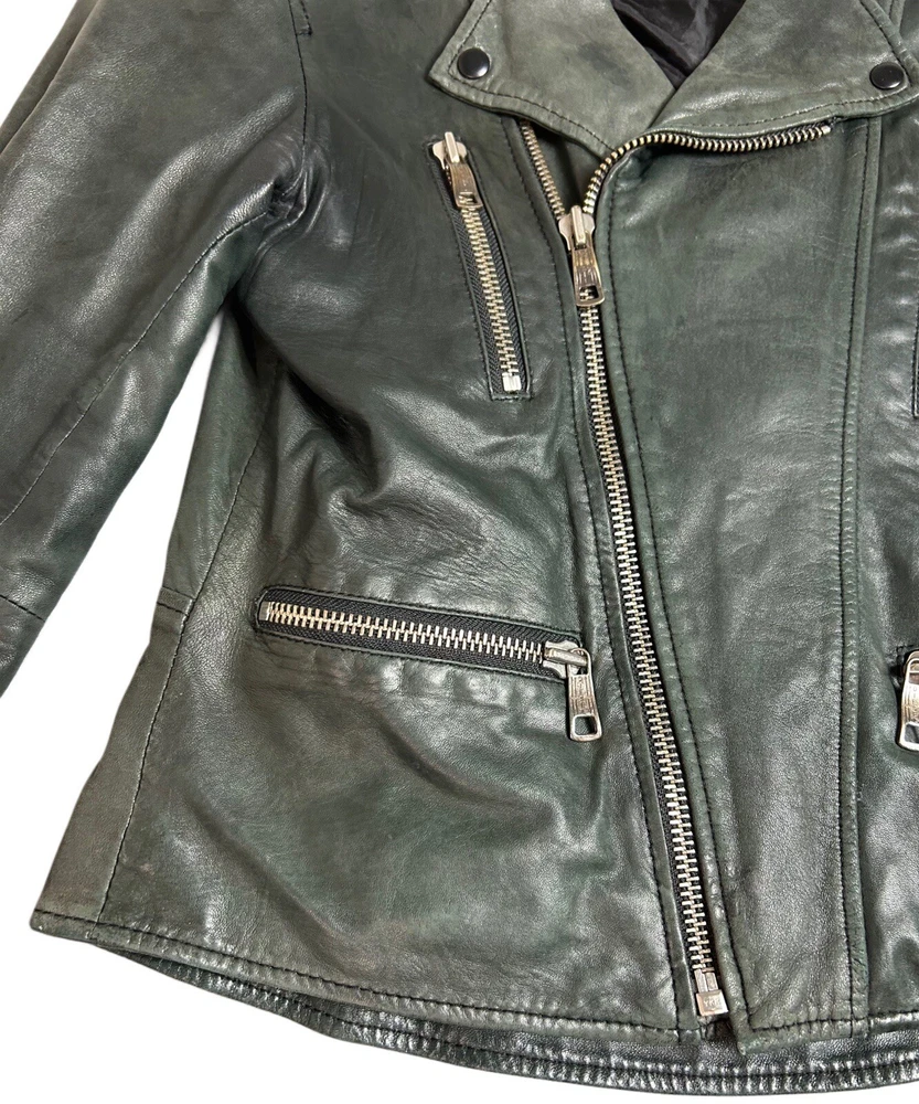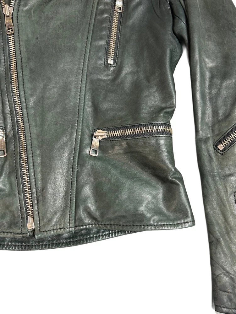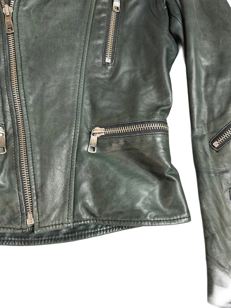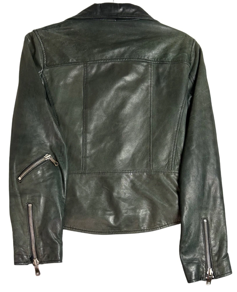 Vintage Women Diesel zipped Moto jacket. Size M Measurements have been provided in the photos. Lamb skin leather Made in Turkey Color: Black The leather on the jacket shows common vintage wear. Some areas of the leather look faded in color. Flaws: Few white stains. ( I have provided pictures ) 2 small spots where the leather has peeled. ( I have provided pictures ) 1 small tear on the sleeve ( I have provided pictures )