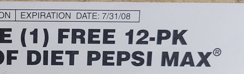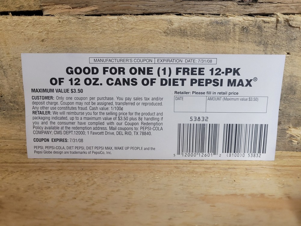Diet Pepsi Max vintage Coupon (12-Pack, expired coupon) Item specifics: The ever-popular Diet Pepsi Max! This expired coupon is not eligible to be redeemed for product. What make it more unique is it's expiration date. July 31st 2008. Concurrently on Harry Potter's birthday. Will be sealed in a waterproof bag and shipped between cardboard to protect the integrity. Here at Midwest Impact we prioritize 3 things above all else: God, family, and moving forward. Know that your purchase is an invest in my small business, and more importantly will directly impact the midwest through outdoor recreational sports and activities. Why $3 shipping? In order to keep our prices competitive, we've had to add this. We use base point pricing to remain upfront and clear with our pricing. Every MW Impact package Includes: The purchased product, a clean polypropylene sealed bag, AND a free custom 5.56 NATO custom or .223 REM wrist band. It will be included as a thank-you for your business. Positive feedback is always appreciated and encouraged. If you would like to see any other products listed, reach out and we will work with our suppliers. Contact US We can be contacted at any time through eBay messaging if you have any questions, comments, or product requests. We will respond to you within 24 hours and will do our best to resolve any questions or concerns. Payment Expected at the time of purchase in full. Will accept PayPal directly also for additional discounts. Shipping Know that your purchase will be shipped within 24 hours of payment. Disclaimer All sales final. Agreeing to purchase waives the right to return. Feedback is always appreciated as a small business owner.